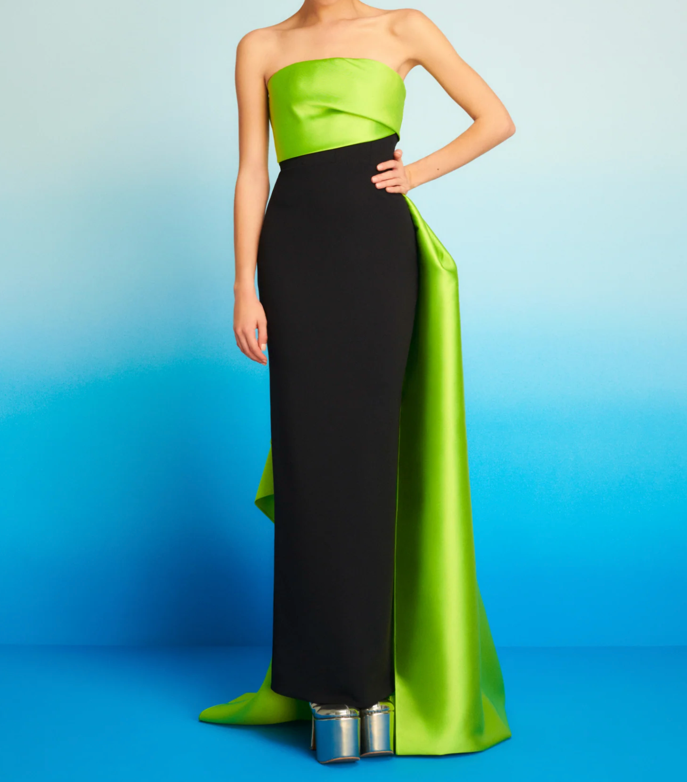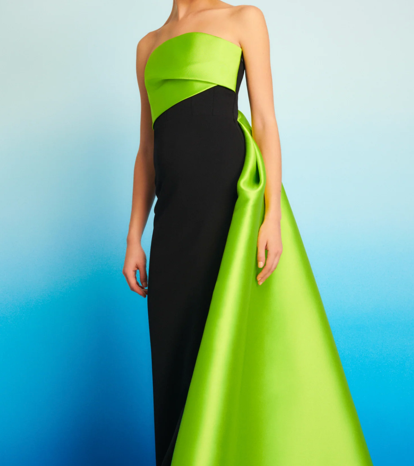 فستان سهرة جريء بدون حمالات، يتميز بصدرية ساتان خضراء ليمونية جذابة، تتباين مع تنورة سوداء أنيقة. يُضفي التصميم الجانبي المنحوت لمسةً انسيابيةً أنيقةً على الفستان، وينبض بالأناقة. قطعة عصرية مميزة، صُممت خصيصاً للنساء اللواتي يعشقن الأناقة الفنية المستوحاة من منصات العرض.