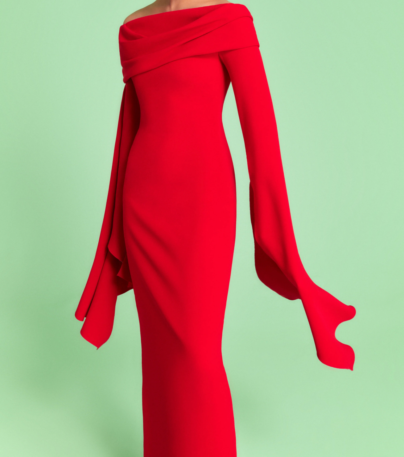 فستان عمودي مكشوف الكتفين بأكمام انسيابية – سكارليتا