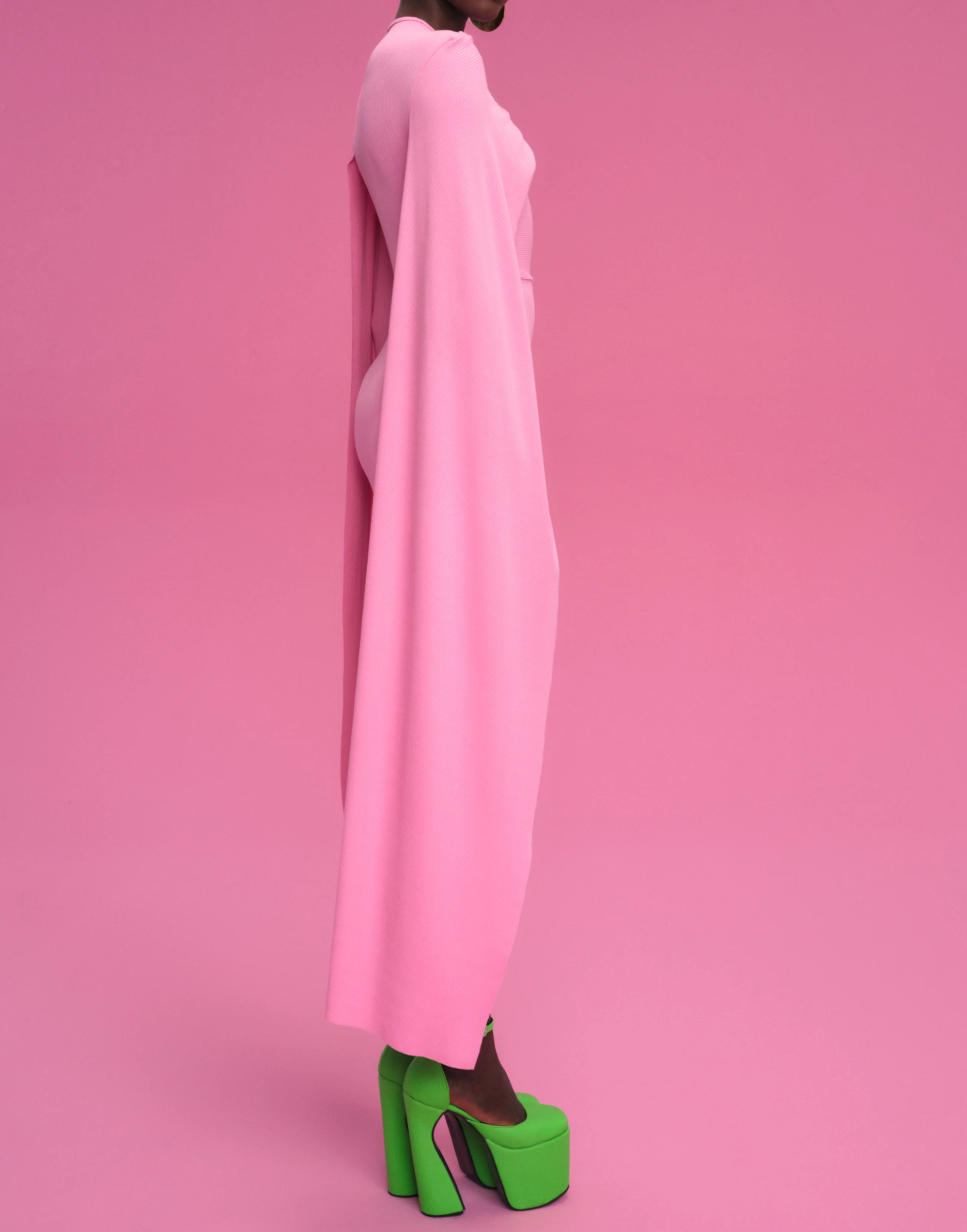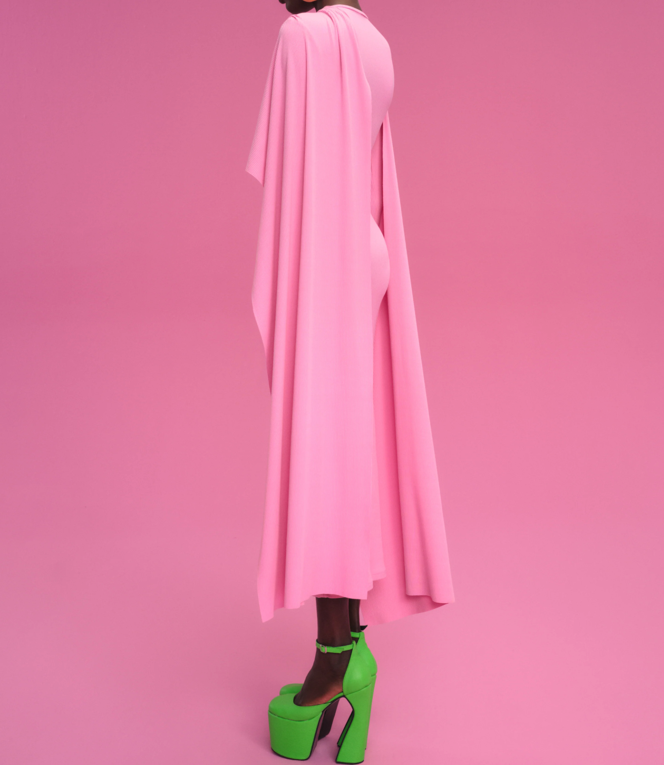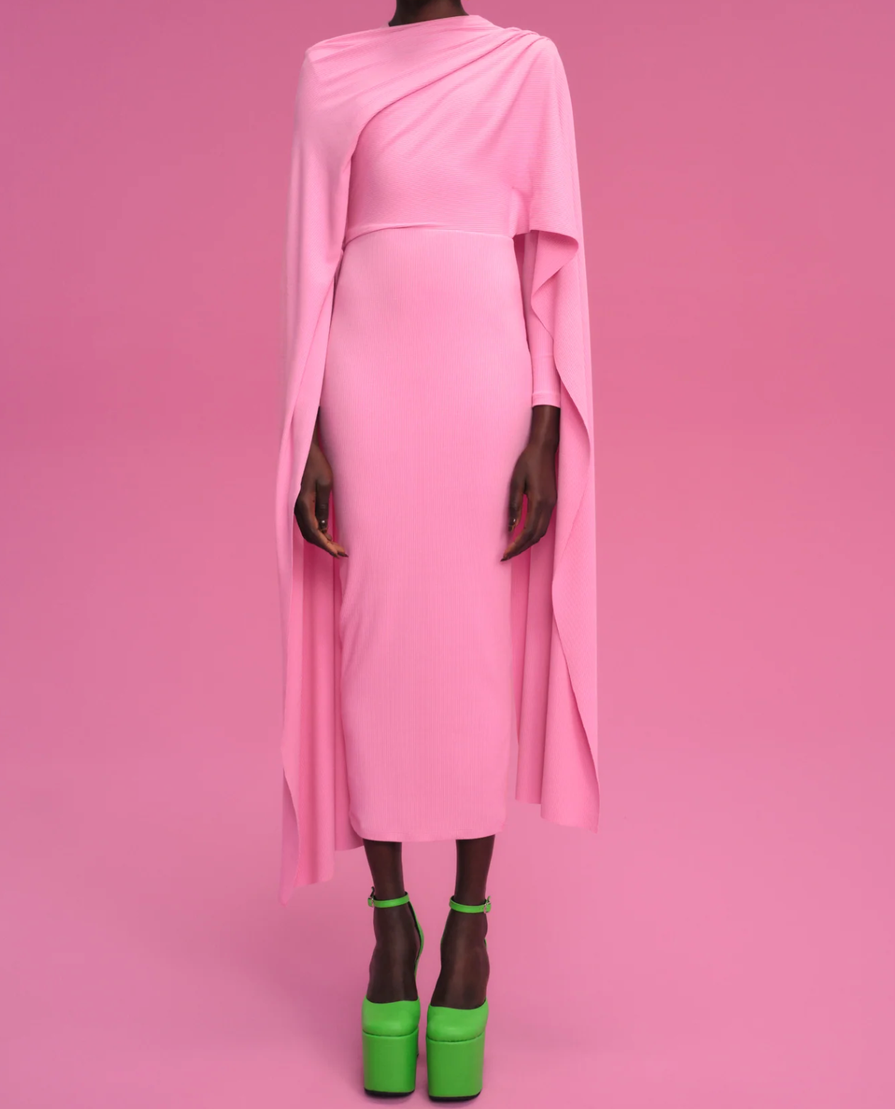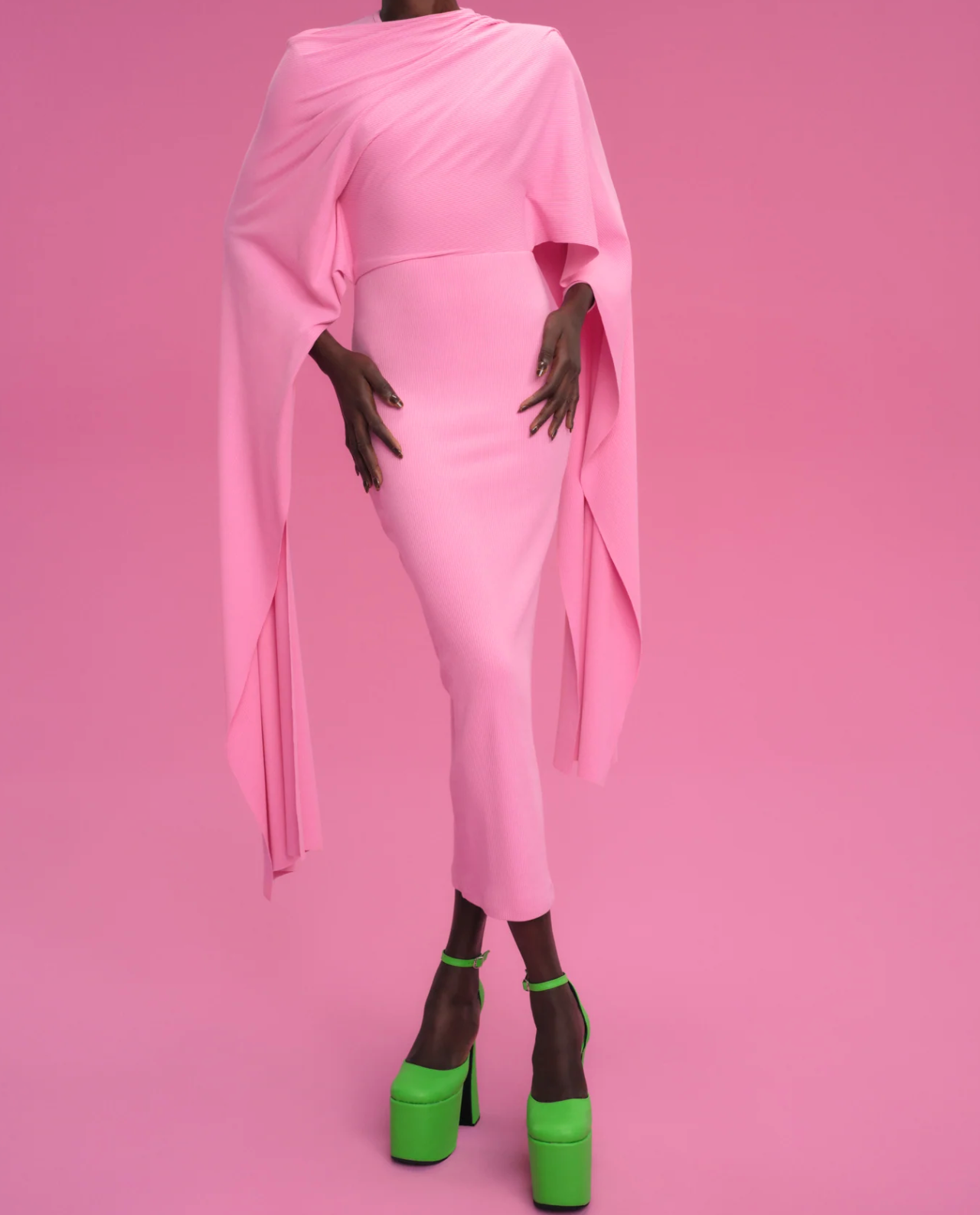 فستان ميدي وردي ناعم، يتميز بفتحة رقبة أنيقة غير متماثلة، ويمتد على شكل أكمام طويلة على شكل عباءة، لإطلالة عصرية وانسيابية. تنورته الضيقة تُبرز قوامه بخطوط أنيقة ودقيقة، مُوازنةً بين الرقي والأناقة العصرية. مثالي للمناسبات الأنيقة والسهرات المميزة.