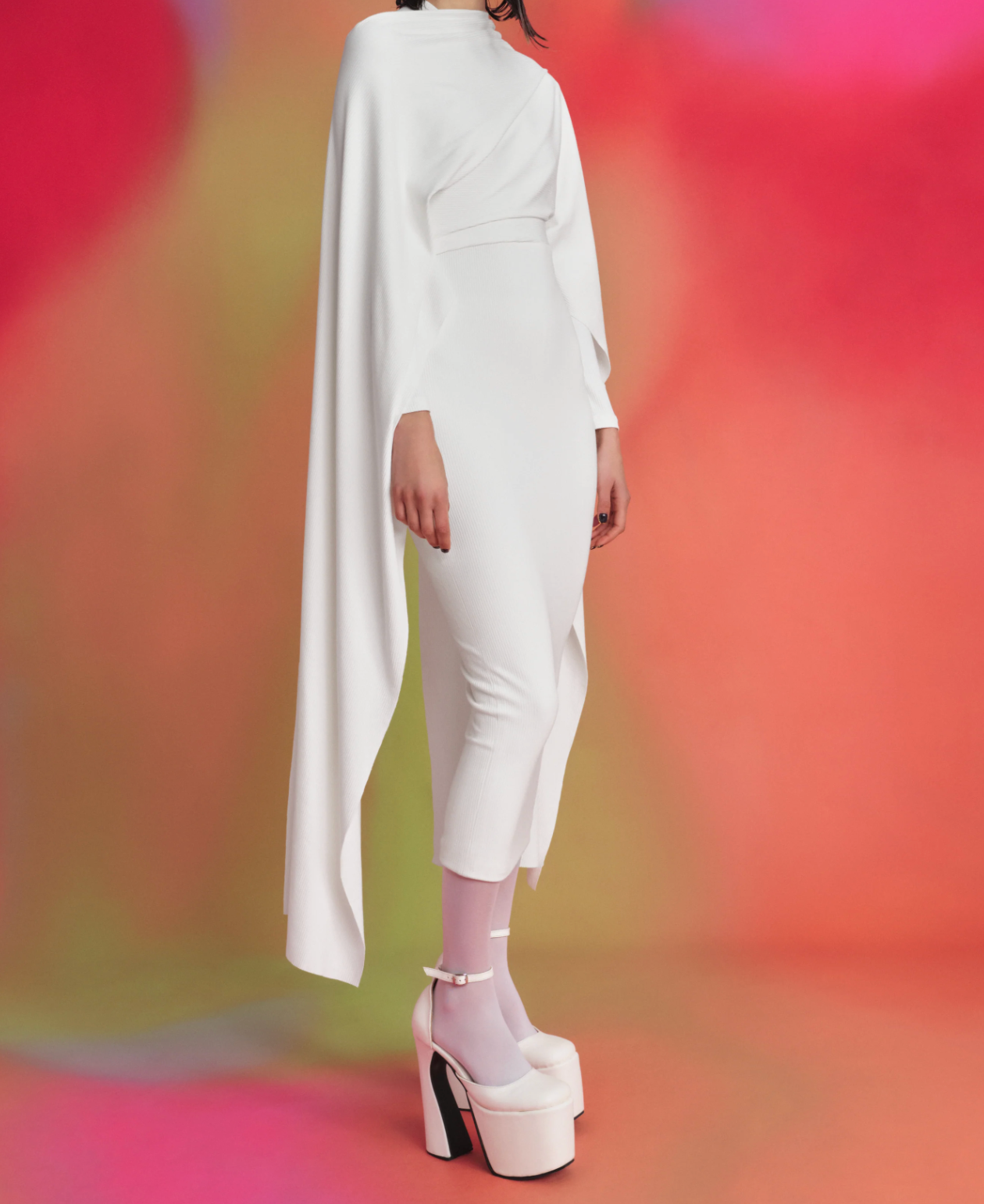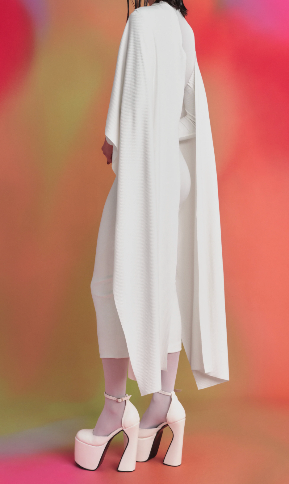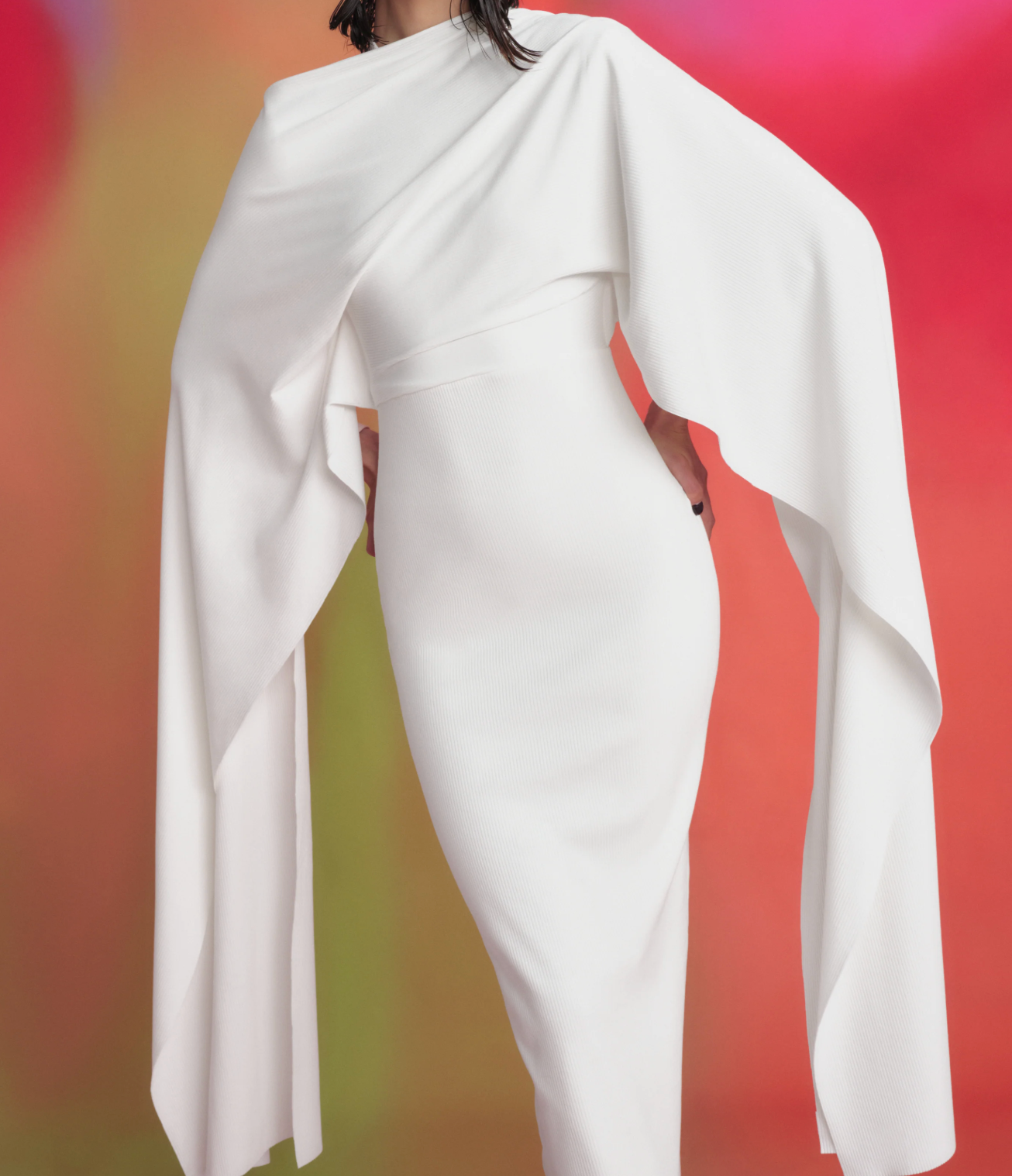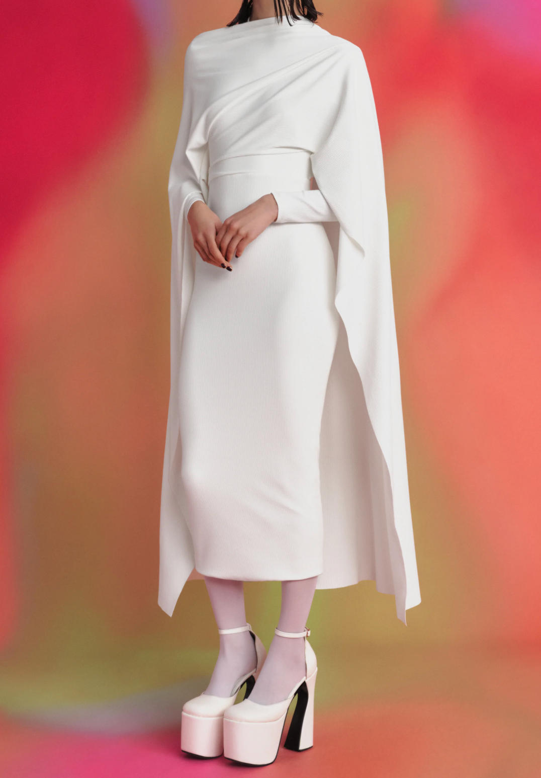فستان ميدي وردي ناعم، يتميز بفتحة رقبة أنيقة غير متماثلة، ويمتد على شكل أكمام طويلة على شكل عباءة، لإطلالة عصرية وانسيابية. تنورته الضيقة تُبرز قوامه بخطوط أنيقة ودقيقة، مُوازنةً بين الرقي والأناقة العصرية. مثالي للمناسبات الأنيقة والسهرات المميزة.