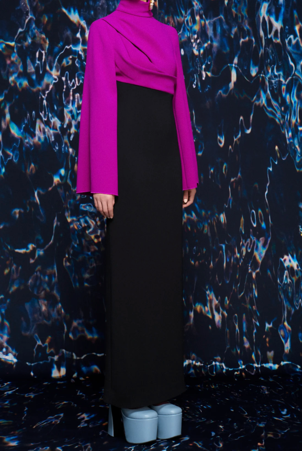 فستان أنيق باللونين الأبيض والأسود، يتميز بياقة عالية أنيقة، وتطريز قطري ناعم على الصدر، وأكمام واسعة. تصميمه الأنيق المتباين ينحت قوامك بأسلوب عصري بسيط، ليمنحك إطلالة راقية خالدة، مثالية للأمسيات الرسمية والمناسبات الراقية.