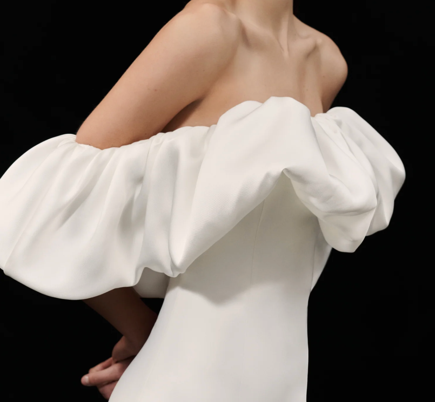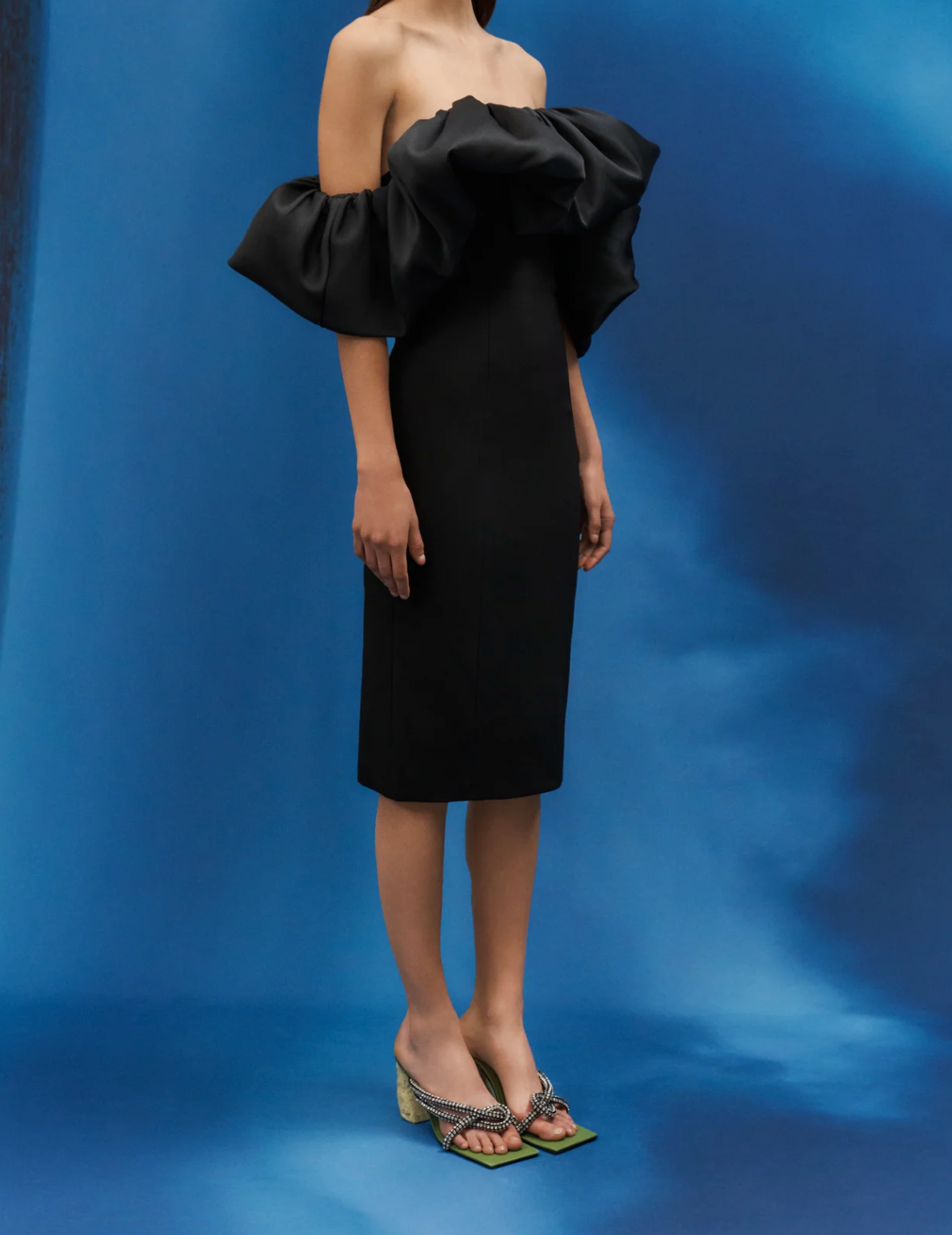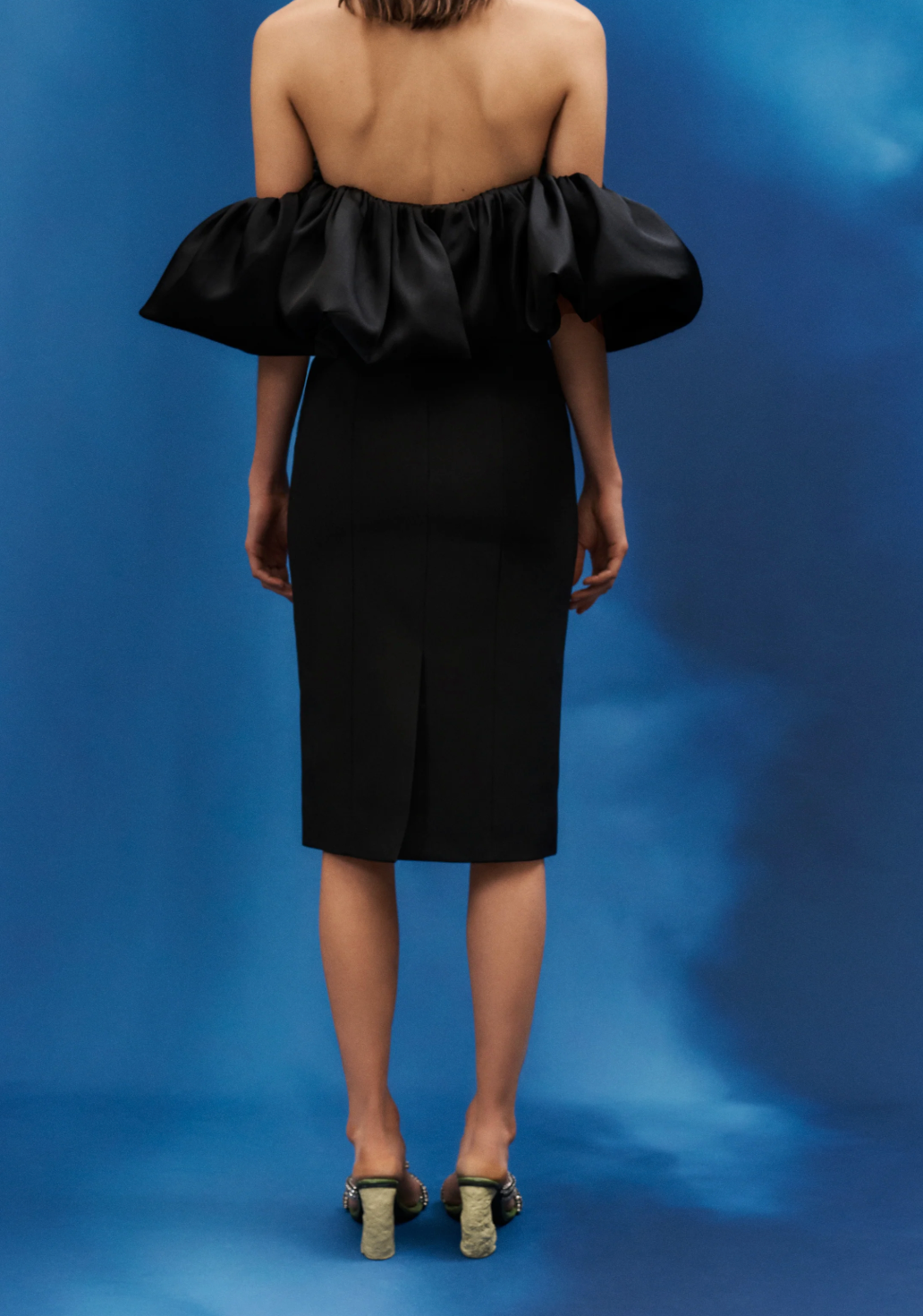 فستان ميدي جريء بدون حمالات، مصنوع من أسود داكن، يتميز بكشكشة منحوتة أنيقة تُحيط بالرقبة بلمسة عصرية أنيقة. يتناقض تصميمه الأنيق والضيق بشكل رائع مع الجزء العلوي الواسع، ليمنحكِ إطلالة مسائية عصرية آسرة تخطف الأنظار بأناقة وعفوية.