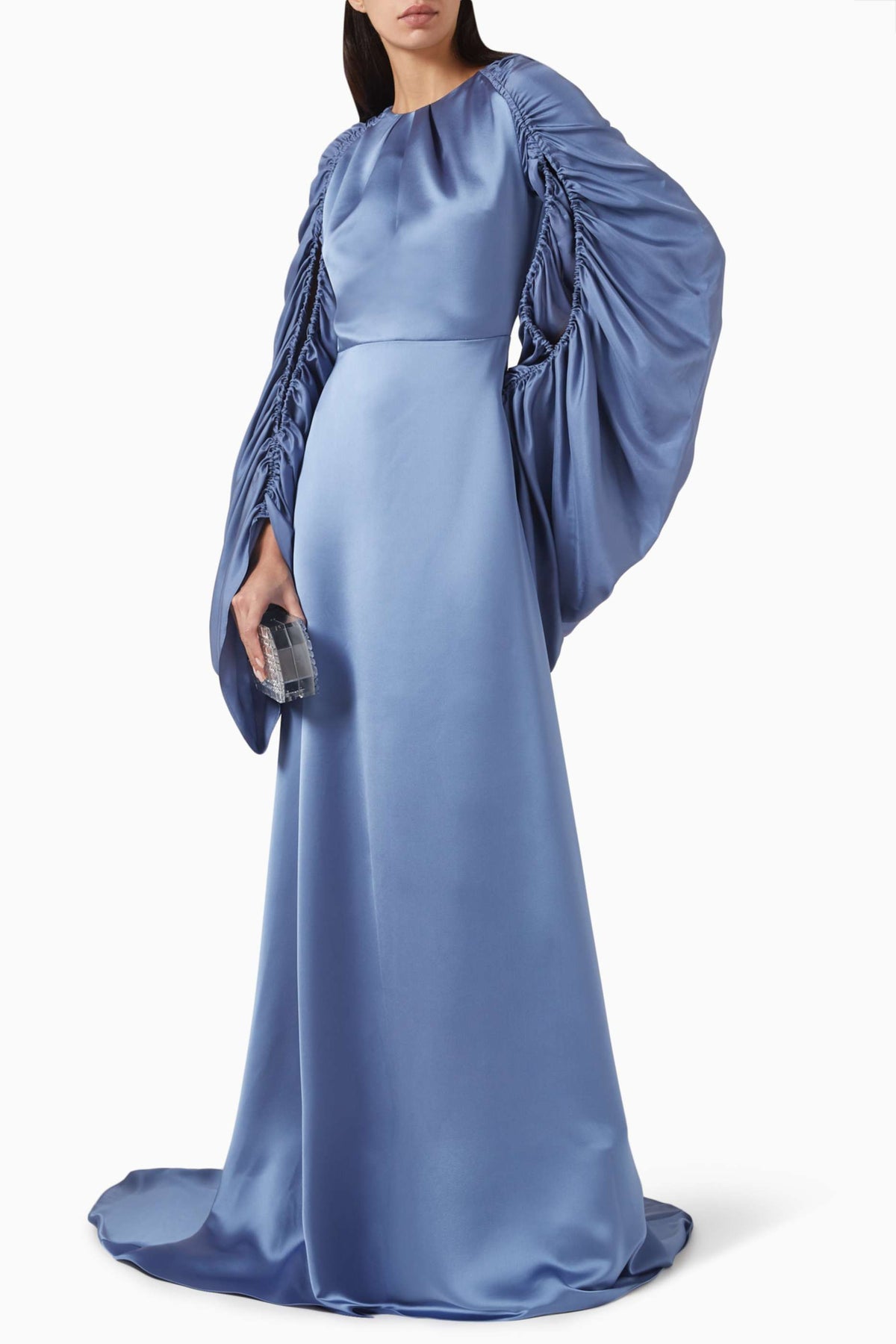 فستان فاخر من الساتان بلون أزرق سماوي ناعم، يتميز بأكمامه المكشكشة الرائعة التي تنسدل بأناقة على الذراعين. يضفي التصميم الانسيابي البسيط مزيدًا من السحر والرقي، بينما تضيف التفاصيل المكشكشة حركةً وجمالًا أخاذًا. قطعة مميزة للمناسبات المسائية حيث يلتقي الرقي بالذوق الفني الرفيع.