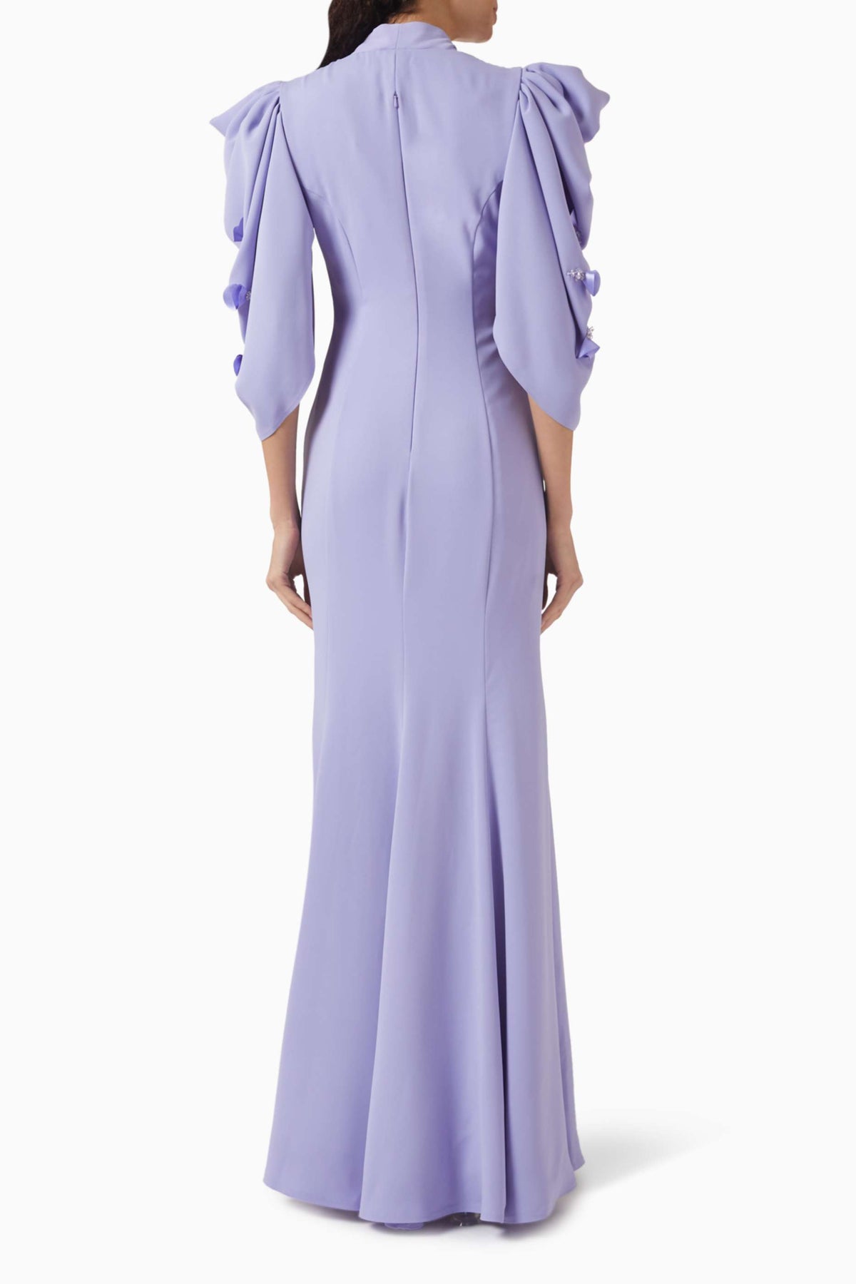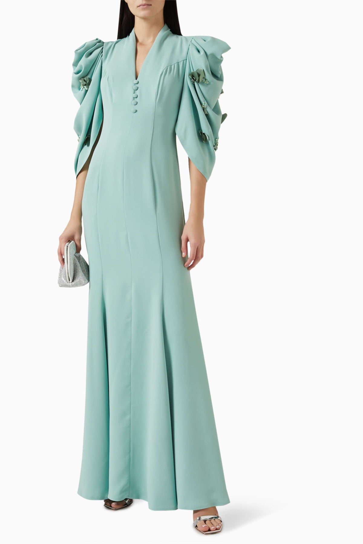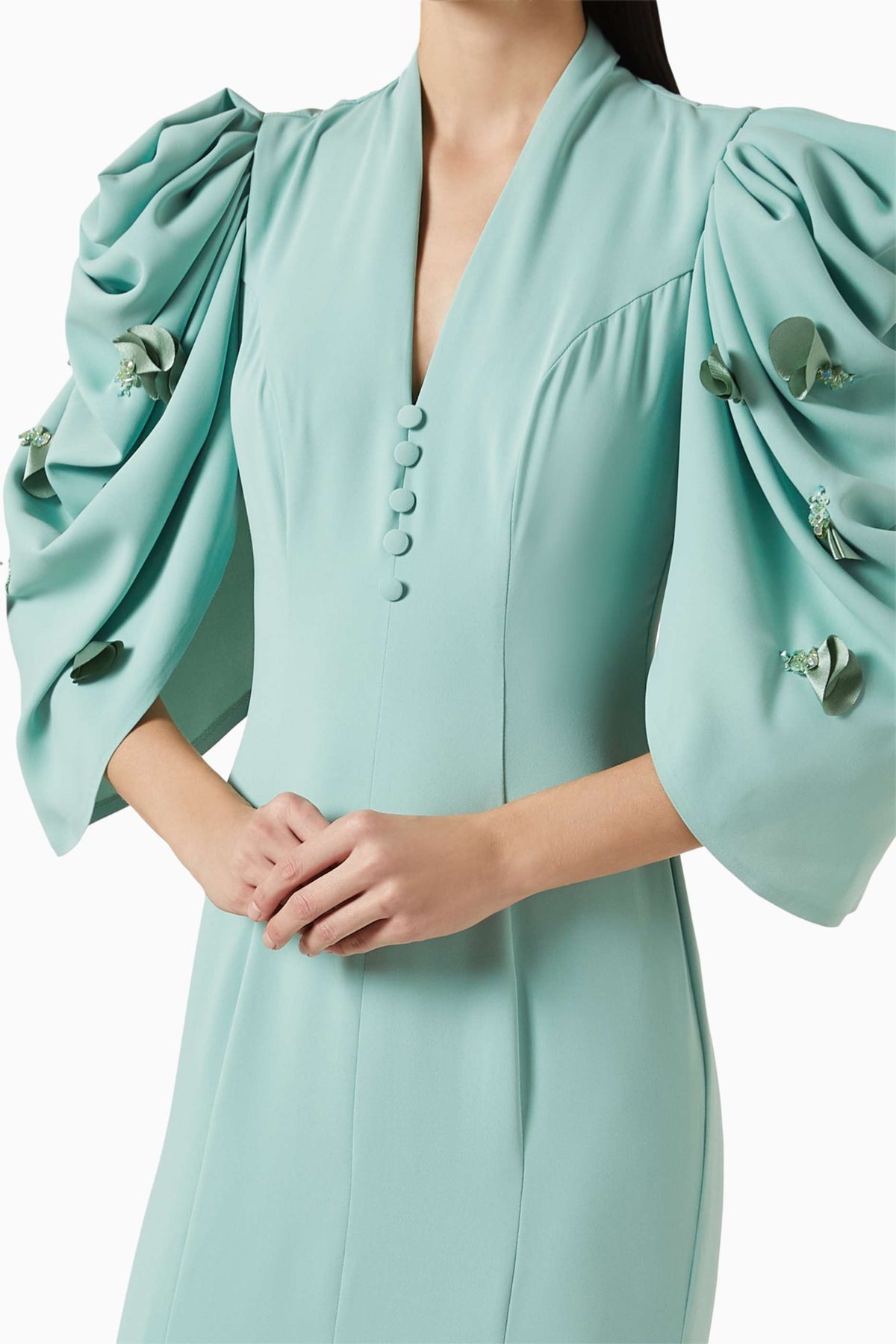 فستان أنيق وانسيابي بلون النعناع الهادئ، مصمم بأكمام منحوتة تخطف الأنفاس وتضفي عليه حجماً وحركةً رائعة. تزين تطريزات دقيقة طيات الأكمام المنسدلة، مضيفةً لمسة من البريق الراقي. يعزز خط العنق على شكل حرف V الناعم وقصة الفستان الانسيابية على شكل حرف A من رقة الفستان وجماله، مما يجعله مثالياً للمناسبات المسائية الراقية.