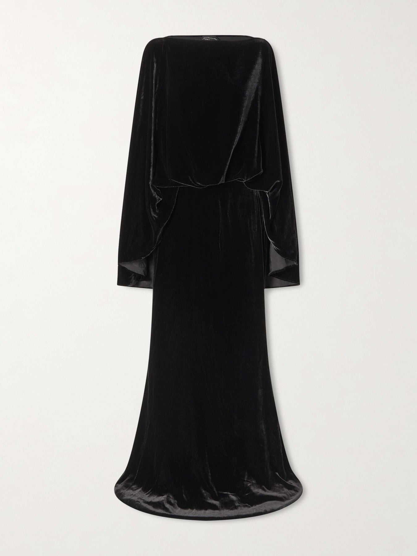 فستان أسود مخملي ساحر، يتميز بعباءة انسيابية تنسدل بانسيابية على الكتفين لتمنحكِ إطلالة أنيقة وجذابة. يحتضن المخمل الناعم الجسم برقة وفخامة، بينما تضفي أكمام العباءة الطويلة حركةً وحضورًا مميزًا. قطعة مسائية خالدة تُشعّ بالفخامة والجاذبية الهادئة.