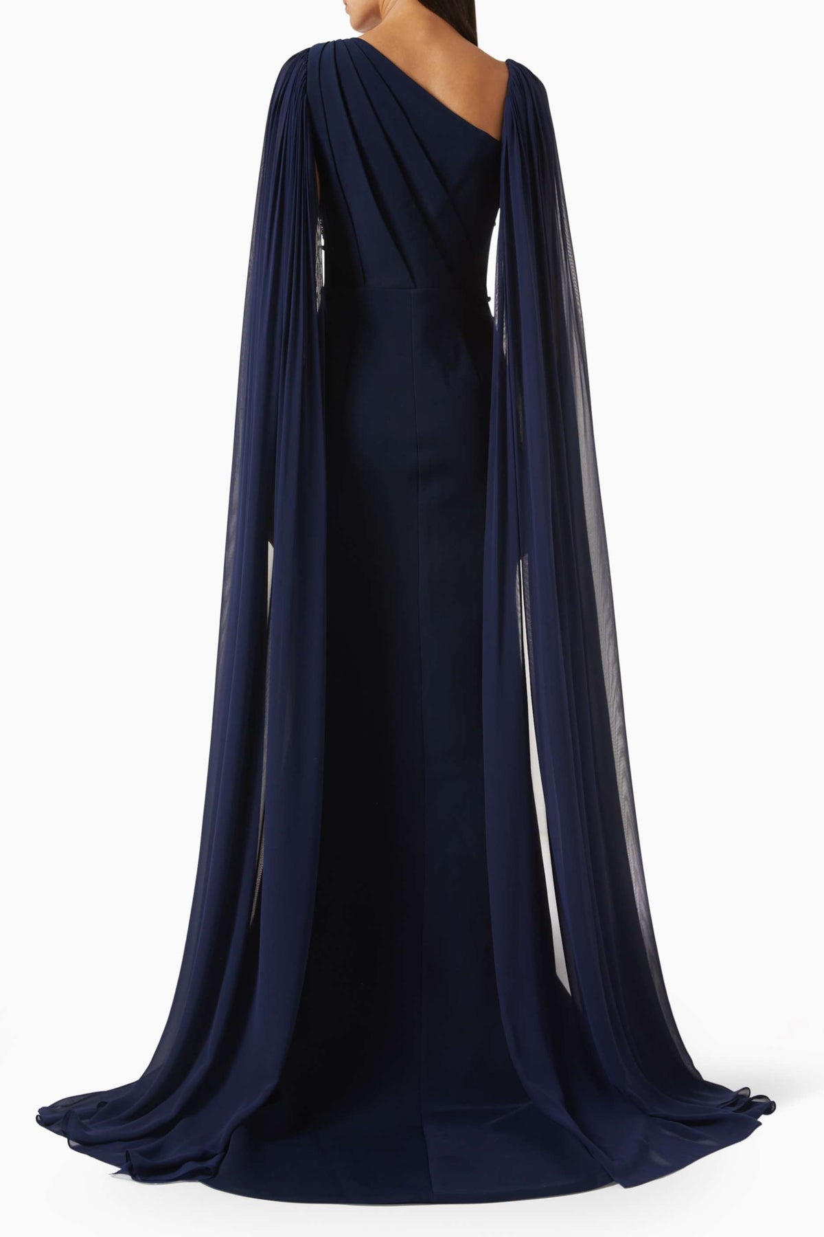 فستان أزرق داكن بكتف واحد، مُزيّن بتطريزات كريستالية متلألئة تُشبه الأمواج، تُبرز جمال الصدر والخصر. أكمام من الشيفون تنسدل بأناقة حتى الأرض، تُضفي حركةً ساحرةً ولمسة ملكية. قطعةٌ رائعةٌ تُناسب حفلات السهرة والاحتفالات التي لا تُنسى.