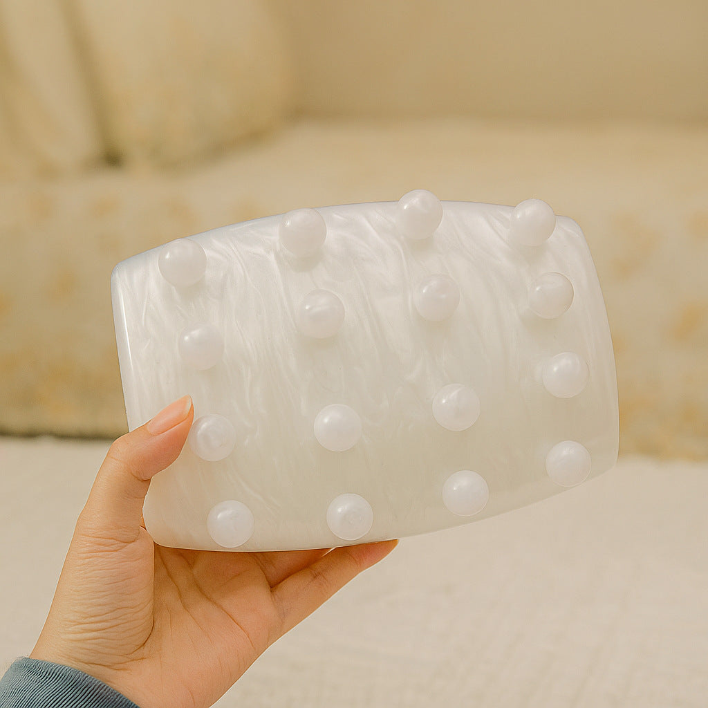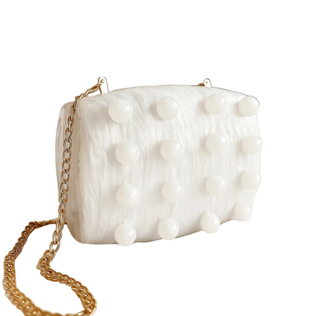 حقيبة يد أنيقة بتصميم صندوقي، مصنوعة من قماش عاجي ناعم ومزينة بدقة بتفاصيل لؤلؤية بارزة. تكتمل أناقتها بحزام سلسلة ذهبي اللون، مما يضفي لمسة راقية وأنثوية على إطلالات السهرة، وحفلات الزفاف، والمناسبات الخاصة.