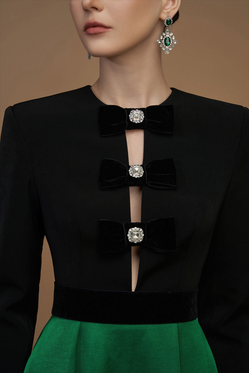 فستان أنيق باللونين الأسود والأخضر الزمردي، يتميز بصدرية مخملية أنيقة مع لمسات من فيونكة مرصعة بالجواهر وتنورة ساتان انسيابية. يضفي تباين الأقمشة والألوان سحرًا ملكيًا وأناقة راقية خالدة.