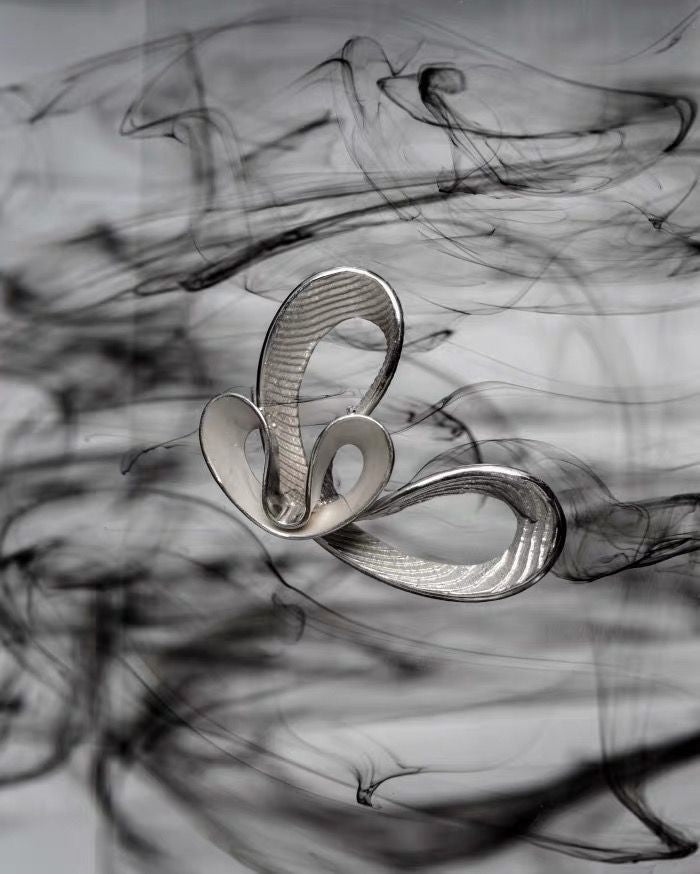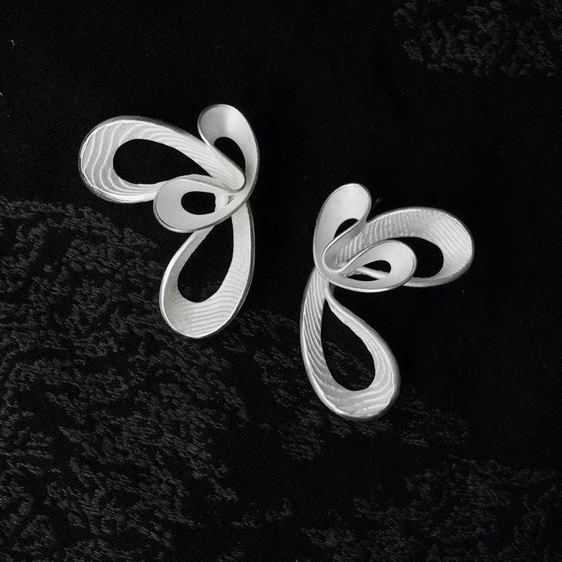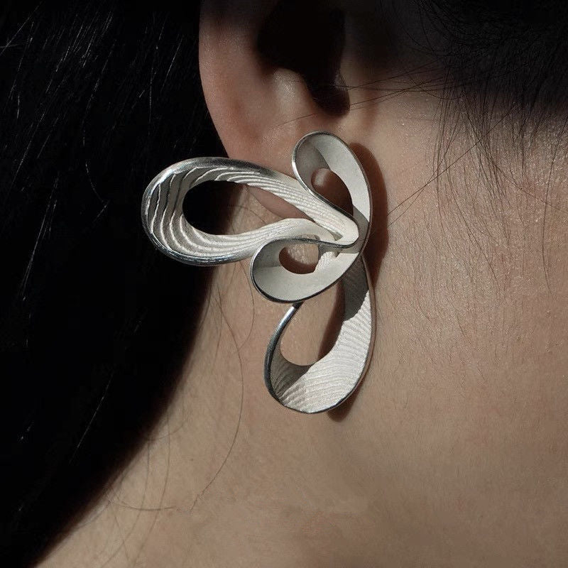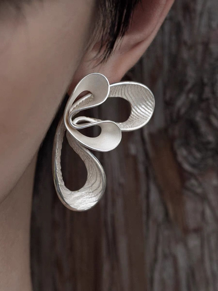 تتميز هذه الأقراط المنحوتة على شكل شريط بتصميم أنيق وانسيابي يشبه زهرة متفتحة أو خطًا رقيقًا. مصنوعة بلمسة نهائية ناعمة كالساتان، وتتميز بحلقات متعددة الطبقات ذات ملمس ناعم، مما يمنحها مظهرًا متعدد الأبعاد وواسعًا. مثالية لإضافة لمسة فنية إلى أي إطلالة.