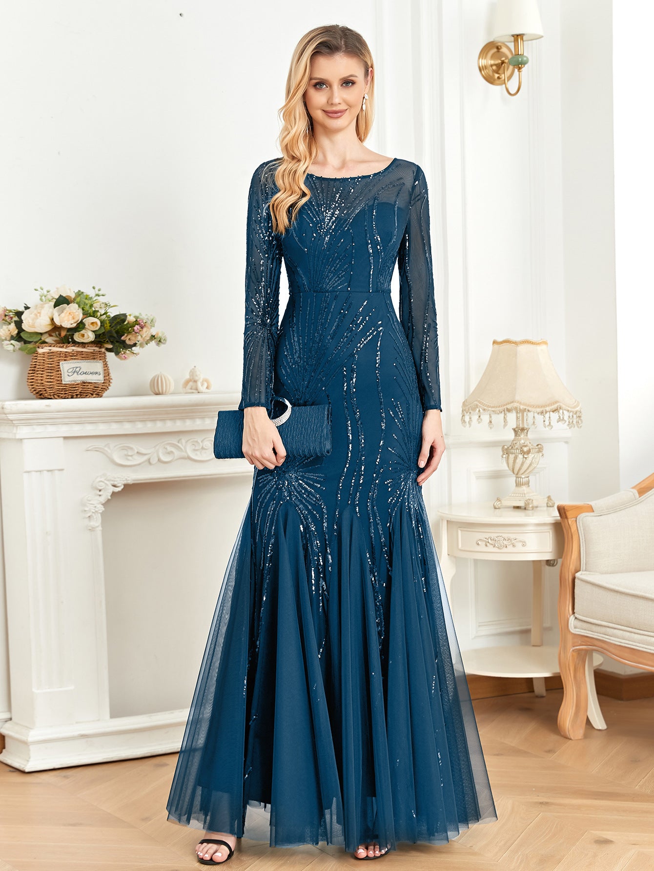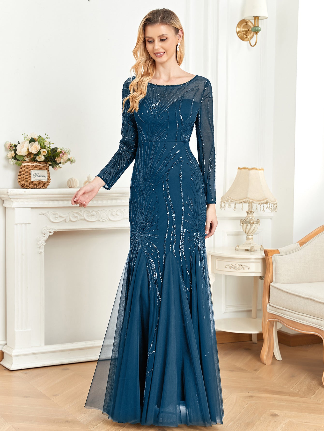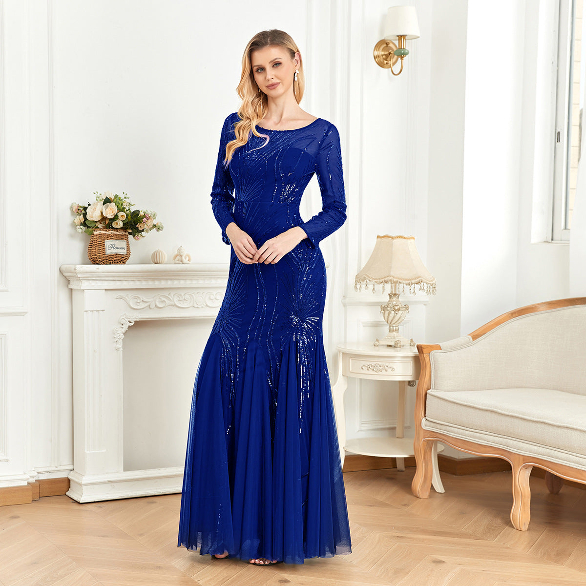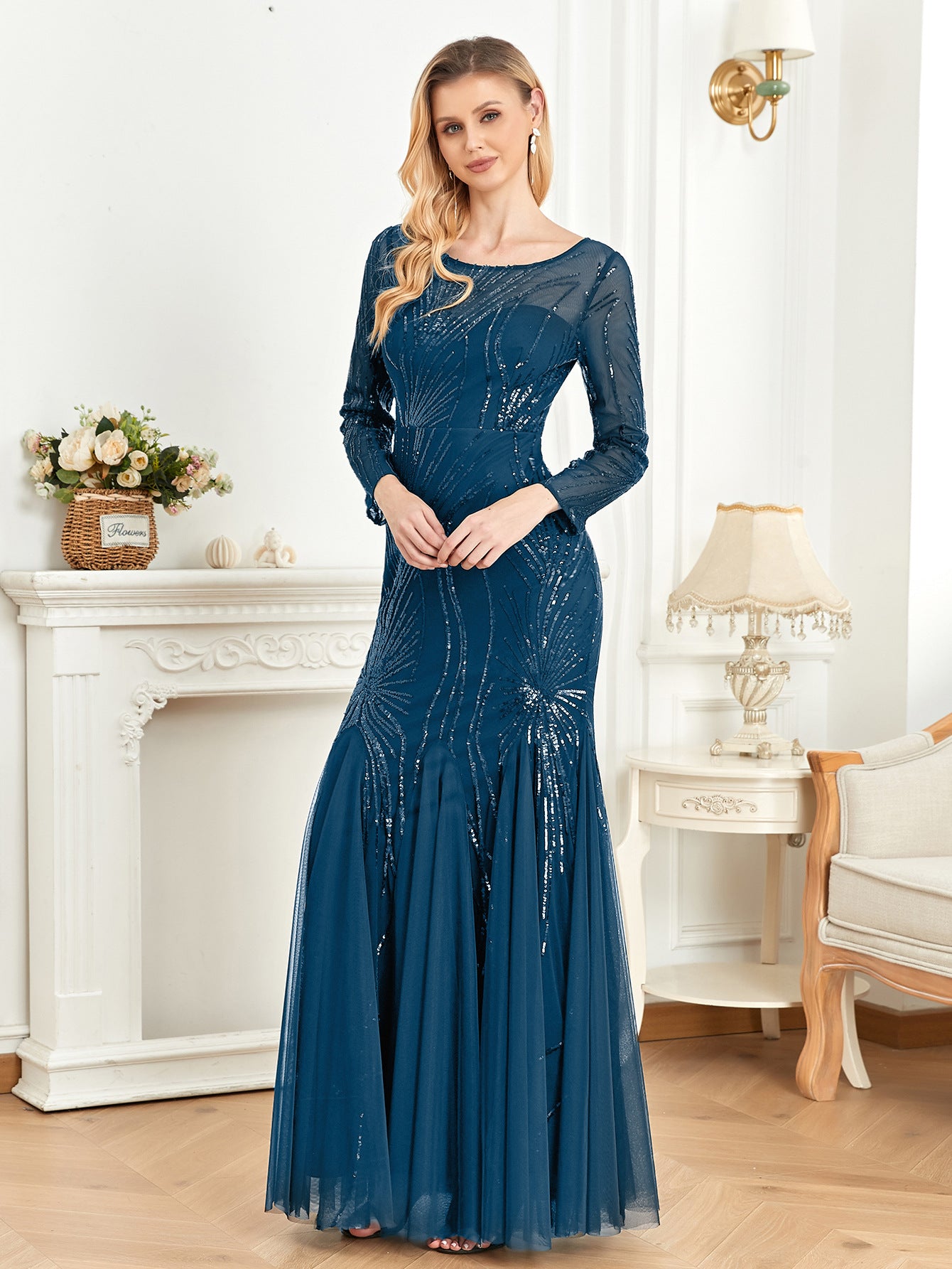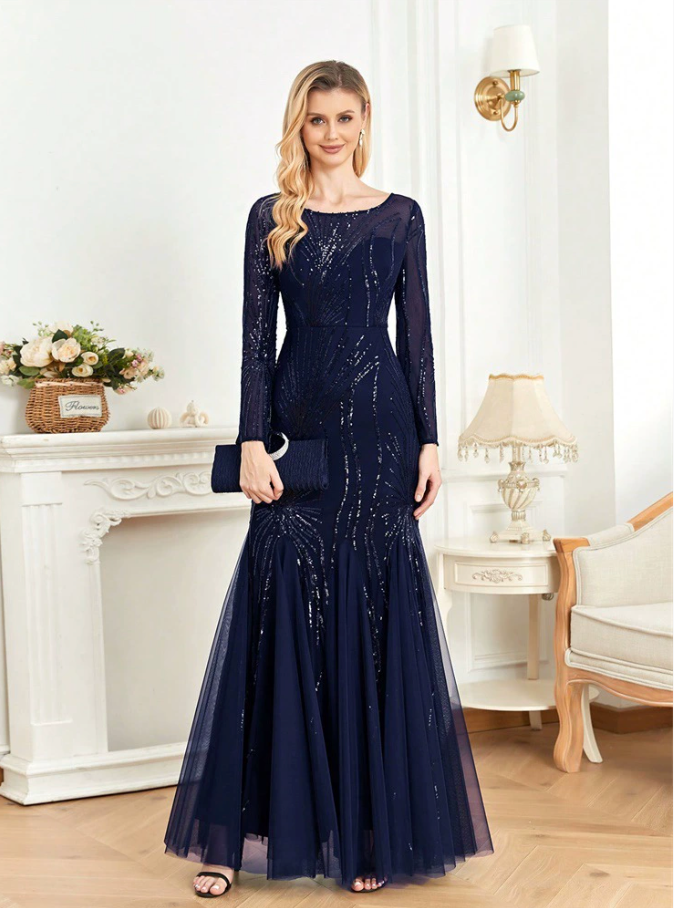 فستان أزرق داكن أنيق بأكمام طويلة من قماش شبكي شفاف، وتطريزات أنيقة بالترتر، وحاشية واسعة ناعمة - مصمم ليمنحكِ أناقة خالدة وسحرًا مسائيًا.