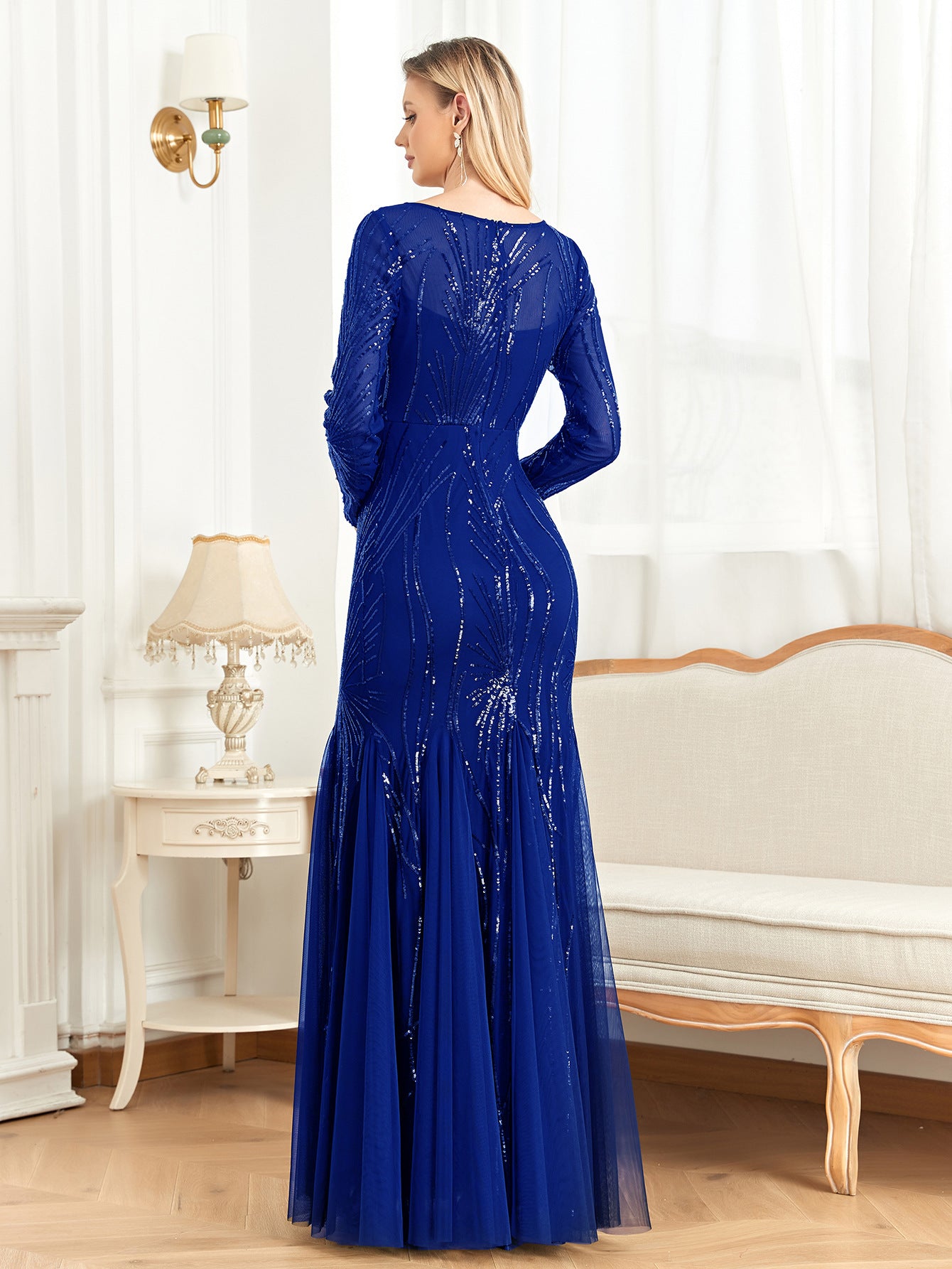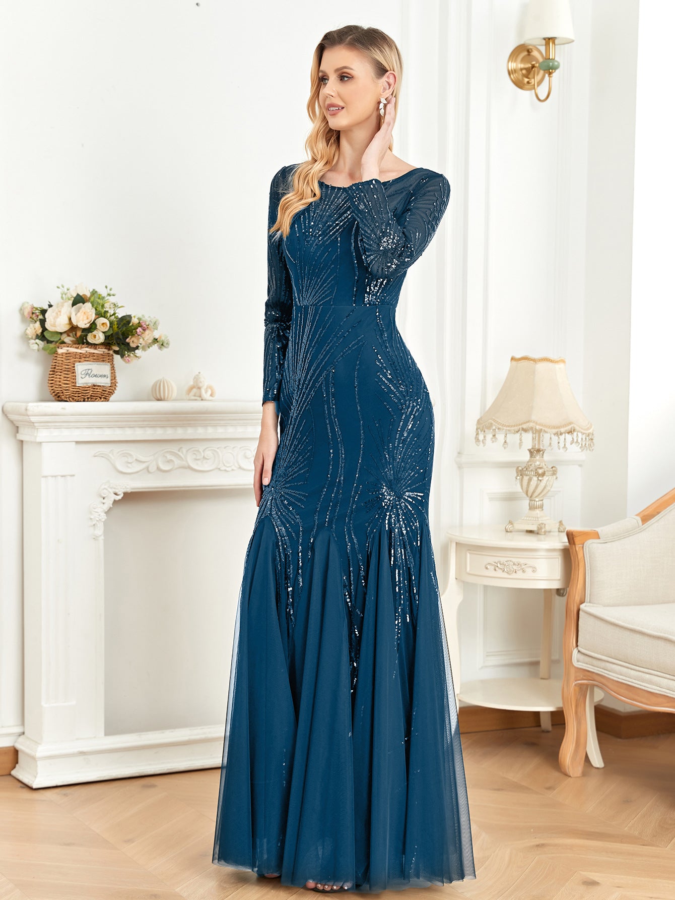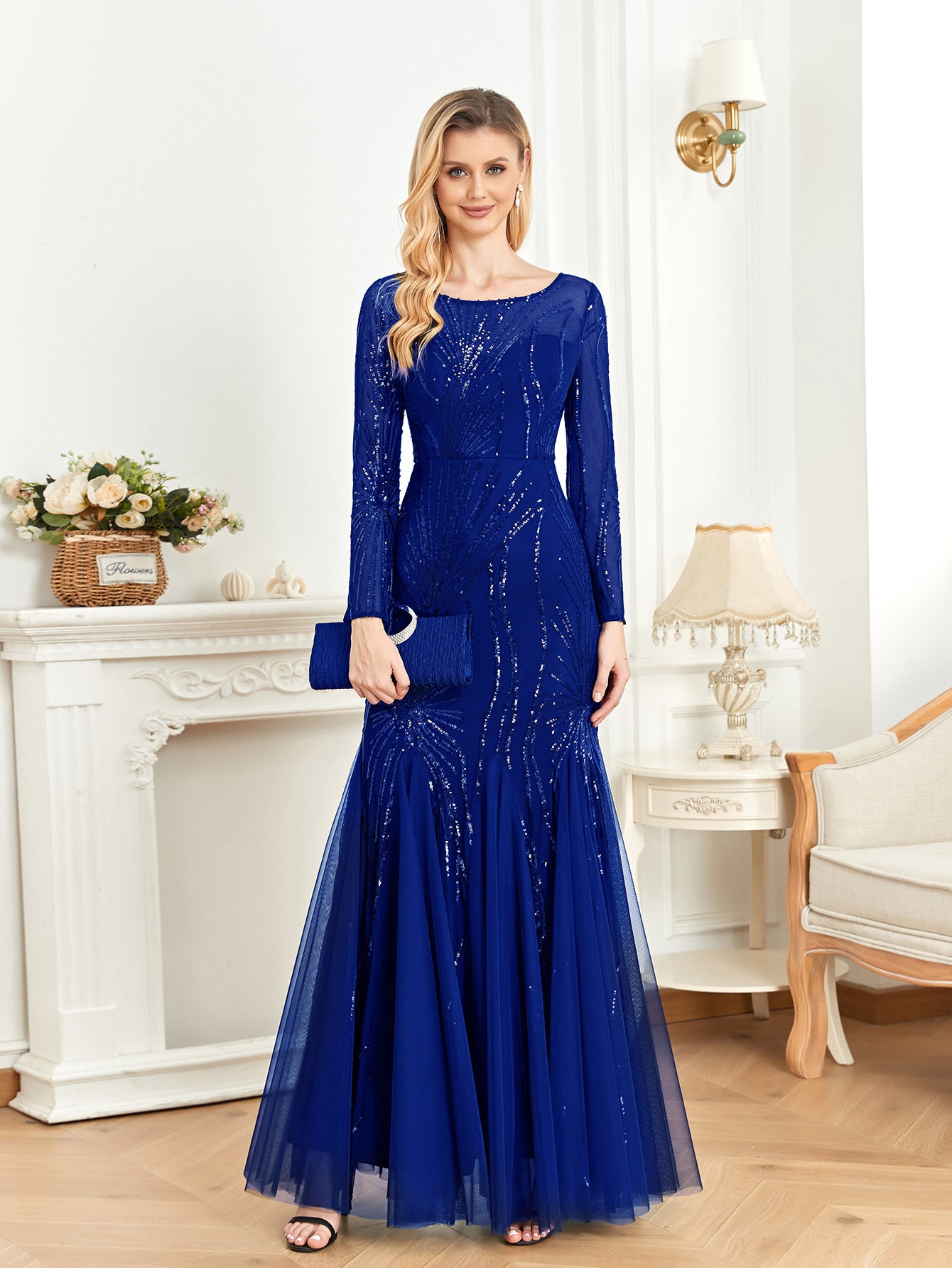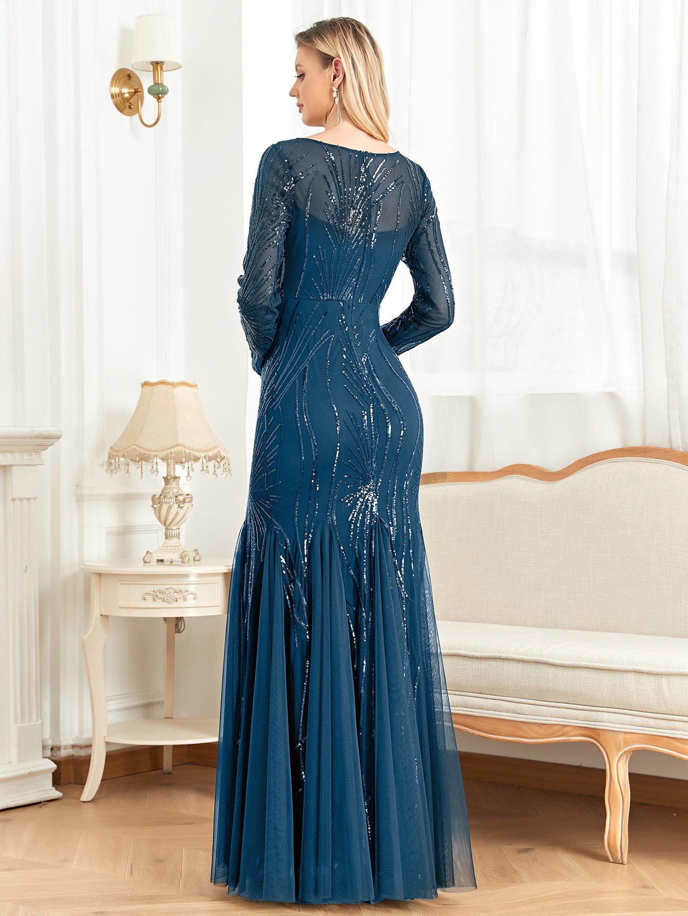 فستان أزرق داكن أنيق بأكمام طويلة من قماش شبكي شفاف، وتطريزات أنيقة بالترتر، وحاشية واسعة ناعمة - مصمم ليمنحكِ أناقة خالدة وسحرًا مسائيًا.