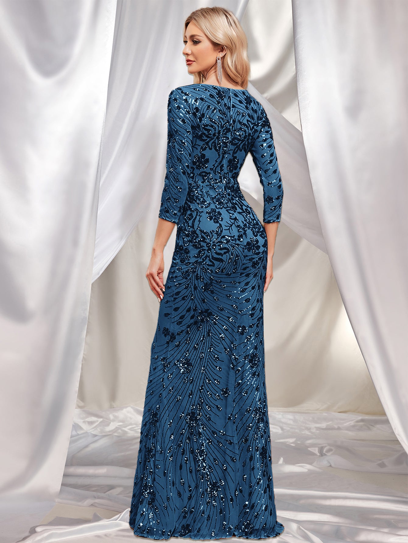 فستان حورية البحر الآسر، مزين بتطريزات الترتر المتقنة، يتميز بياقة مربعة أنيقة وأكمام طويلة ضيقة. مثالي للأناقة والتألق الخالد. اسم القماش: سباندكس