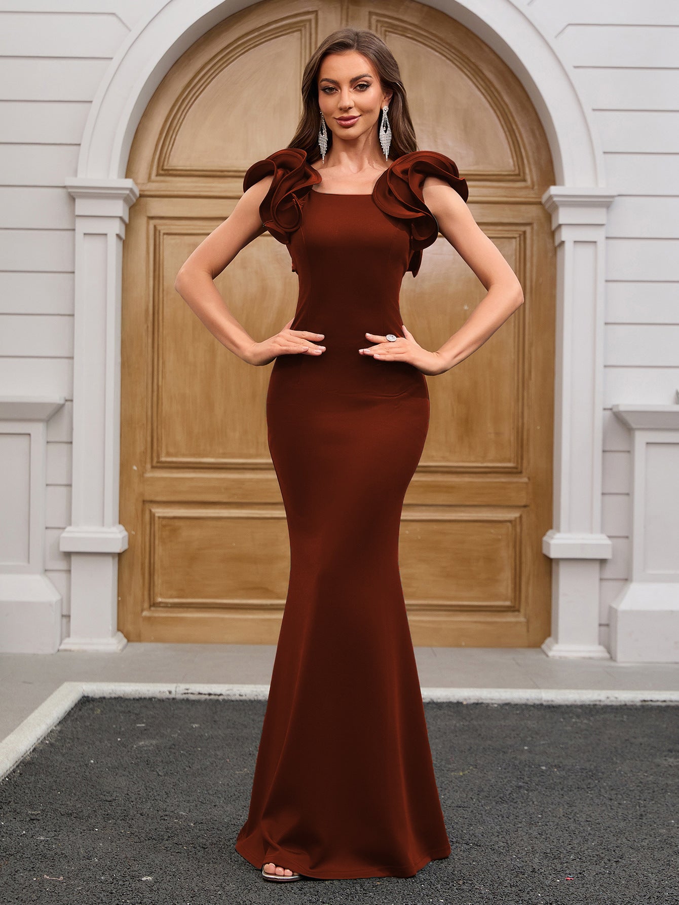 فستان حورية البحر الأنيق يتميز بأكتاف مكشكشة جذابة وياقة مربعة جذابة. مصمم لإبراز منحنيات الجسم الأنثوية بقصة عصرية خالدة.