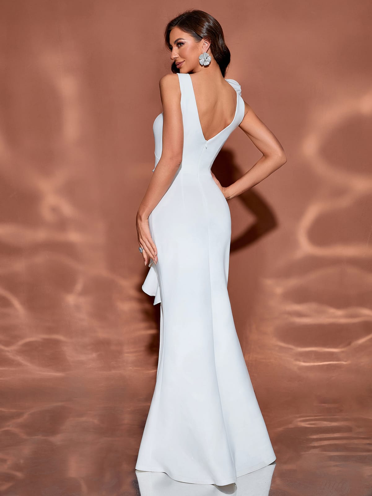 فستان حورية البحر الأبيض الأنيق، مزين بتطريز زهور منحوت على الكتف وكشكشة منسدلة على طول فتحة الصدر. أنيق وعصري، مثالي للمناسبات الخاصة والاحتفالات.