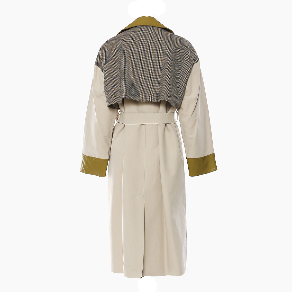 يجمع هذا المعطف الطويل الأنيق بين نقش المربعات الكلاسيكي وتفاصيل الجلد الجريئة المتباينة. يتميز بخصر مزود بحزام وتصميم مزدوج الصدر لإطلالة عصرية وأنيقة.