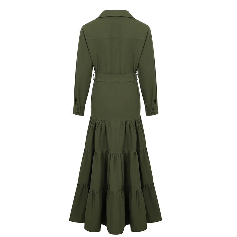 فستان أنيق بلمسة عصرية، يتميز بأزرار أمامية وتنورة متدرجة وحزام خصر مطابق. مزيج مثالي بين التصميم والانسيابية، ينضح بأناقة خالدة.
