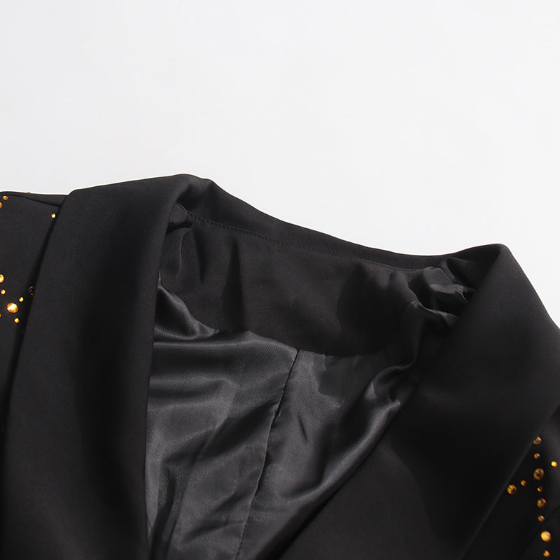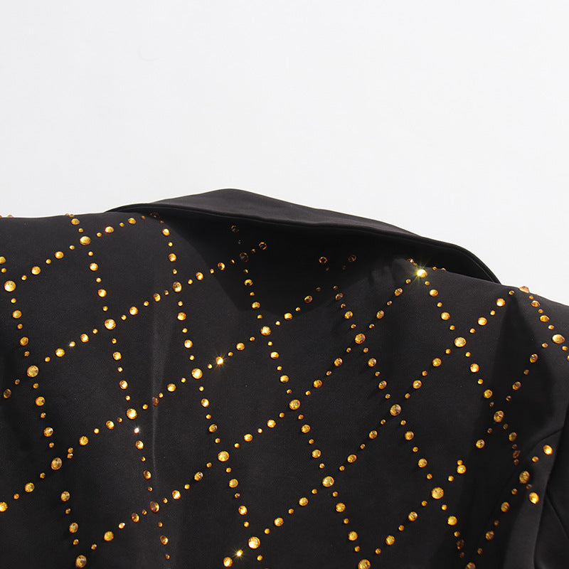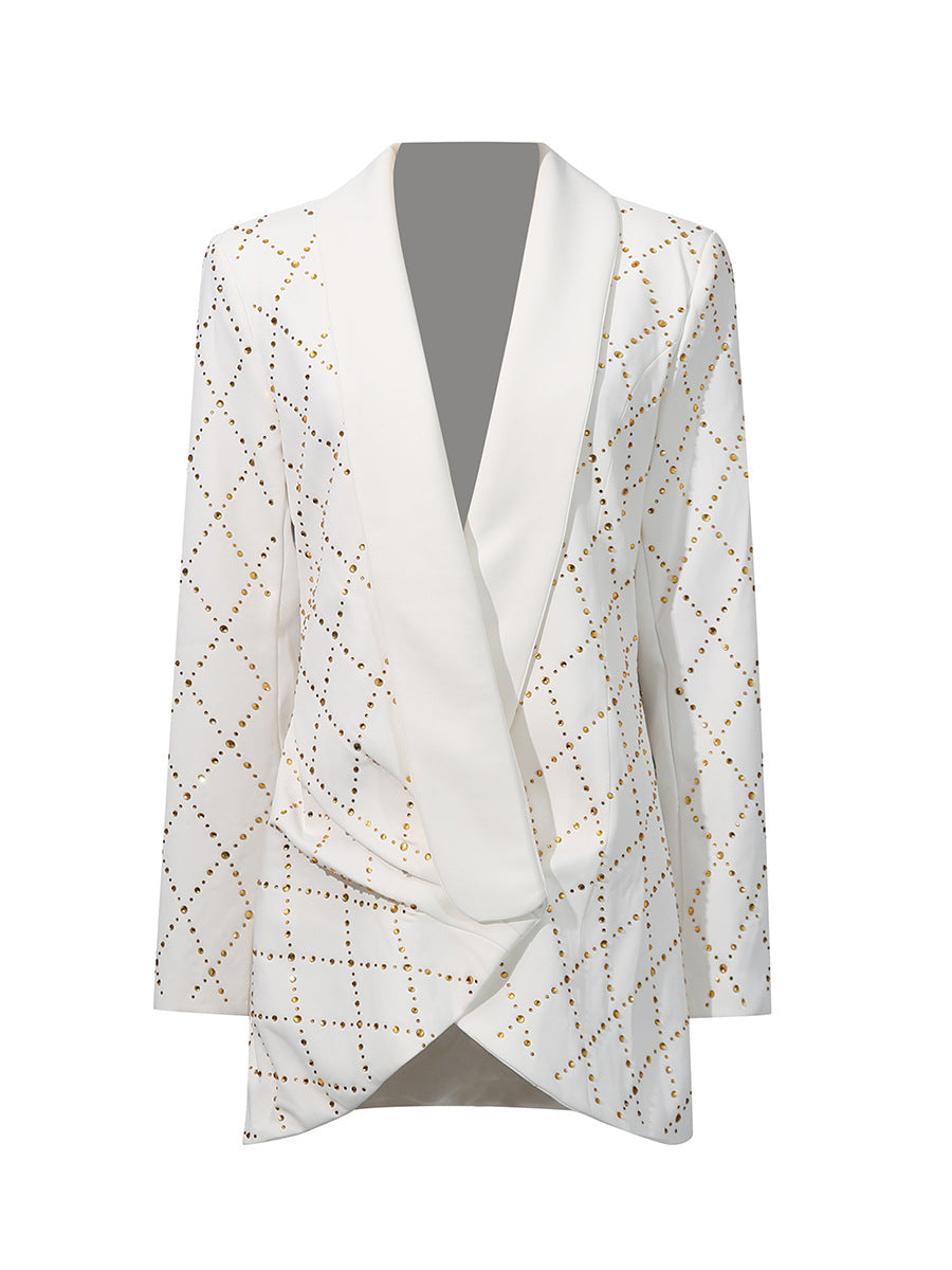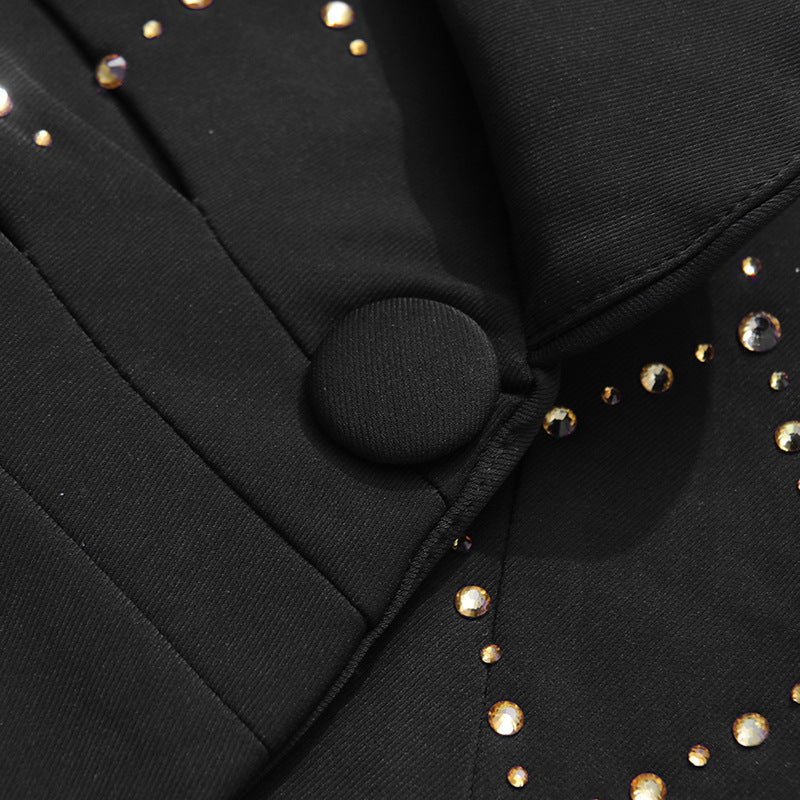 جاكيت أنيق مزين بزخارف من أحجار الراين الذهبية وياقة ناعمة من الساتان. يتميز بتصميم ملتف حول الجسم وقصة راقية تمنحه أناقة وجاذبية لافتة، مما يجعله مثالياً للأمسيات الساحرة. اسم القماش: بوليستر وقطن المقاس الكتف (سم) الصدر (سم) الخصر (سم) الكم (سم) الطول (سم) M 42 102 86 60 78 L 43 106 90 61 79 XL 44 110 94 62 80