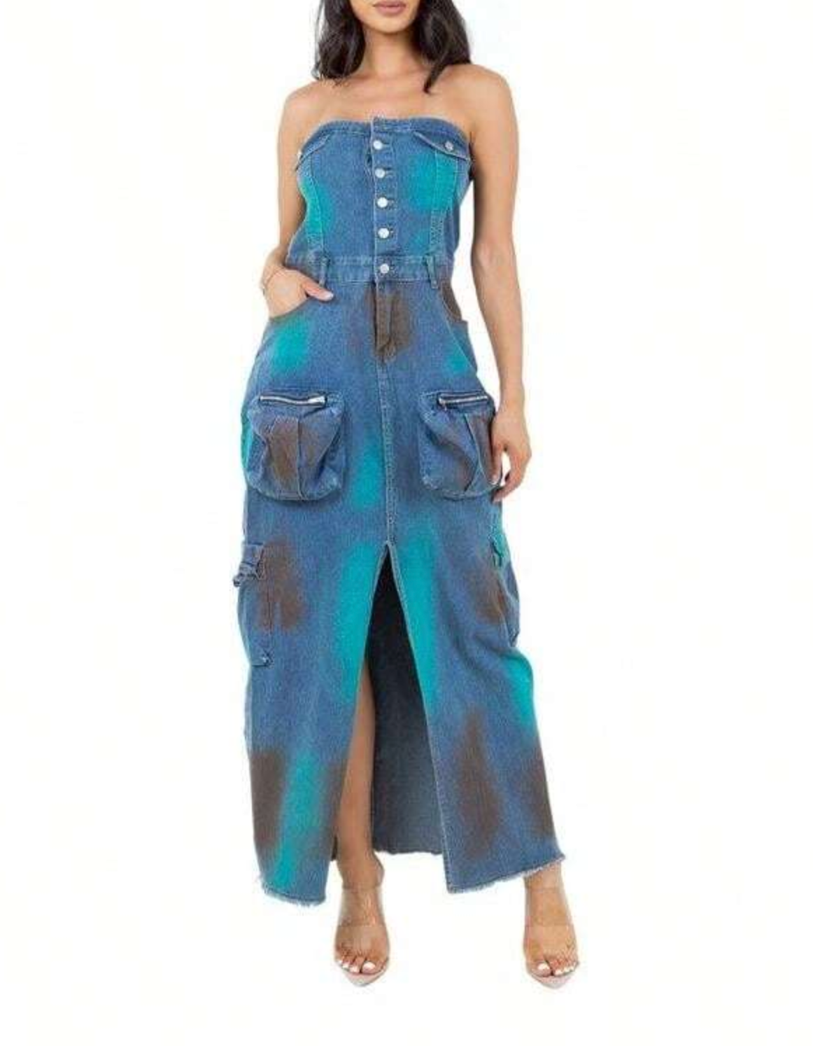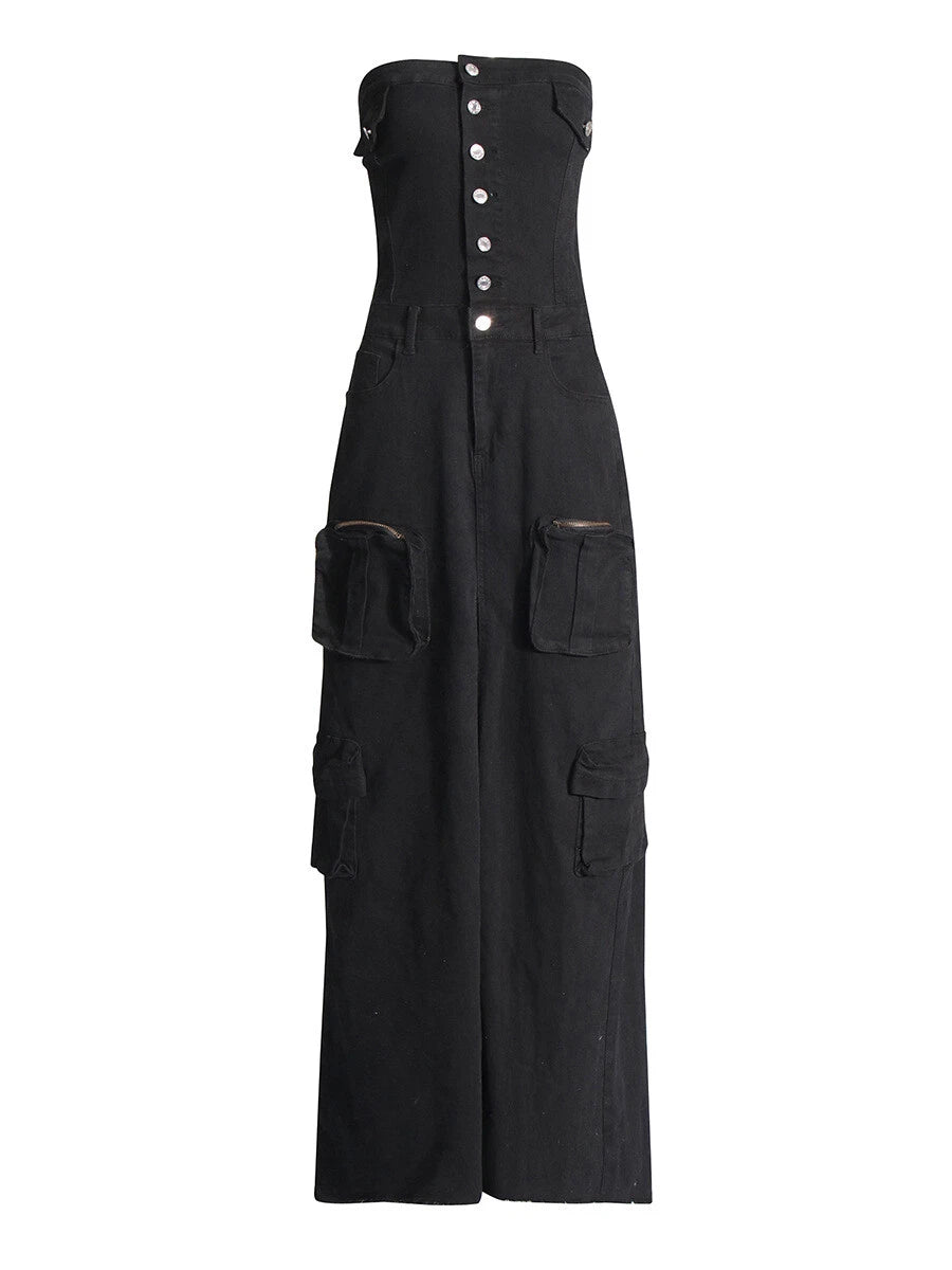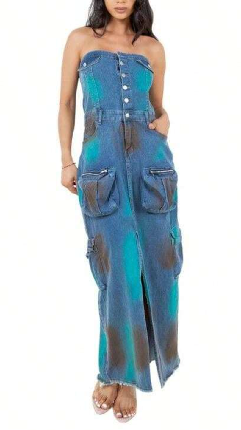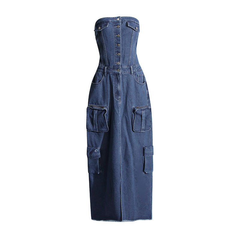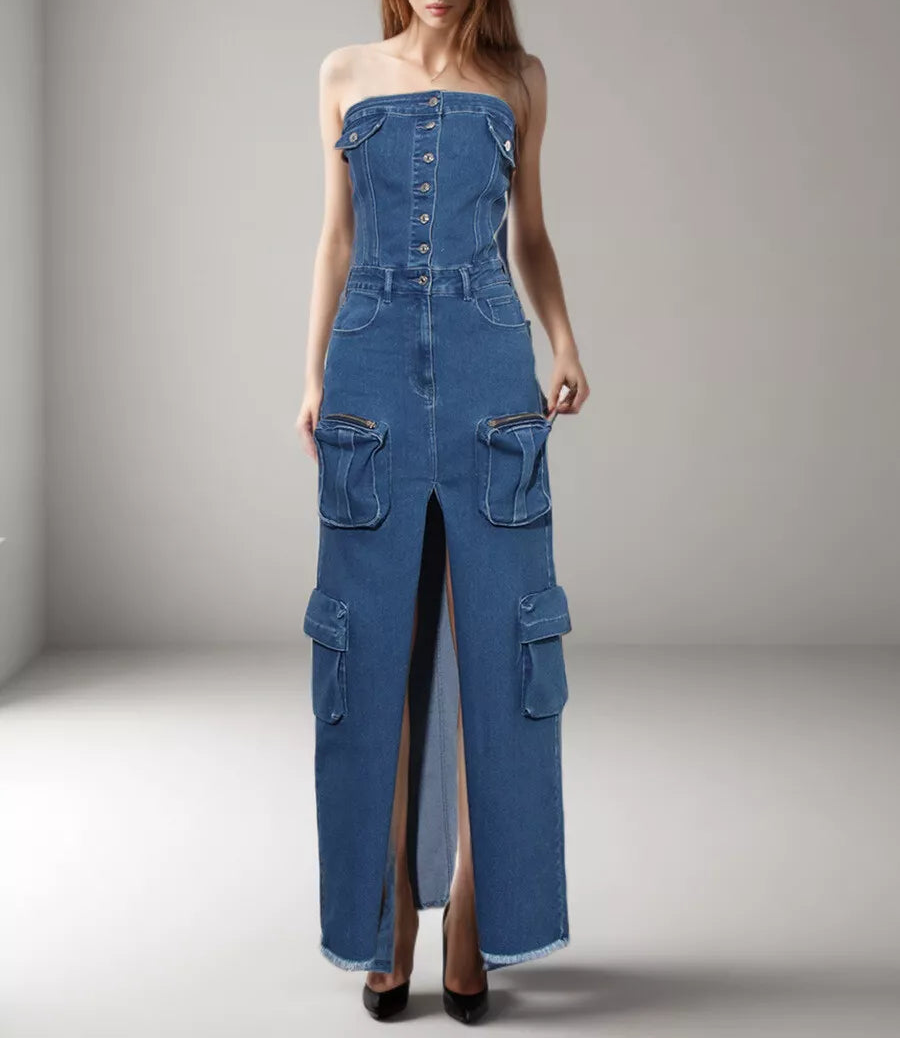 فستان ماكسي عصري من الدنيم بدون حمالات، يتميز بأزرار أمامية، وجيوب كارغو مميزة، وشق في المنتصف - يمزج بين طابع الشارع واللمسة الأنثوية لإطلالة جريئة أنيقة.