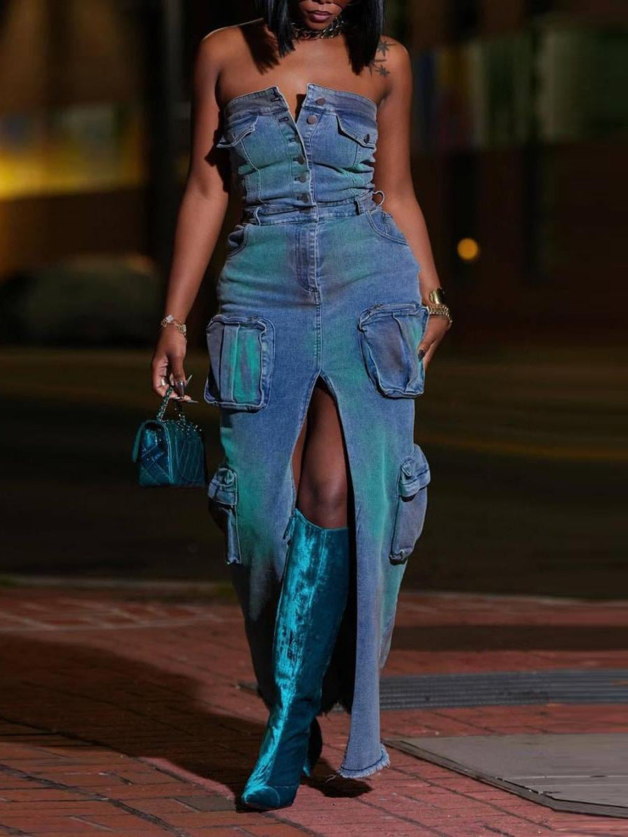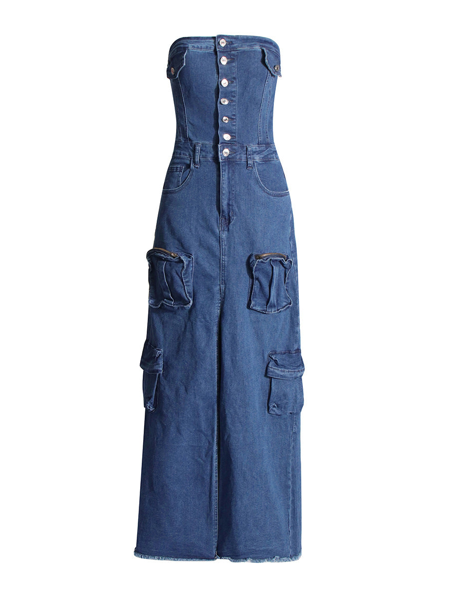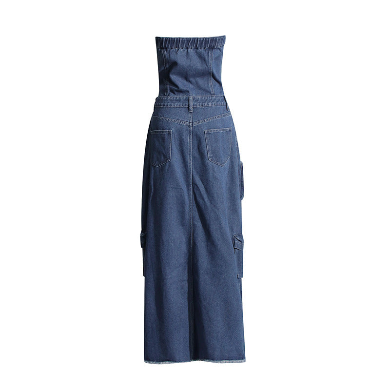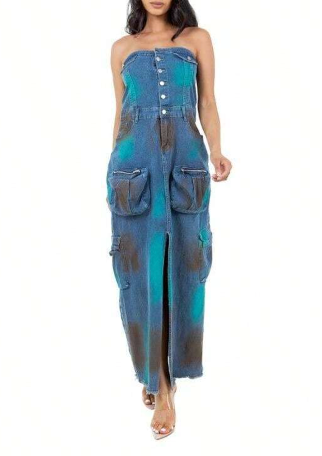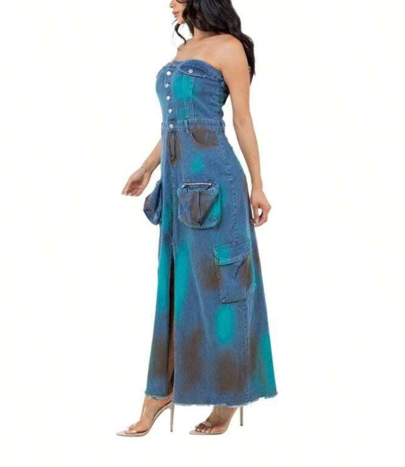 فستان ماكسي عصري من الدنيم بدون حمالات، يتميز بأزرار أمامية، وجيوب كارغو مميزة، وشق في المنتصف - يمزج بين طابع الشارع واللمسة الأنثوية لإطلالة جريئة أنيقة.