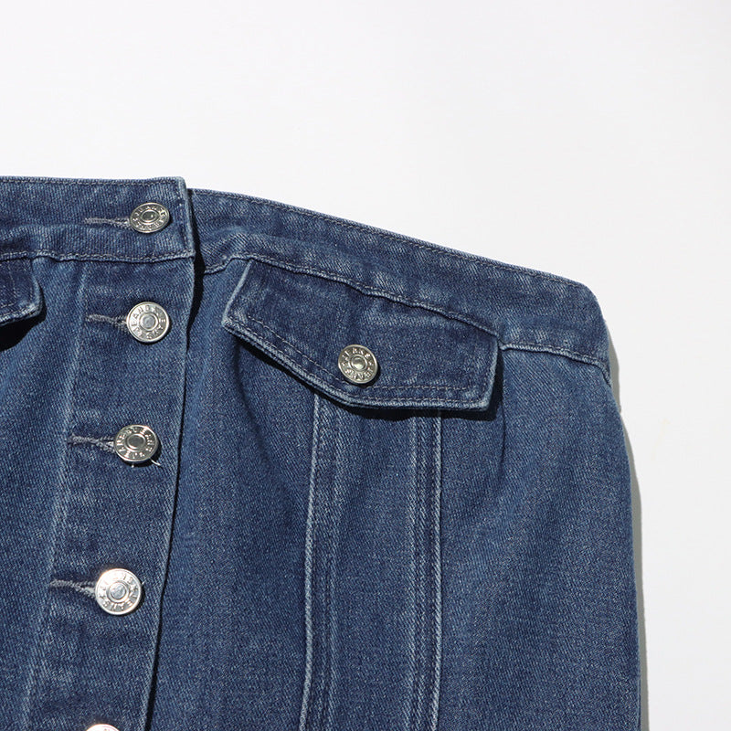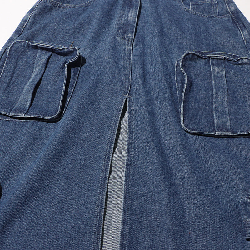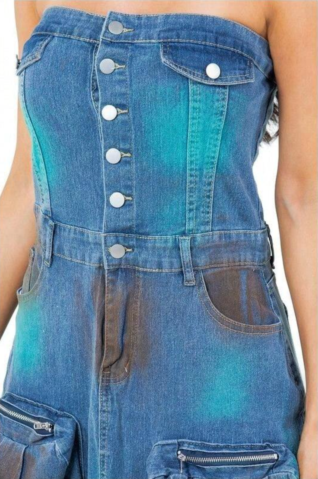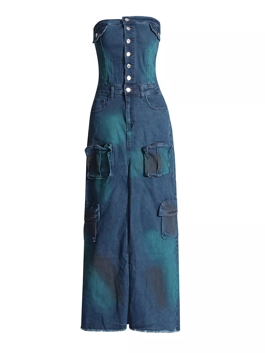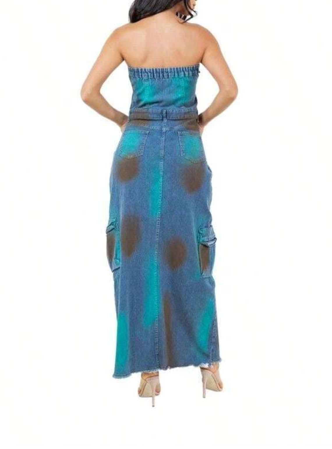 فستان ماكسي عصري من الدنيم بدون حمالات، يتميز بأزرار أمامية، وجيوب كارغو مميزة، وشق في المنتصف - يمزج بين طابع الشارع واللمسة الأنثوية لإطلالة جريئة أنيقة.