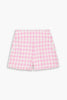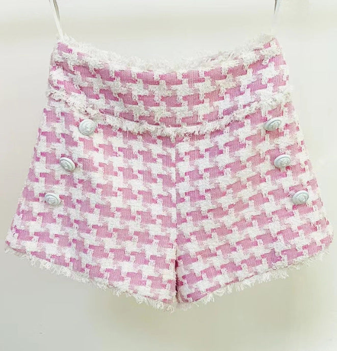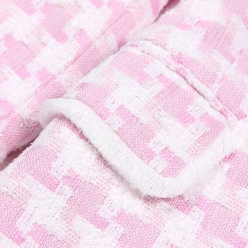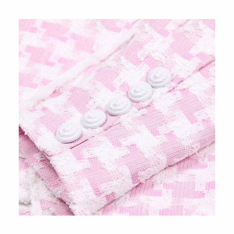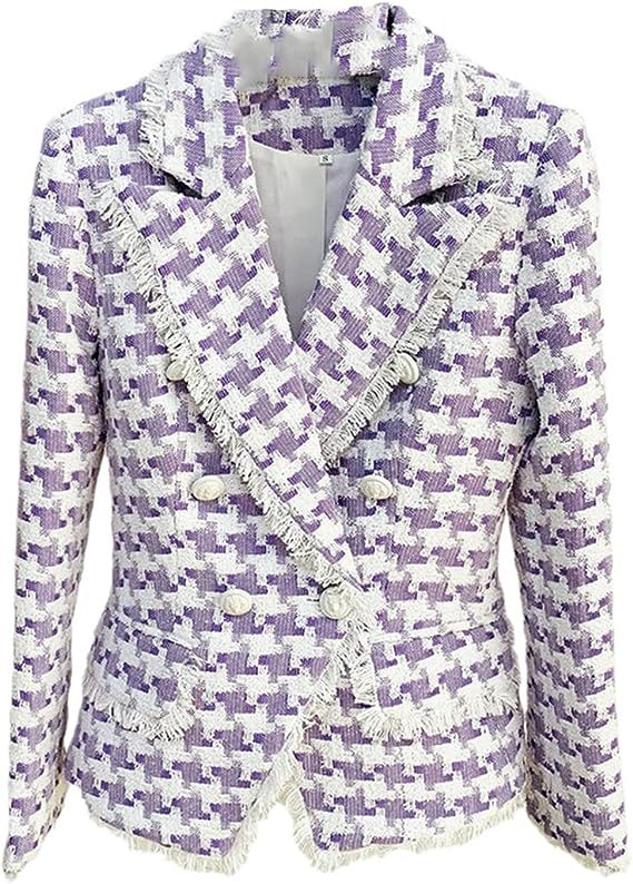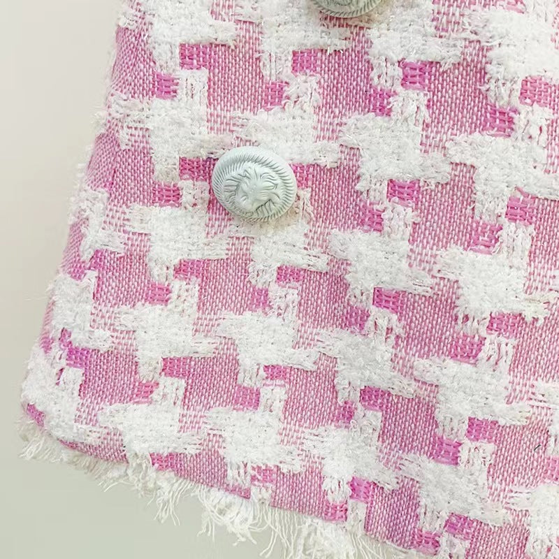 سترة تويد ساحرة باللونين البنفسجي والأبيض، بتصميم مزدوج الصدر ونقشة مربعات مزخرفة. مزينة بحواف ناعمة وأزرار مغطاة بالقماش، قطعة راقية تجمع بين الخياطة الكلاسيكية والأناقة الأنثوية.