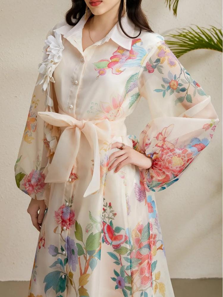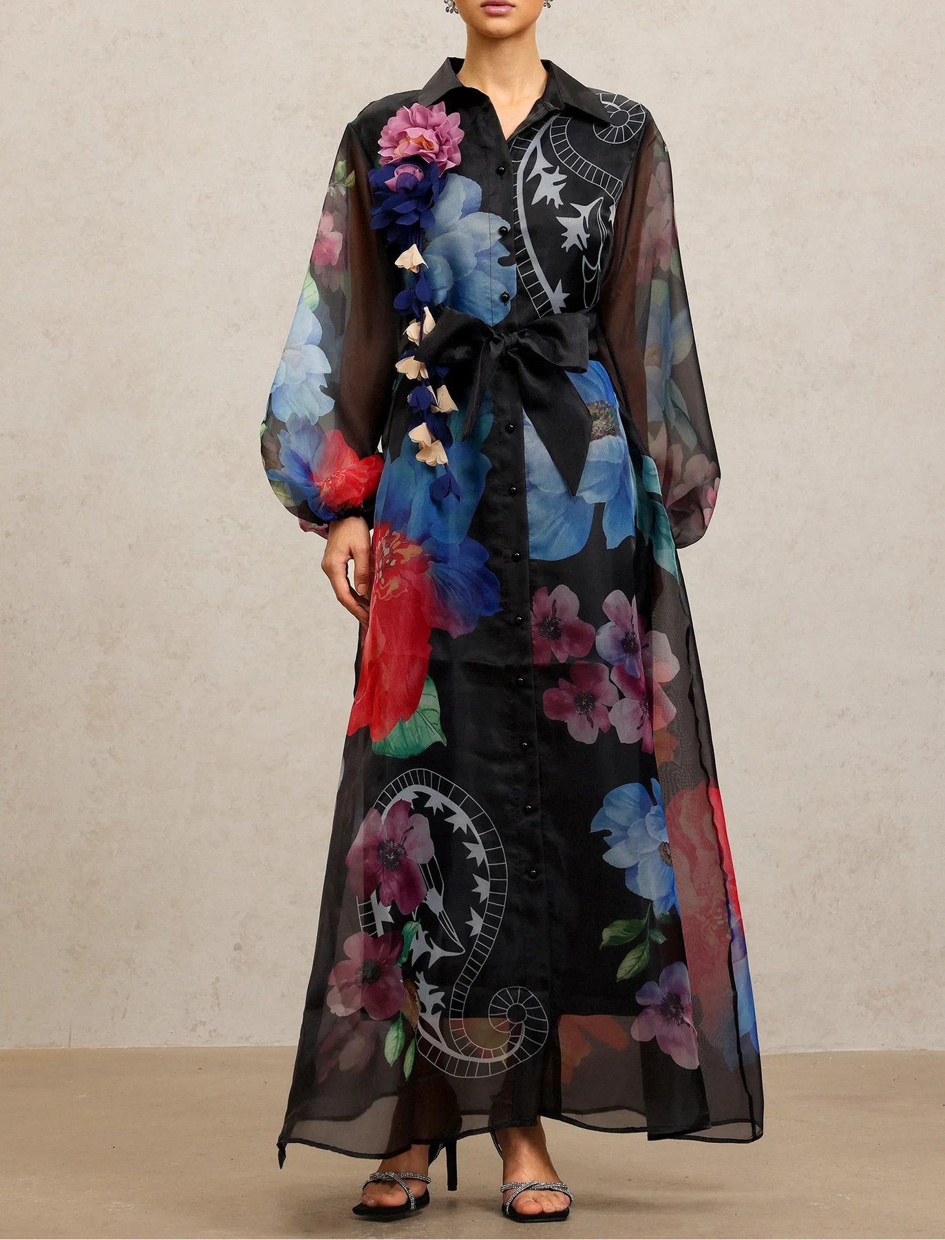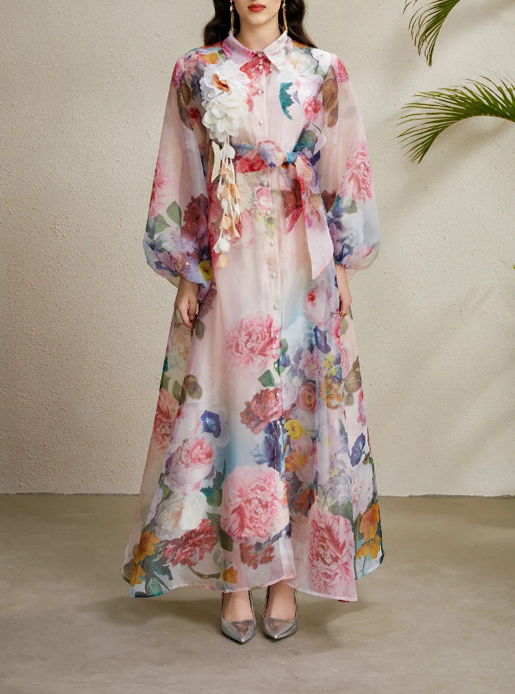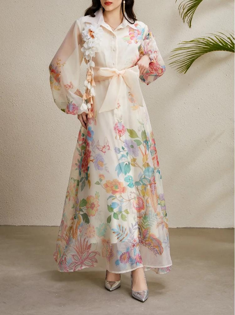 فستان ماكسي حالم من قماش الأورجانزا مزين بطبعات زهور ناعمة وتطريزات زهور ثلاثية الأبعاد، ويتميز بأكمام واسعة وربطة خصر لإطلالة رومانسية أنيقة.