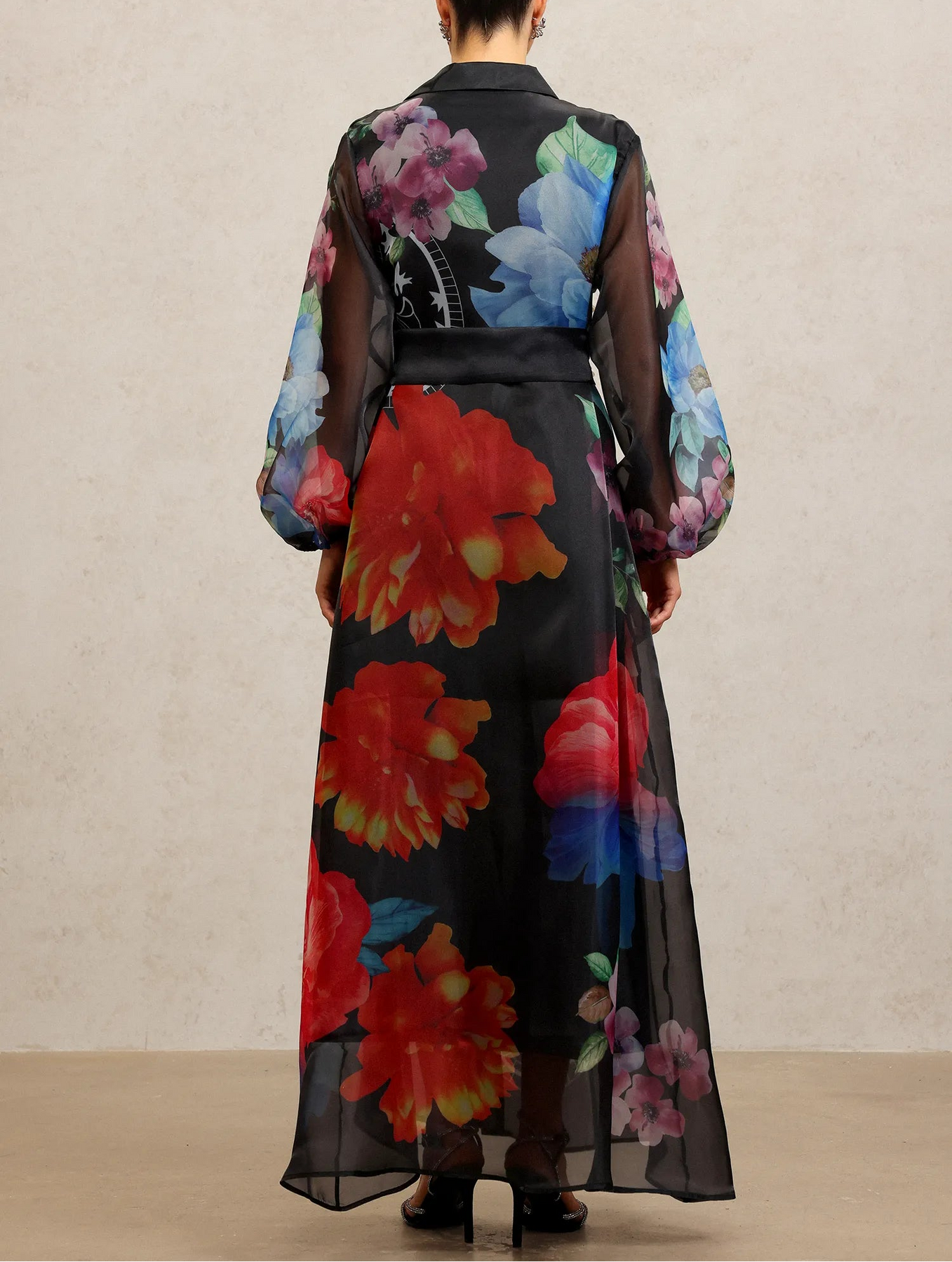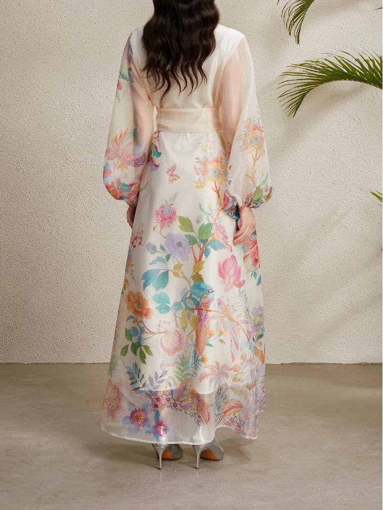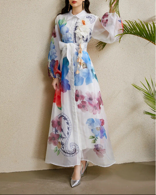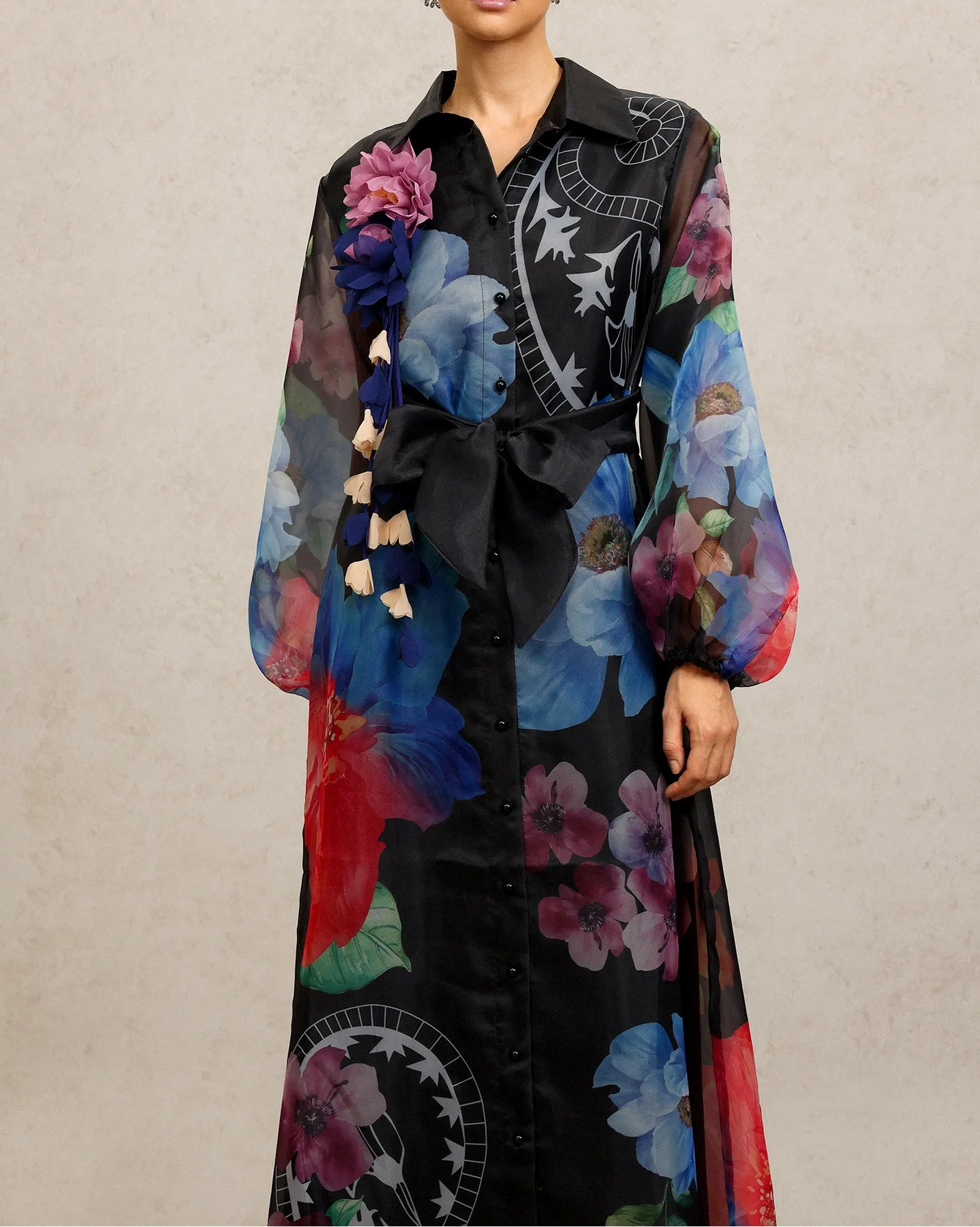 فستان ماكسي حالم من قماش الأورجانزا مزين بطبعات زهور ناعمة وتطريزات زهور ثلاثية الأبعاد، ويتميز بأكمام واسعة وربطة خصر لإطلالة رومانسية أنيقة.