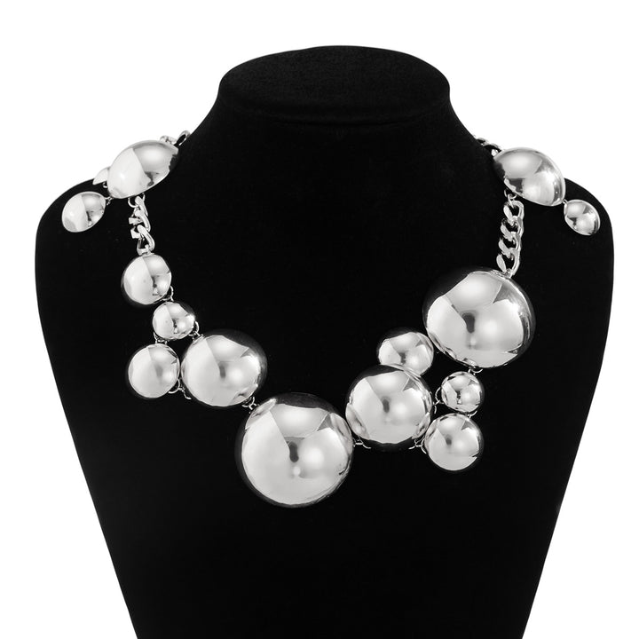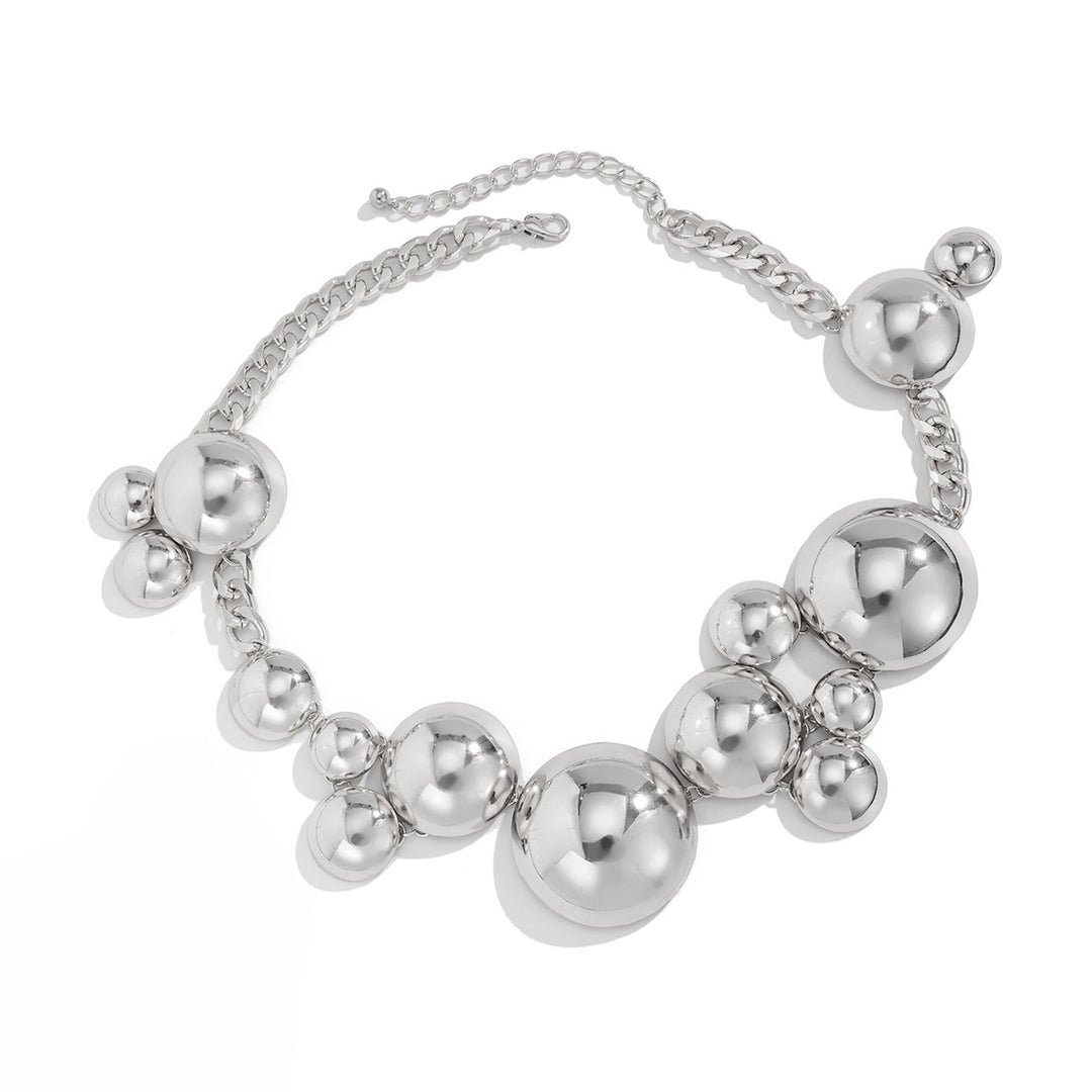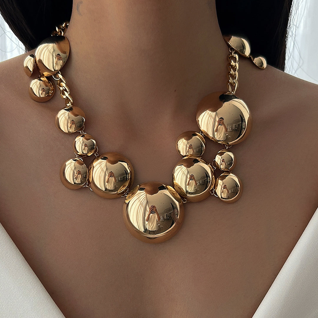 تتميز هذه القلادة الضخمة بتصميمها المذهل من الكرات المعدنية بأحجام متنوعة. صُممت لتترك انطباعًا مميزًا، فبريقها الأخّاذ وشكلها الانسيابي المنحوت يُضفيان لمسة عصرية على أي إطلالة. سواء ارتديتها فوق بلوزة أنيقة أو مع فستان سهرة، ستُضفي هذه القلادة لمسة عصرية على إطلالتك بأناقة وجاذبية لا مثيل لهما.