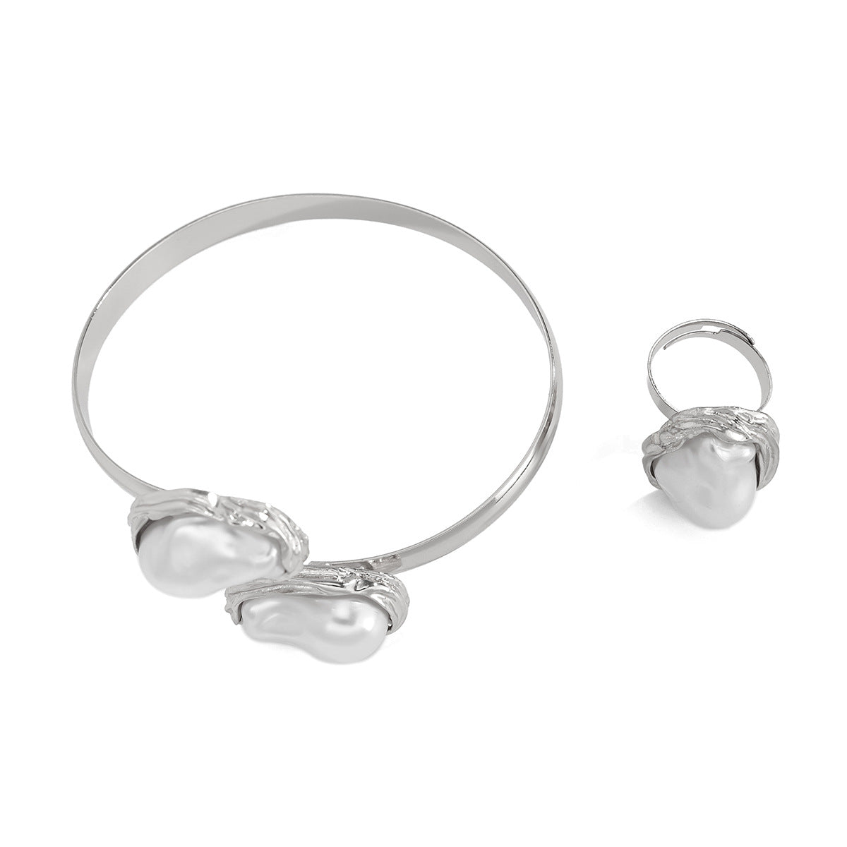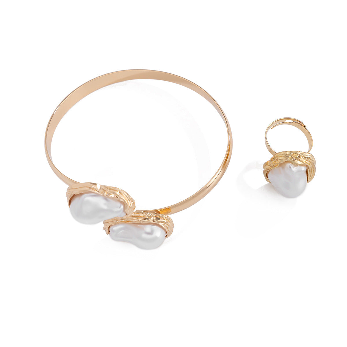 طقم أنيق من قطعتين، يتكون من سوار مفتوح وخاتم متناسق، كل منهما مرصّع بلآلئ صناعية متعددة الأوجه، محاطة بإطار ذهبي أو فضي، بلمسة طبيعية. يجمع هذا الطقم بين البساطة العصرية والسحر الخالد، وهو مثالي لأي مناسبة بلمسة من الفخامة العصرية.