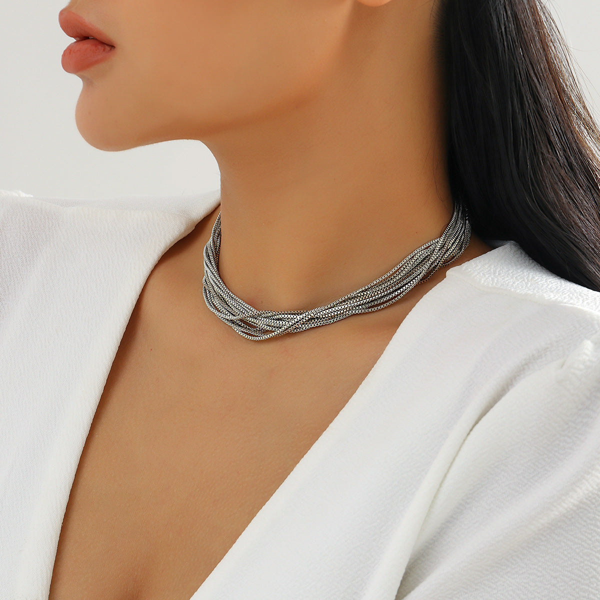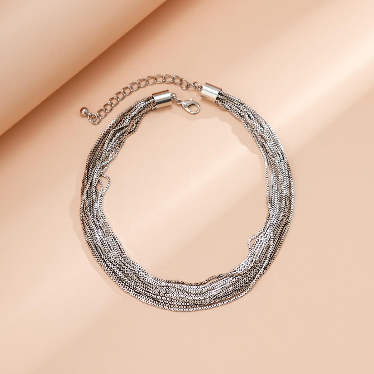قلادة عصرية مميزة مصنوعة من سلاسل رقيقة متعددة الخيوط. صُممت هذه القلادة متعددة الطبقات لإضفاء لمسة من التنوع والتألق، وتتميز بمشبك لامع وحلق تمديد قابل للتعديل لمقاس مثالي. متوفرة باللونين الذهبي والفضي، وتُكمل أي إطلالة، من النهار إلى المساء.