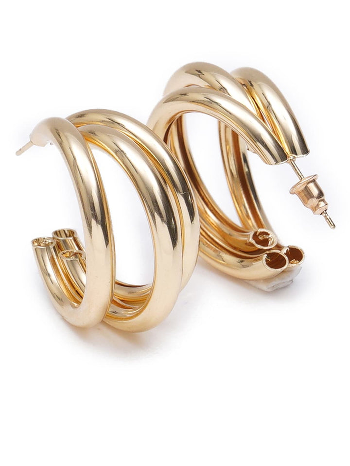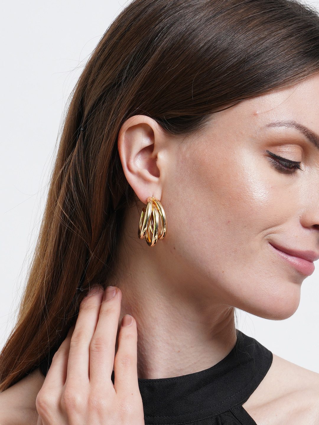 أقراط دائرية مزدوجة القبة تتميز بشريطين دائريين متشابكين بلمسة نهائية ذهبية مصقولة. تصميمها السميك والأنيق يُحقق التوازن المثالي بين الجرأة والطابع الخالد، مما يجعلها قطعة مميزة متعددة الاستخدامات للمناسبات الرسمية وغير الرسمية.