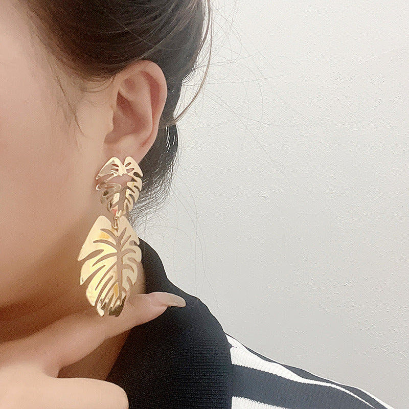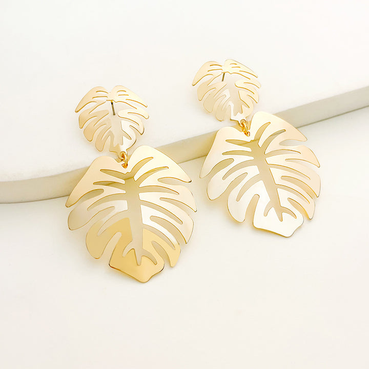 أقراط مميزة بتصميم ورقة مونستيرا مزدوج الطبقات، مصنوعة من معدن ذهبي مصقول. هذه الأقراط المتدلية المستوحاة من المناطق الاستوائية تضفي لمسة جريئة وغريبة، مثالية لإطلالات العطلات أو ليالي الصيف. خفيفة الوزن وملفتة للنظر، تضفي لمسة جريئة وسحرًا نباتيًا على أي إطلالة.