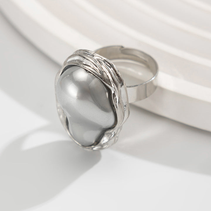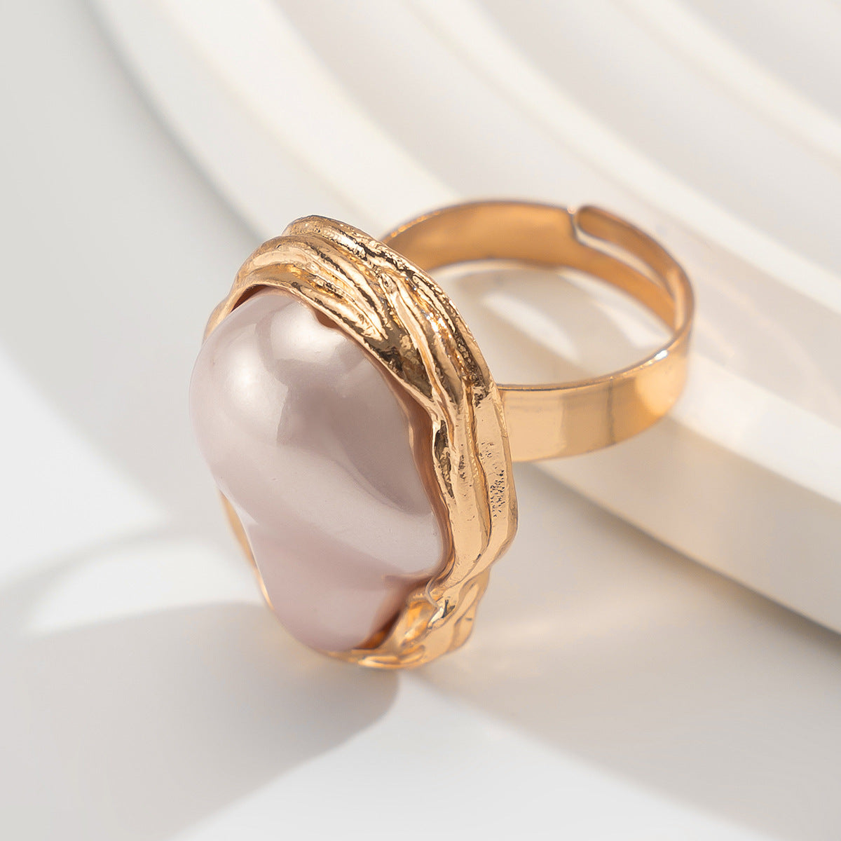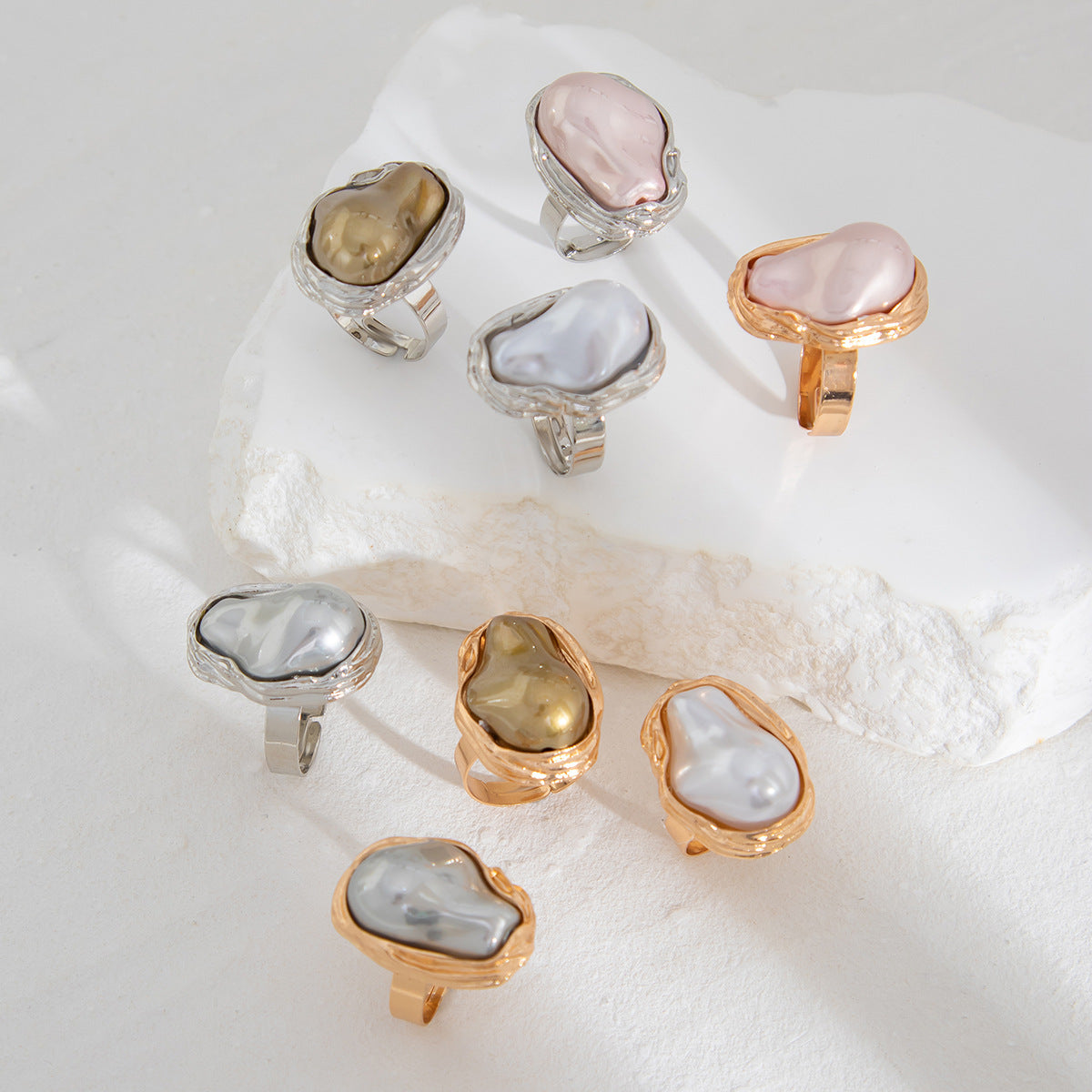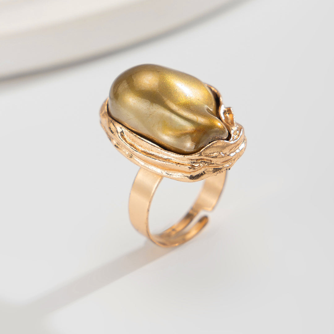 خاتم فني مرصع بلؤلؤة خلابة غير منتظمة الشكل، محاط بإطار مزخرف. تصميمه القابل للتعديل يضمن ملاءمة مثالية، بينما يُضفي الإطار المعدني المزخرف لمسة من السحر الطبيعي. متوفر بألوان متنوعة تناسب جميع الأذواق، هذا الخاتم قطعة فنية راقية.