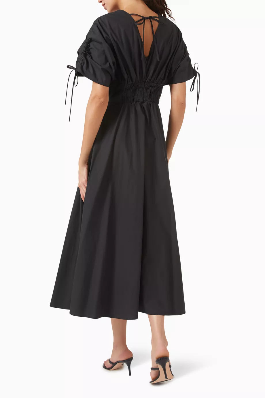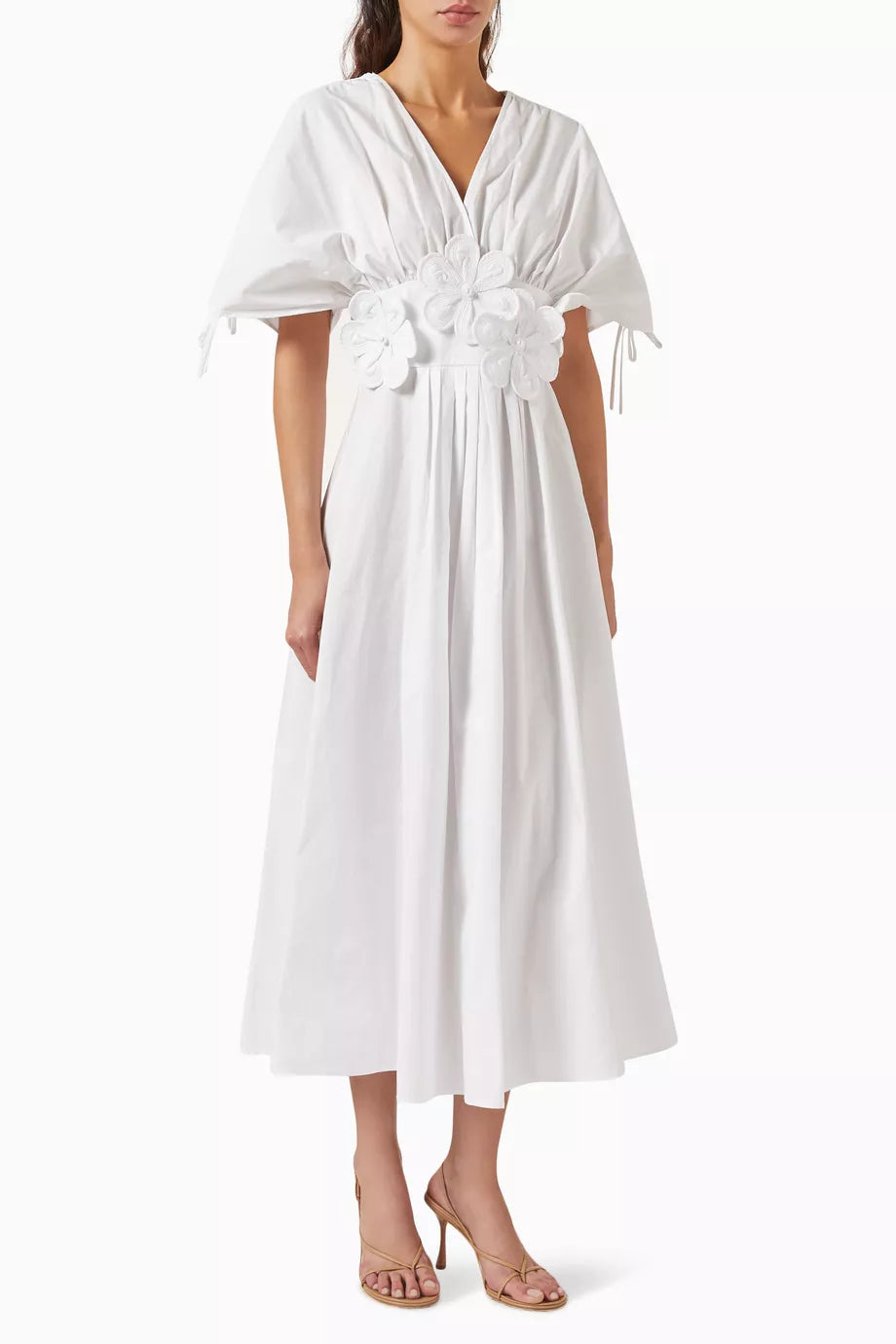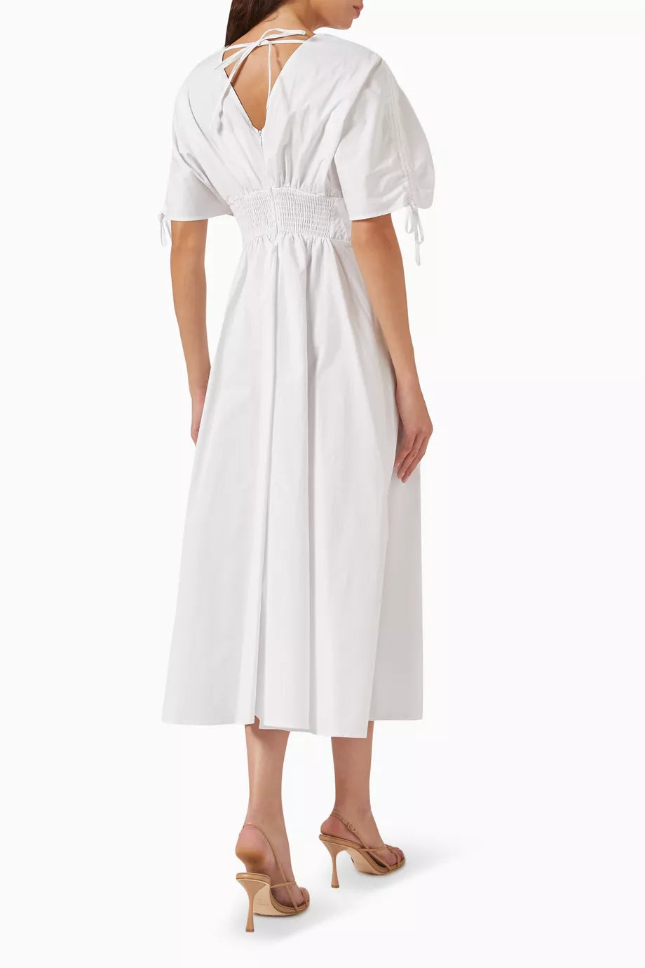 فستان أبيض متوسط ​​الطول، أنيق ورومانسي، مصنوع من قطن خفيف الوزن، بفتحة رقبة عميقة على شكل حرف V تُضفي عليه لمسة أنثوية ساحرة. يتميز بأكمام قصيرة واسعة مع أربطة قابلة للتعديل، مما يُضفي عليه تصميمًا ناعمًا ونحتيًا يُحيط بالكتفين بأناقة.