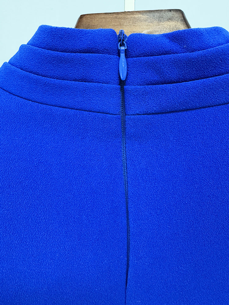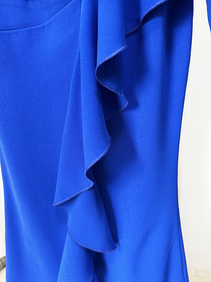 فستان أنيق وجذاب يصل إلى الأرض بلون أزرق ملكي غني، مصمم ليُضفي لمسة من الرقي والجاذبية. يتميز الفستان بصدرية مُهيكلة بأكمام طويلة وأكتاف عالية، مما يُضفي عليه مظهرًا قويًا مثاليًا للمناسبات الرسمية المسائية.