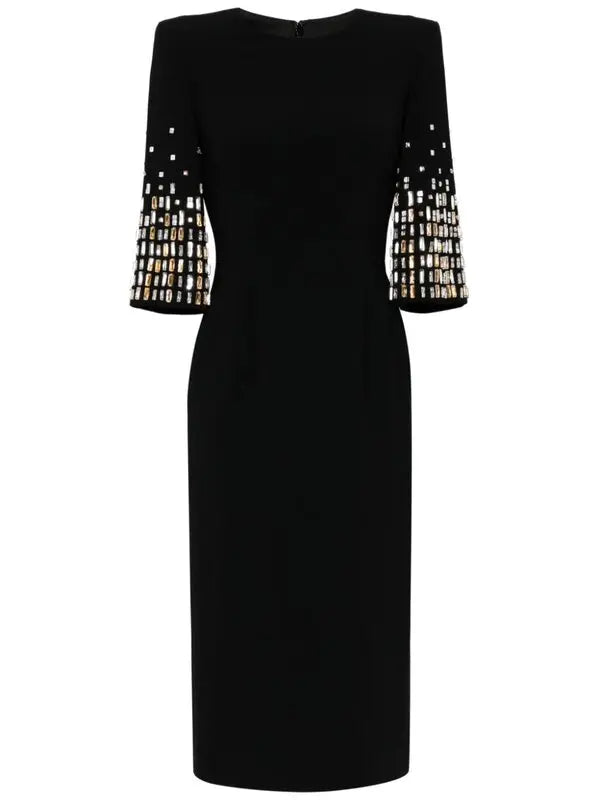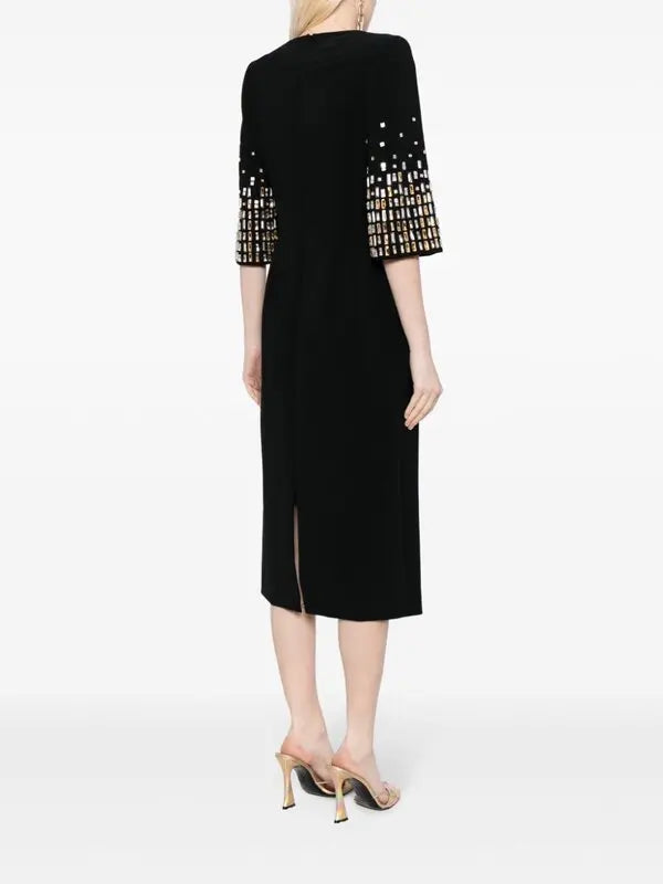 فستان أسود متوسط الطول، كلاسيكي، ينضح بالأناقة بلمسة عصرية. صُمم هذا الفستان بياقة دائرية كلاسيكية وقصة ضيقة، يلتف حول الجسم برفق ويمتد حتى منتصف الساق، ليمنحكِ إطلالة أنيقة ومصقولة.