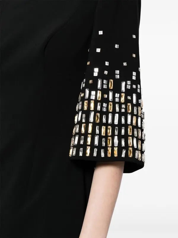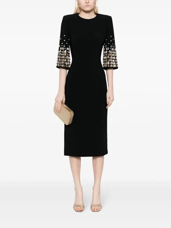 تكمن التفاصيل المميزة في الأكمام - مصممة بطول 3/4، وتتميز بزخارف معدنية معقدة بنمط شبكي هندسي يتلاشى تدريجيًا مع القماش الأسود الصلب. تلتقط اللمسات المعدنية الضوء بشكل رائع، مما يضيف بريقًا فاخرًا ويحول الفستان من بسيط إلى أنيق.