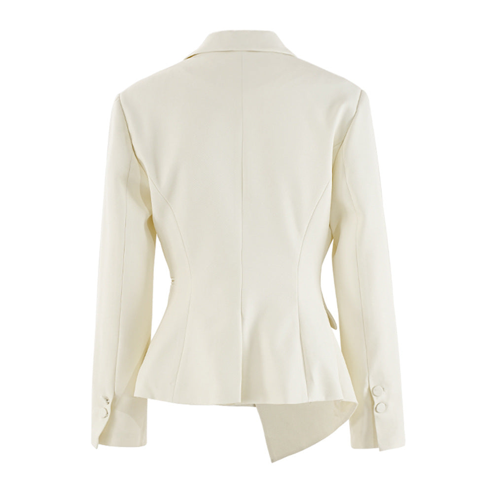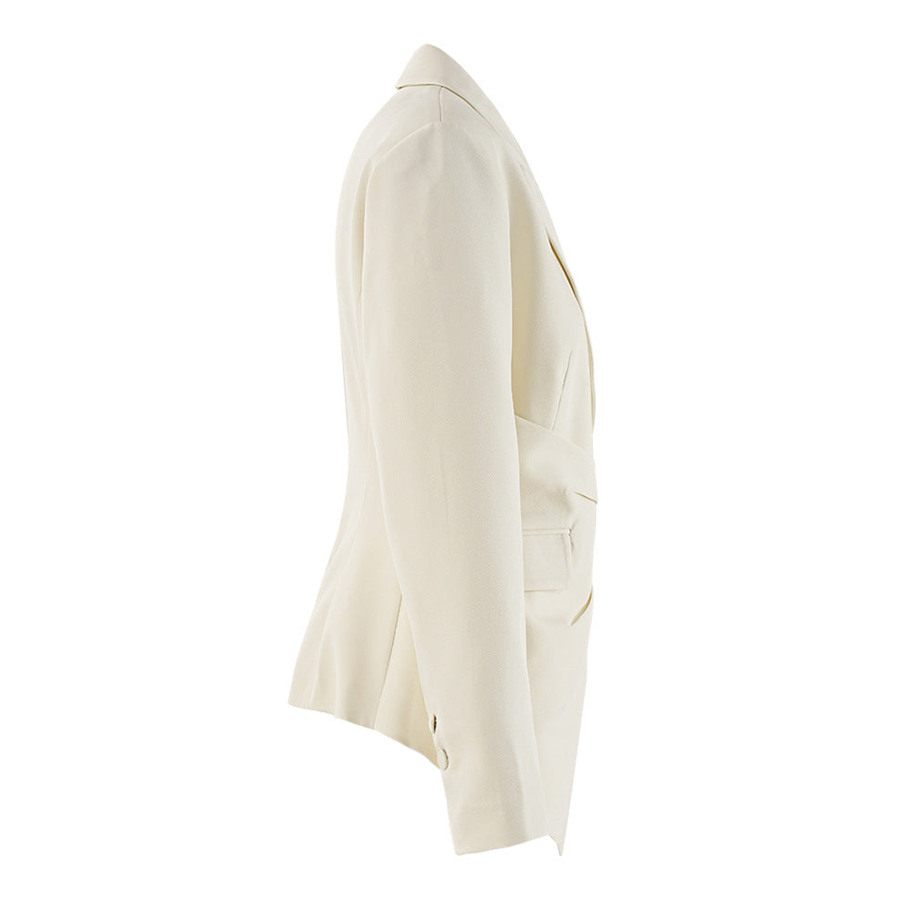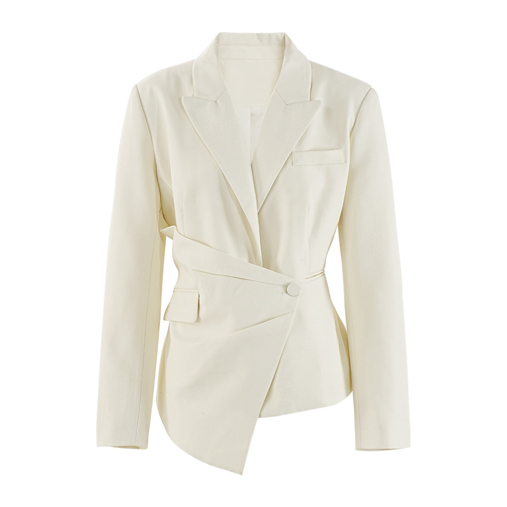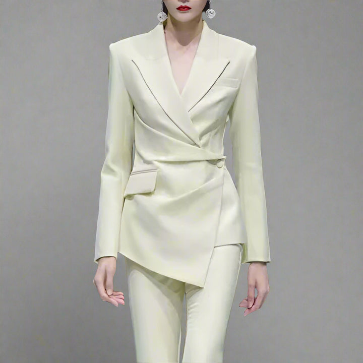 تتميز هذه السترة الأنيقة والعصرية بقصّة غير متماثلة لافتة، مما يضفي عليها مظهرًا أنيقًا وعصريًا. صُممت بحزام عند الخصر، مما يُبرز جمالها ويضيف لمسة عصرية إلى القطعة الكلاسيكية. يُبرز تصميمها المُفصّل وياقتها الحادة أناقتها، بينما تُضفي تفاصيل تصميمها الفريدة لمسةً مميزة. مثالية للمناسبات الرسمية والسهرات، تُضفي هذه السترة لمسةً من التنوع والأناقة، مما يجعلها إضافةً أساسيةً لأي خزانة ملابس تجمع بين الأناقة واللمسة العصرية.