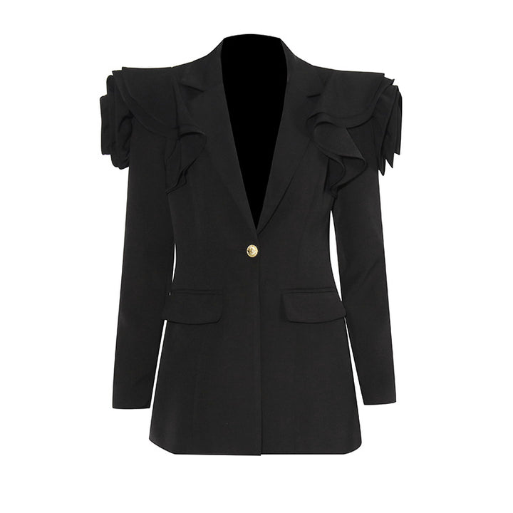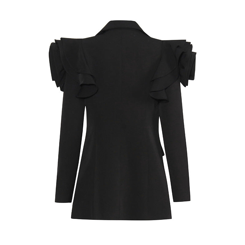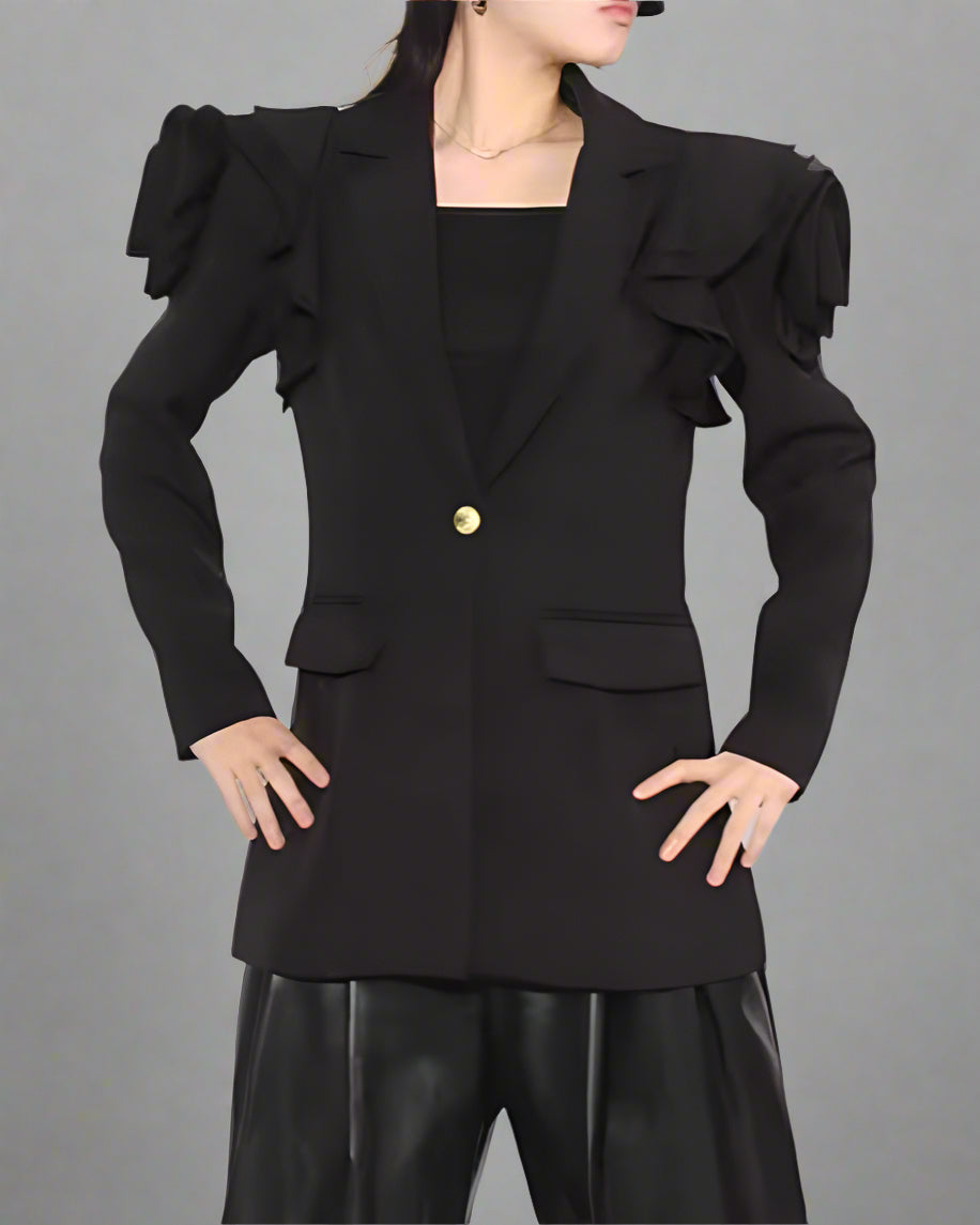 هذه السترة السوداء الأنيقة تتميز بتصميم جريء مع أكتاف مكشكشة جذابة، مما يضفي لمسة أنثوية على تصميمها الكلاسيكي. الخياطة الدقيقة والخطوط الانسيابية تضفي لمسةً أنيقة، بينما تُضفي الكشكشة المميزة لمسةً من الأناقة على الإطلالة، مما يجعلها مثالية لمن يبحثن عن إطلالة أنيقة. تتميز هذه السترة بزر ذهبي واحد للإغلاق، وتمزج بسلاسة بين سحر العمل والذوق العصري. مثالية للمكتب والمناسبات المسائية، حيث تضفي لمسةً أنيقةً وجريئة على أي إطلالة.