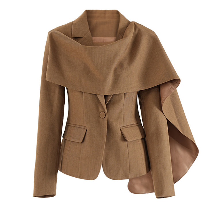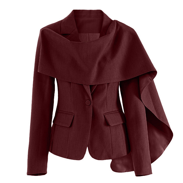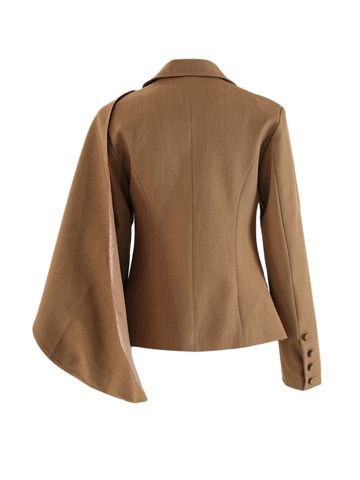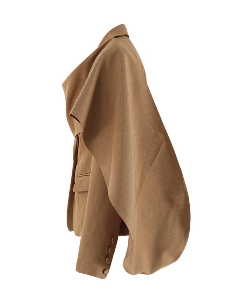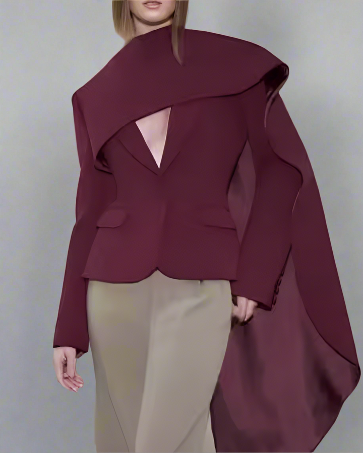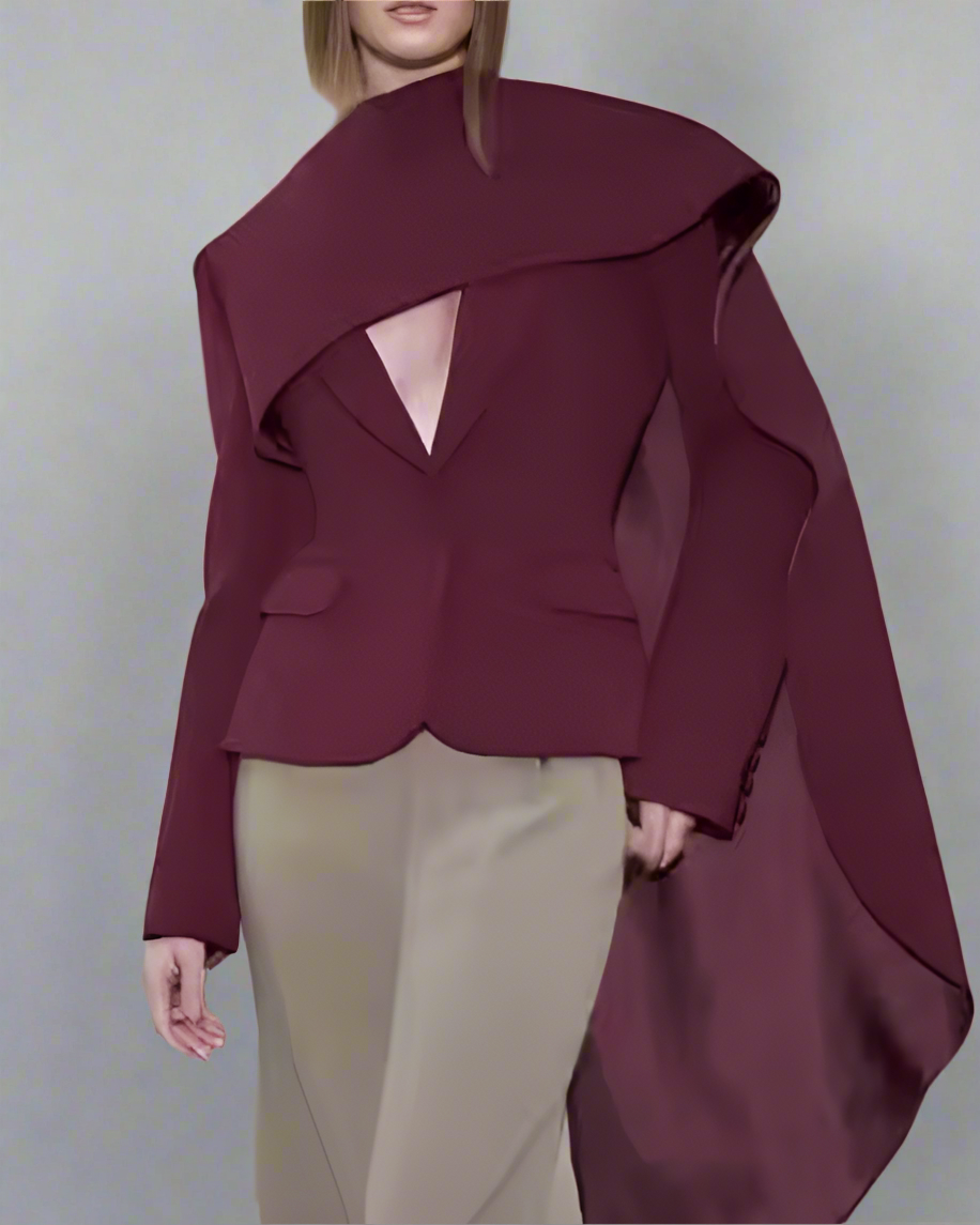 يمزج هذا البليزر المُفصّل بين الرقي الكلاسيكي واللمسة الجريئة، مزينًا بتفاصيل عباءة أنيقة تتدلى من الكتفين. يتكامل تصميم البليزر المُحكم مع القماش المتدفق، مما يُضفي تباينًا أنيقًا يرتقي بهذه القطعة إلى آفاق جديدة. تُضفي الخطوط الأنيقة والياقات الكلاسيكية المُسنّنة لمسةً عصريةً خالدةً، بينما يُضفي العباءة لمسةً عصريةً وجريئة. يتوفر هذا البليزر بألوان غنية كالبرغندي والبني الفاتح، وهو مثالي للمناسبات الرسمية والمسائية على حد سواء، مما يجعله قطعةً مميزةً لمن يبحثن عن الجمع بين الأناقة القوية والأناقة الراقية.