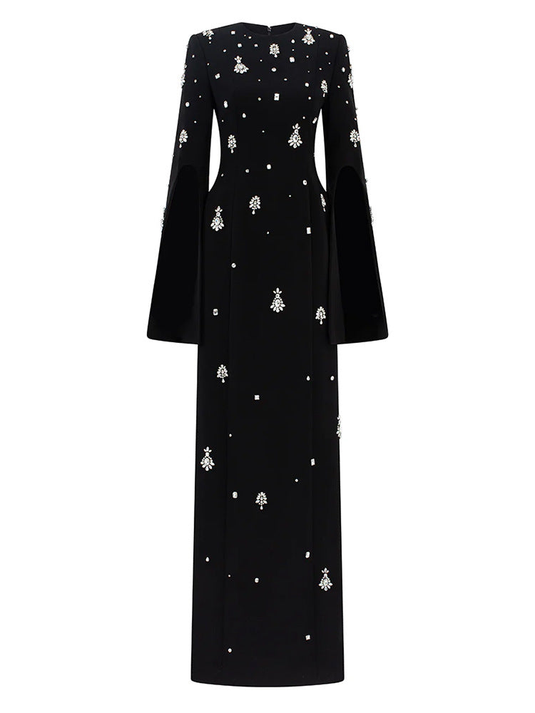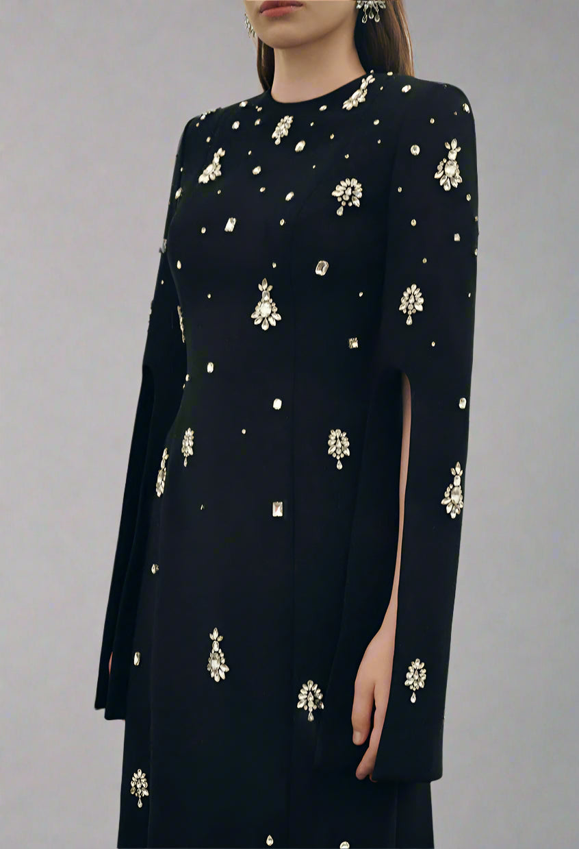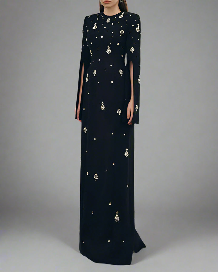 هذا الفستان يمثل مزيجًا رائعًا من الأناقة والتطور الحديث. يتميز هذا الفستان الأنيق بطول الأرضية بتطريز معقد على القماش، مما يضيف لمسة من البريق والفخامة. أكمامه الطويلة التي تشبه الكاب تجعله خيارًا مثاليًا للمناسبات الرسمية أو الاستقبالات. اللون الأسود الأساسي يتباين بشكل جميل مع الخرز والكريستالات الدقيقة، مما يمنحه جاذبية خالدة. مثالي لمظهر جريء وأنيق في نفس الوقت.