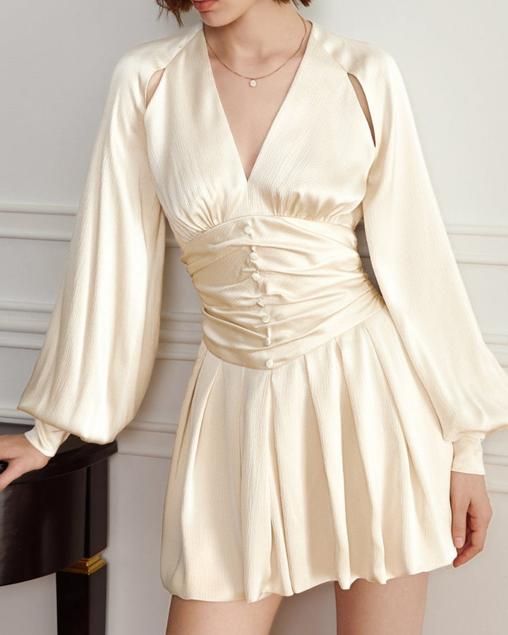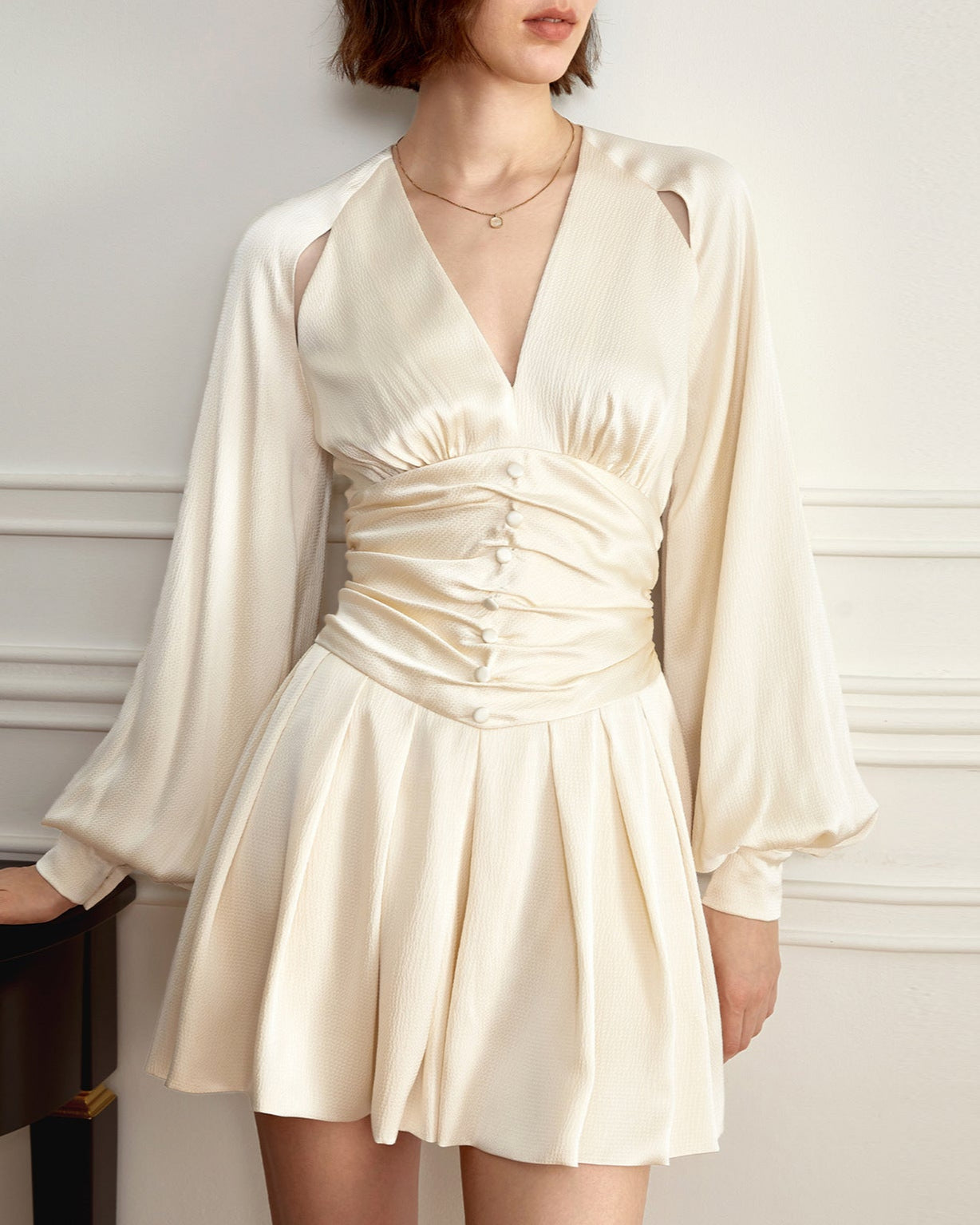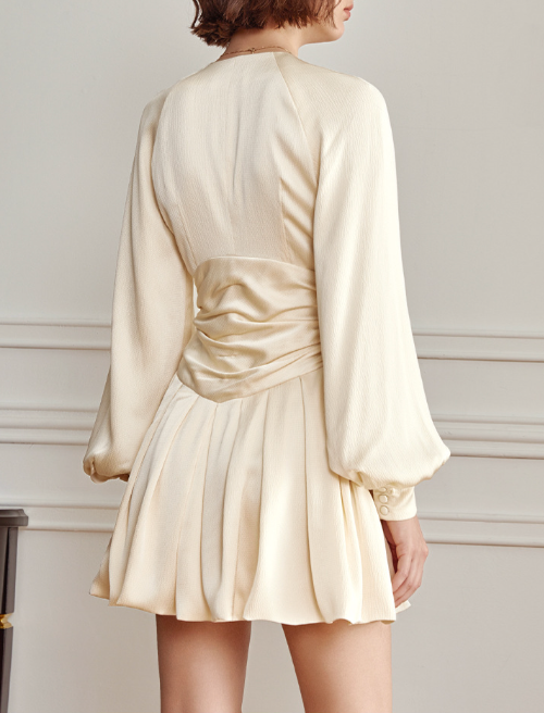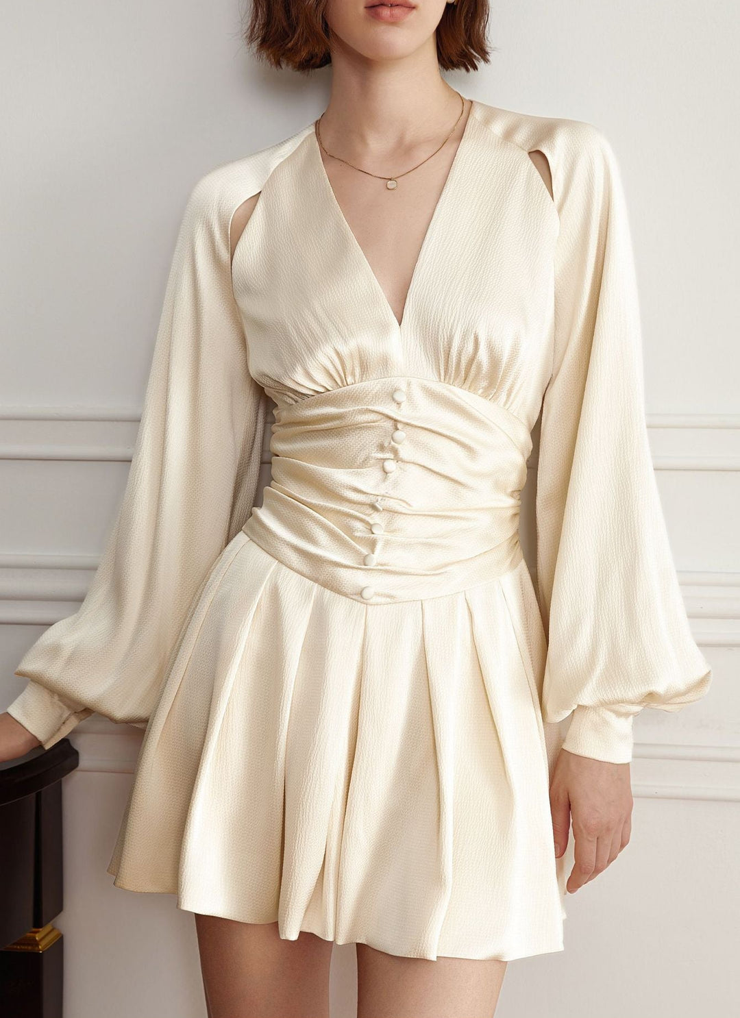 فستان قصير أنيق يتميز برقبة على شكل V وتفاصيل كشكش أنيقة عند الخصر لمظهر أنيق. تضيف الأكمام المنتفخة لمسة من الفخامة، بينما يضيف القماش الناعم لمسة من الأناقة. مثالي لمظهر مسائي راقي أو مناسبة خاصة.