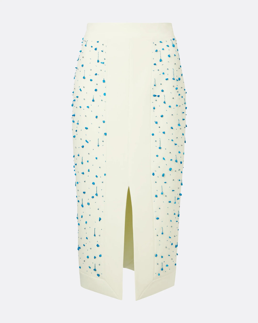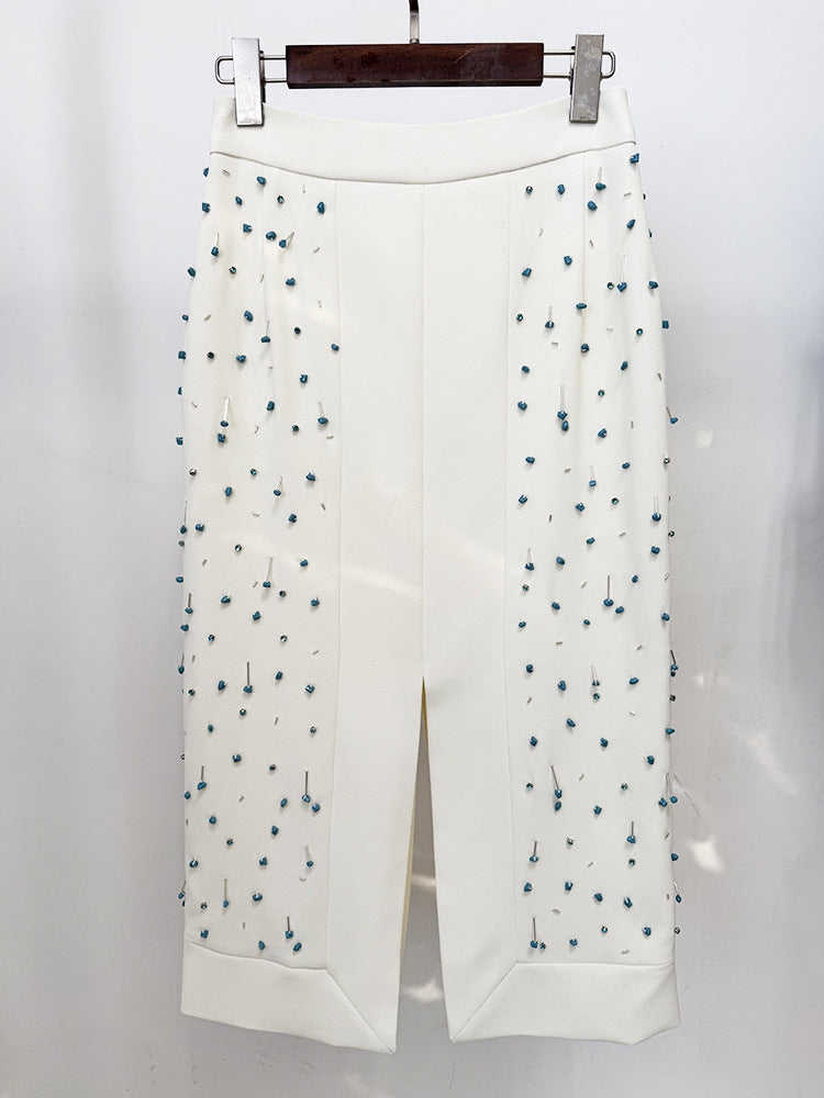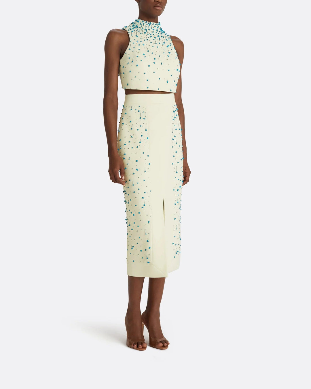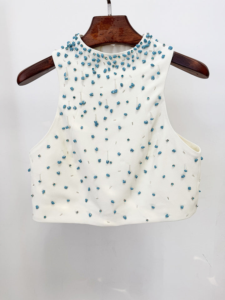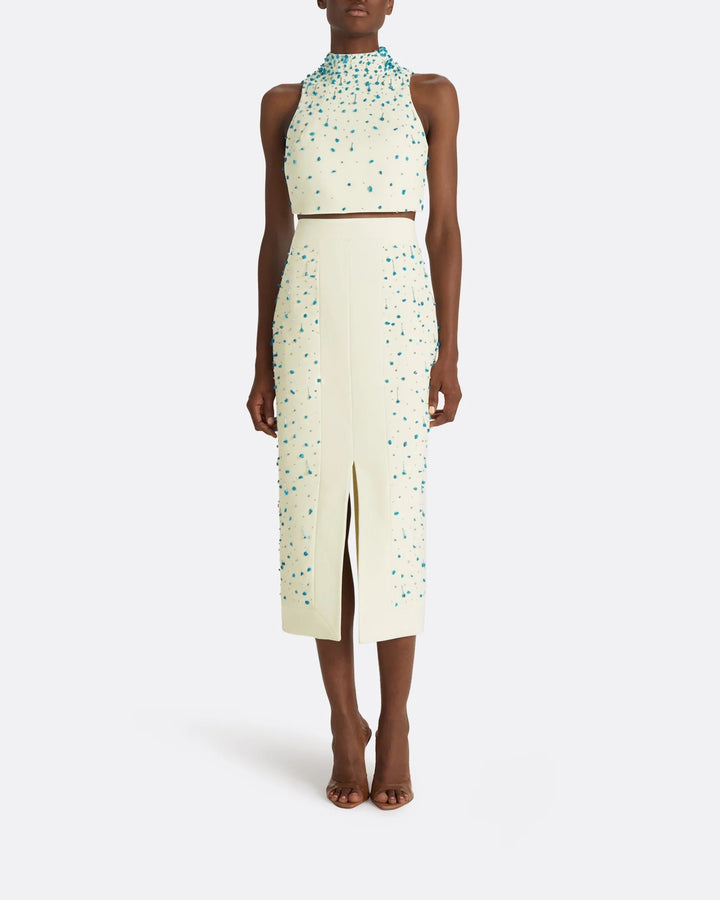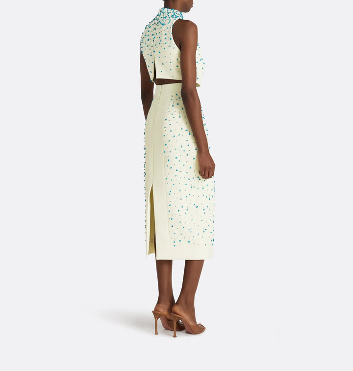 أنيق، عصري، ومزخرف بشكل دقيق — هذا الطقم المكون من قطعتين طقم هو تجسيد للترف المكرر. يتم تنسيق بلوزة قصيرة بلا أكمام ذات رقبة عالية مع تنورة ميدي بخصر عالي، كلاهما مصنوع بلون العاج الناعم ومزخرف بتطريزات خرز تركوازية متدلية. تضيف التفاصيل المعقدة ملمسًا وبريقًا، بينما تقدم فتحة التنورة الأمامية لمحة من الجاذبية. مثالي للسهرات المعاصرة، العشاء الفني، أو المناسبات الصيفية الراقية.