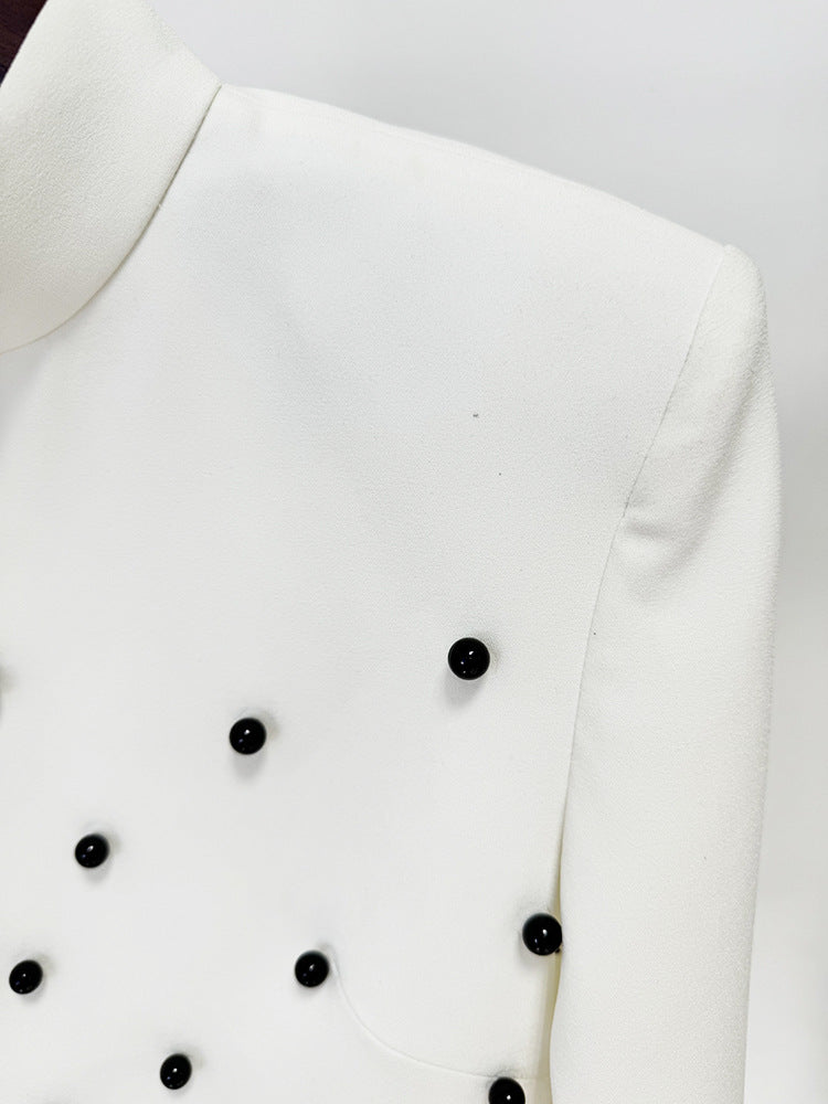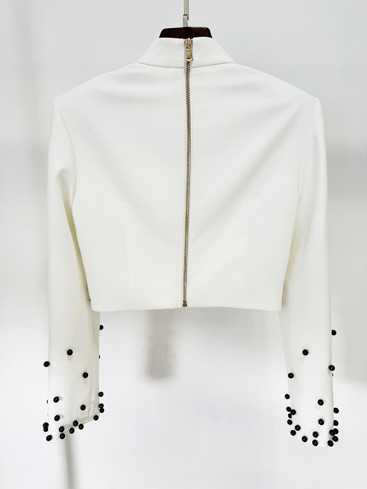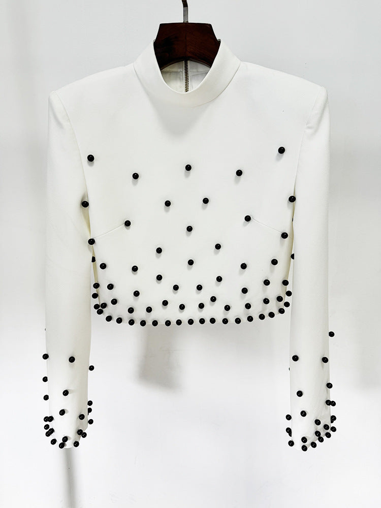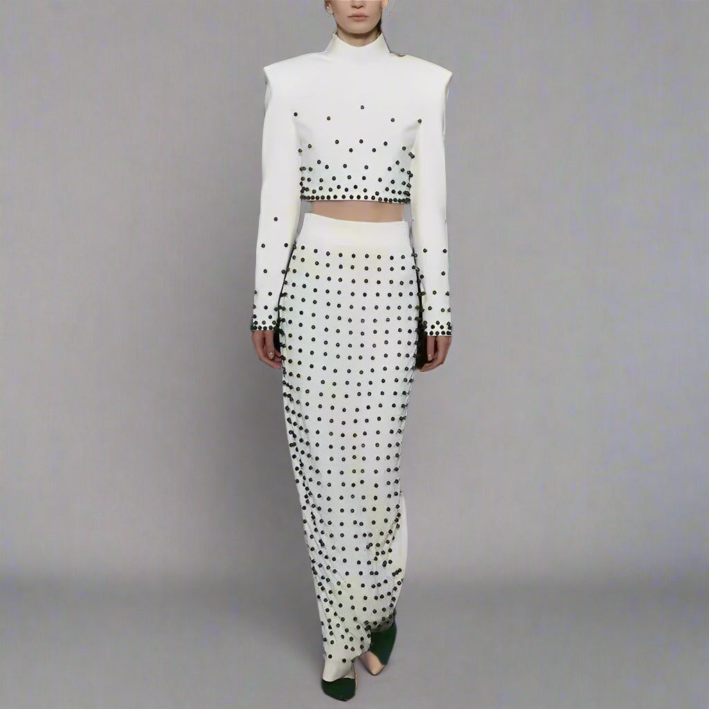 ملفت للنظر ومنظم، هذا الزي المكون من قطعتين طقم يمزج بين التفصيل الحاد والزينة الحديثة. يتميز الجزء العلوي الأبيض النقي بوسادات كتف مبالغ فيها وياقة عالية للحصول على صورة ظلية قوية، بينما التنورة العمودية ذات الخصر العالي المتطابقة مزينة بمسامير سوداء موضوعة بعناية لخلق تأثير أنيق ومطول. أنيق بحافة مستقبلية، هذا المظهر مثالي للأمسيات العصرية، أو لحظات المدرج، أو المناسبات اللافتة للنظر.