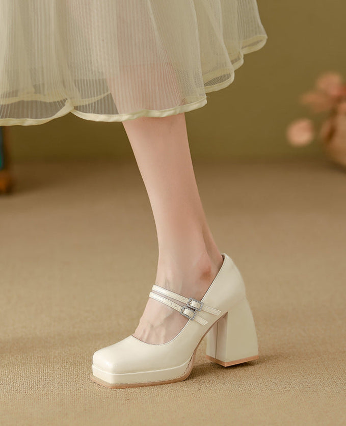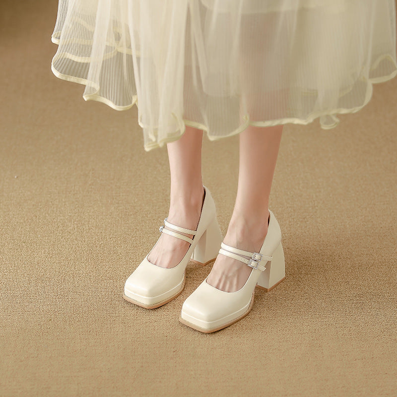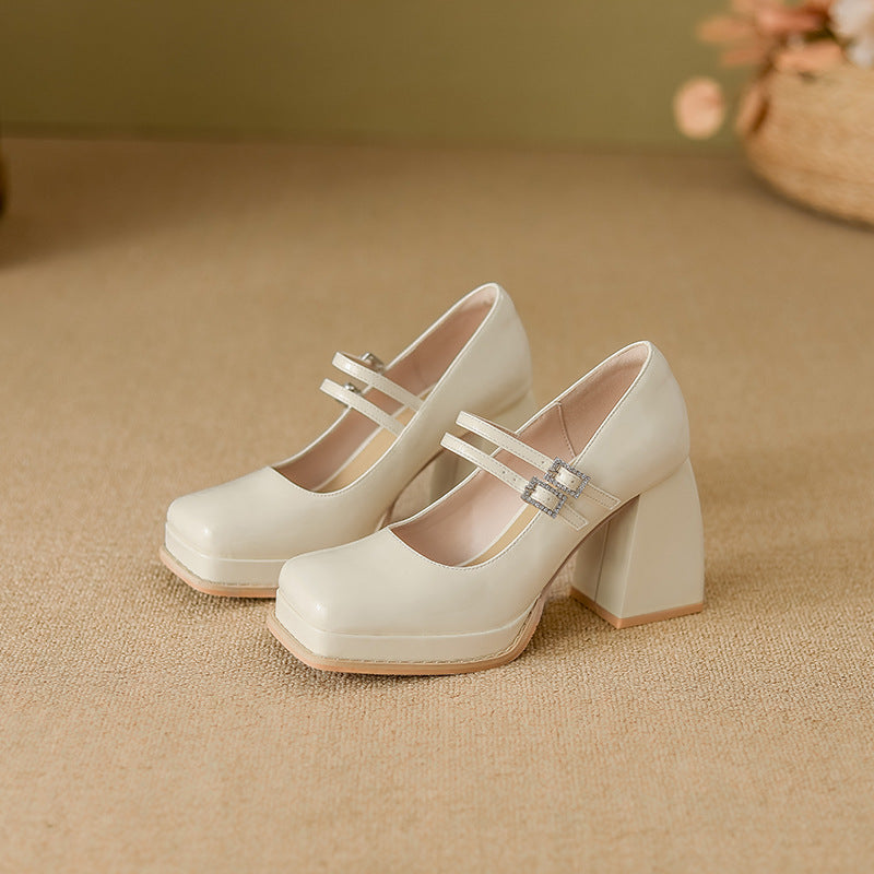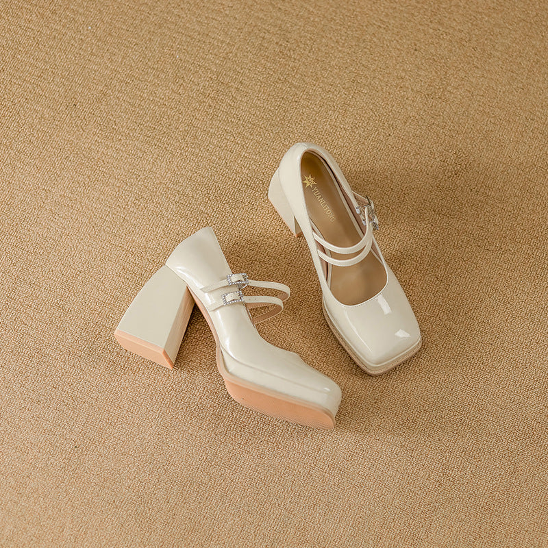 حذاء بكعب عريض أنيق، يتميز بنعل عصري، ومقدمة مستديرة، وحزام مزدوج بإبزيم معدني. مزيج أنيق من سحر الماضي وأناقة العصر.