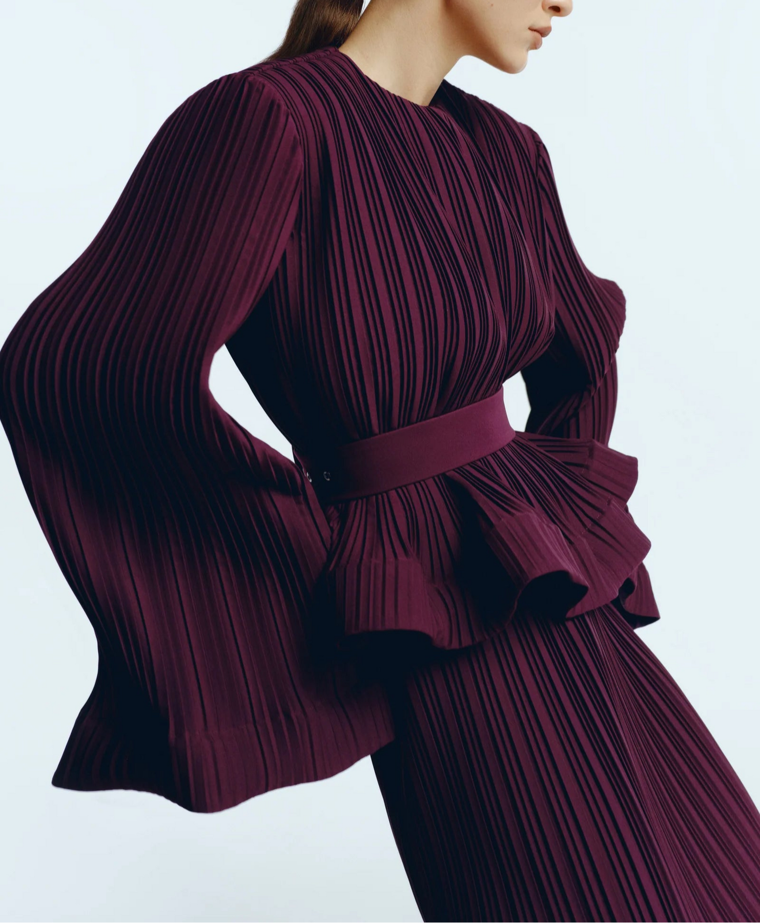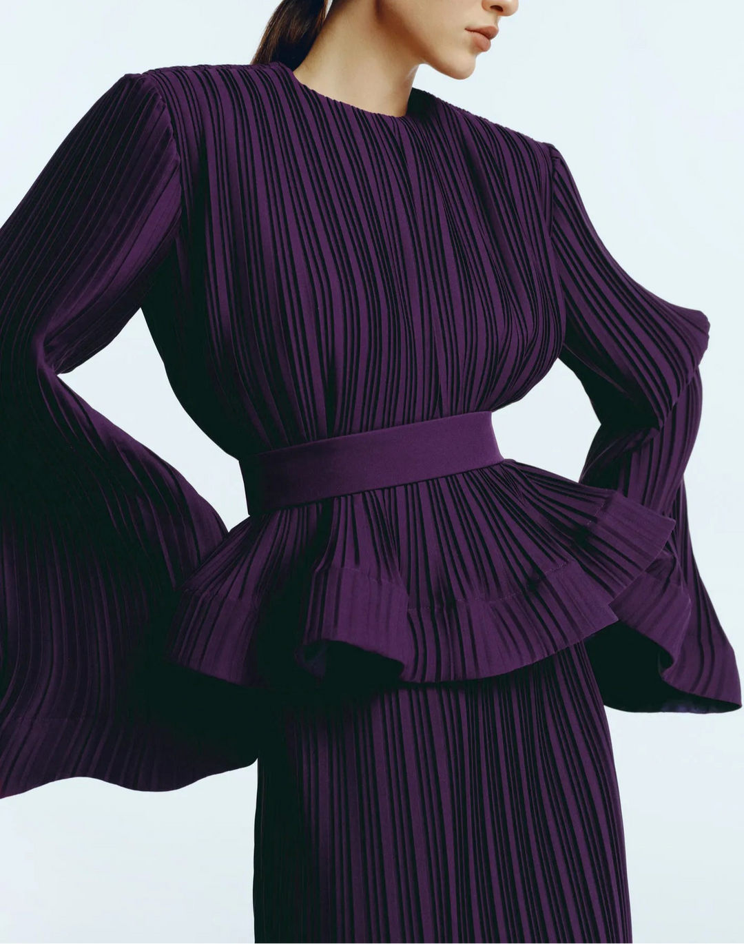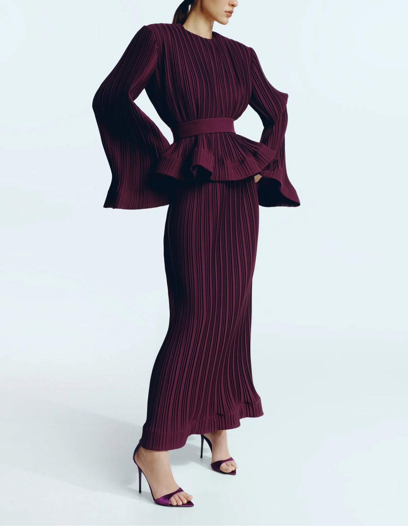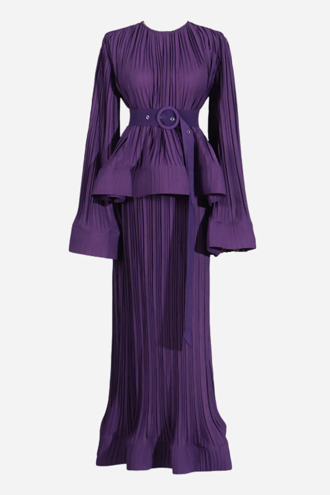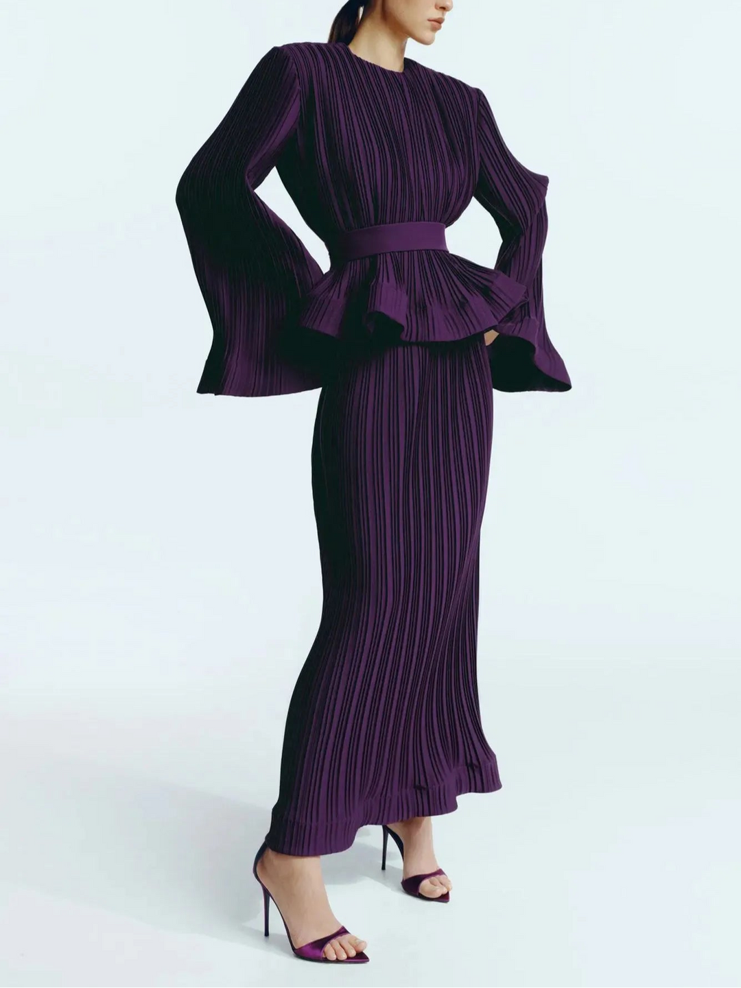 هذا الطقم الأنيق المكون من قطعتين طقم يتميز بنسيج غني مطوي، يجمع بين الراحة والأناقة. تم تصميم الجزء العلوي بأكمام واسعة مريحة وياقة دائرية، مزينة بحزام مطابق عند الخصر لتسليط الضوء على شكل الفستان. تنساب التنورة الطويلة المطابقة بسلاسة إلى الأرض، مما يخلق مظهراً أنيقاً وعصرياً، مثالي للمناسبات الرسمية أو الفعاليات الأنيقة.