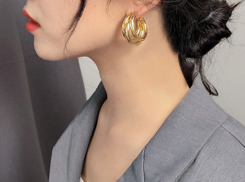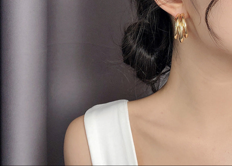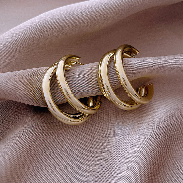 تتميز هذه الأقراط الأنيقة ذات الحلقات الثلاثية بتصميم جريء متعدد الطبقات بلمسة نهائية ذهبية مصقولة، مما يجعلها قطعة مميزة بلمسة عصرية. تمنح الحلقات المتشابكة حجمًا وأبعادًا، مثالية للارتقاء بإطلالاتك اليومية ومجموعات السهرة. خفيفة الوزن وآمنة، تجمع بين الرقي والسحر العصري.