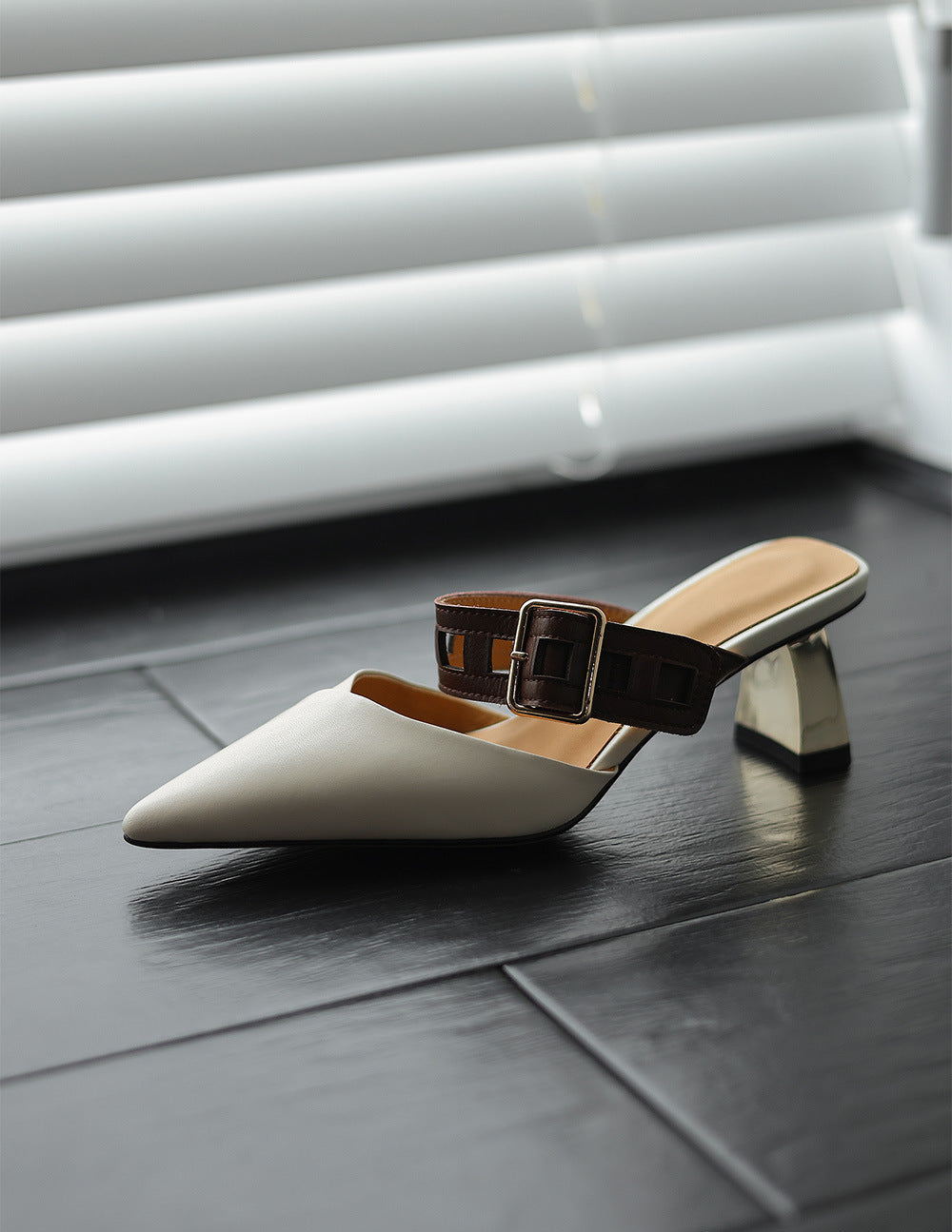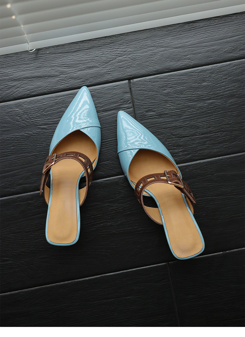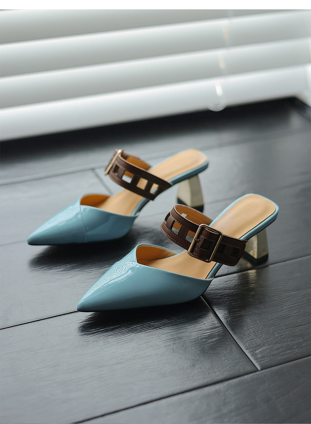 حذاء ميول أنيق بمقدمة مدببة وحزام بني جريء وكعب عريض عصري بلمسة نهائية لامعة. مزيج أنيق من الأناقة والراحة.