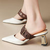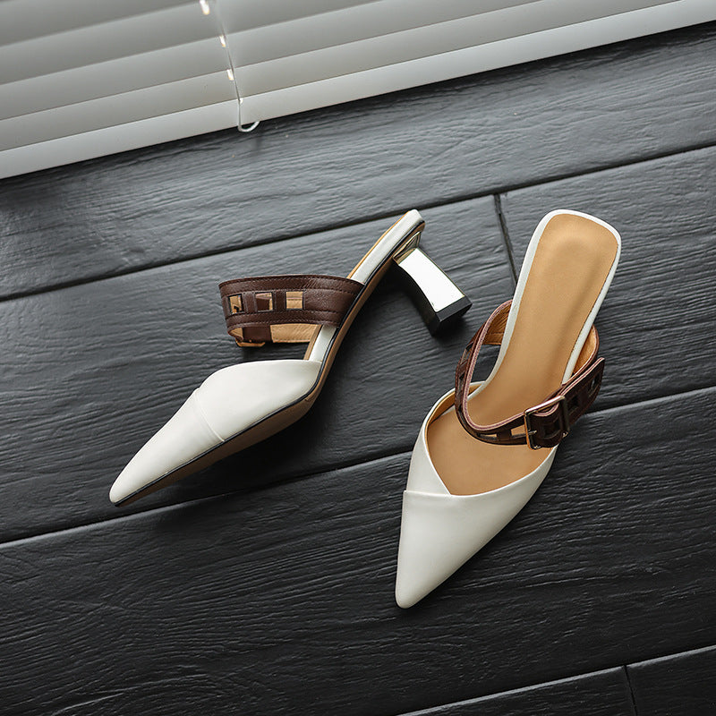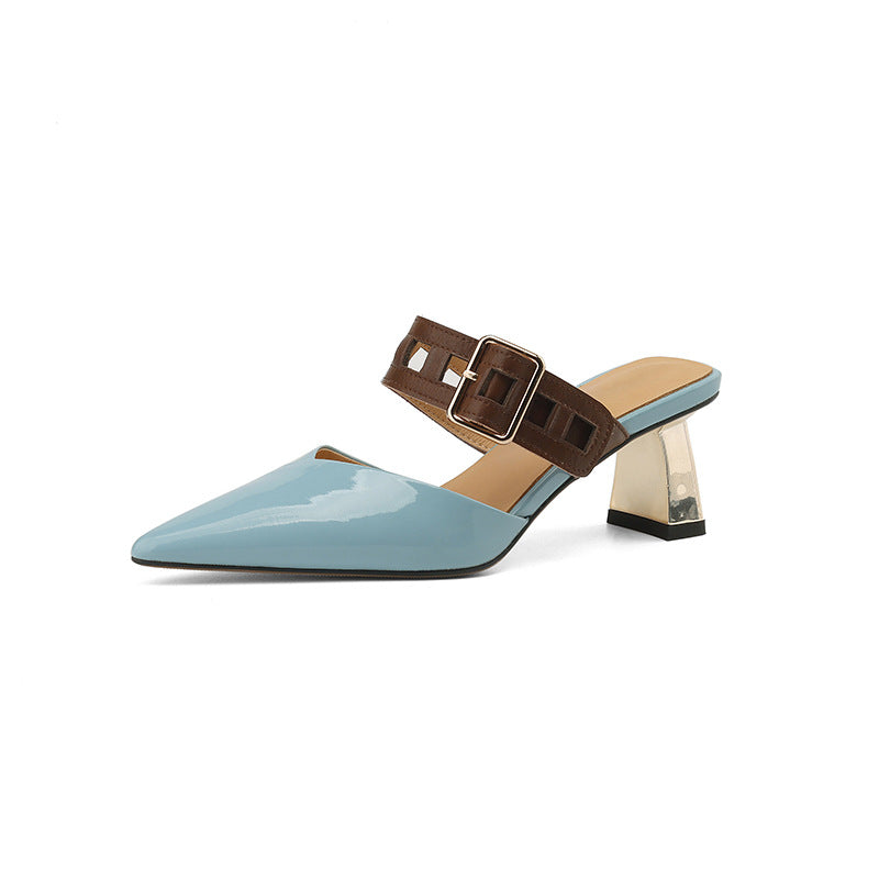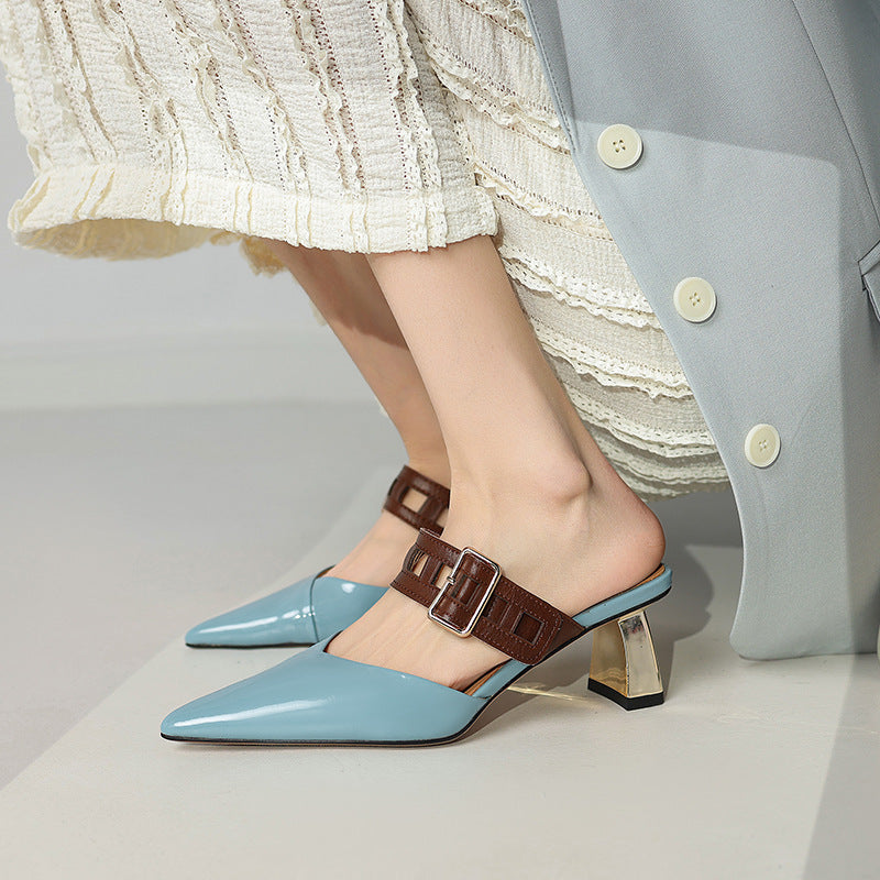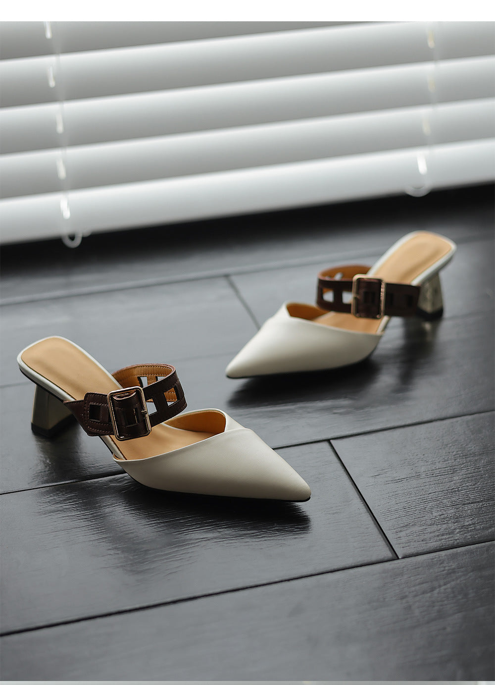 حذاء ميول أنيق بمقدمة مدببة وحزام بني جريء وكعب عريض عصري بلمسة نهائية لامعة. مزيج أنيق من الأناقة والراحة.