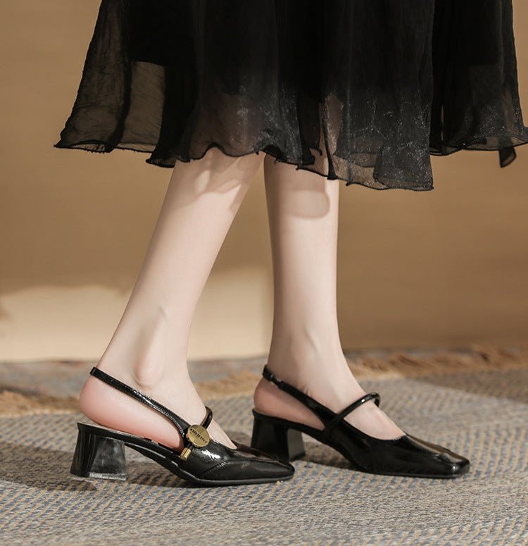 حذاء أنيق مفتوح الأصابع بلمسة نهائية لامعة، ومقدمة مربعة، وحزام معدني أنيق مرصع بمسامير. صُمم بكعب منخفض وعريض لراحة لا مثيل لها، يجمع بين الأناقة الخالدة واللمسة العصرية.